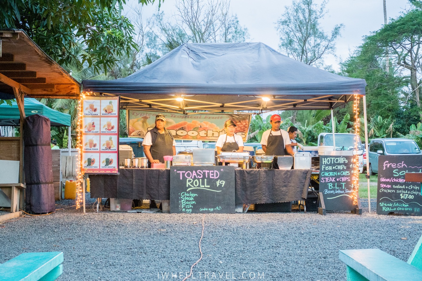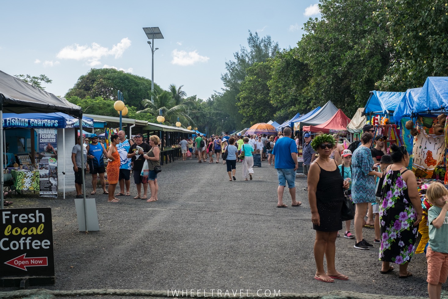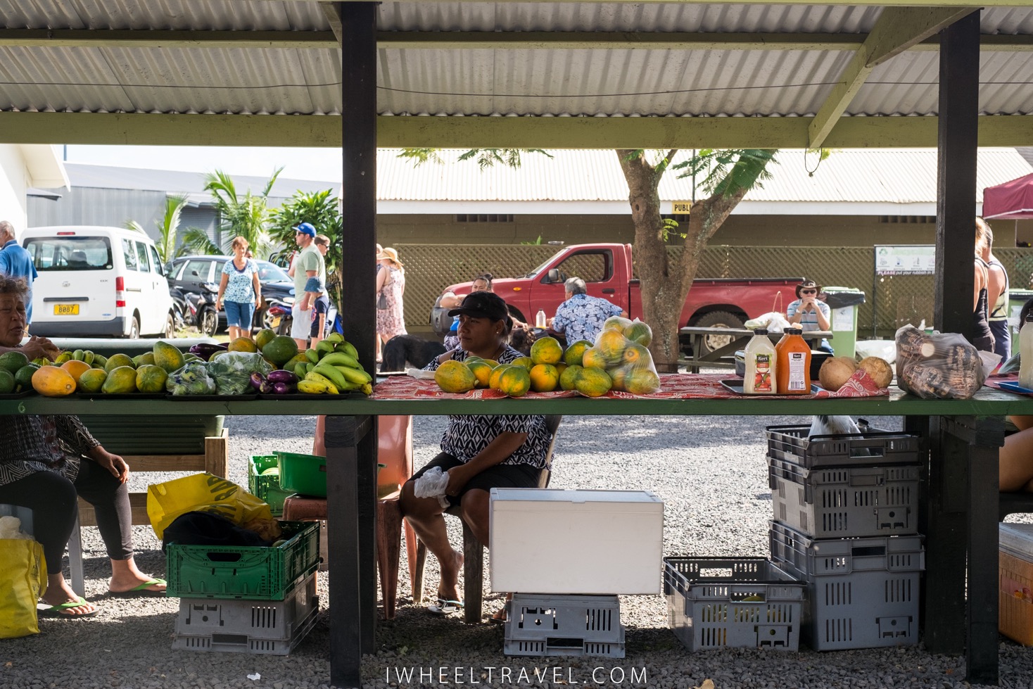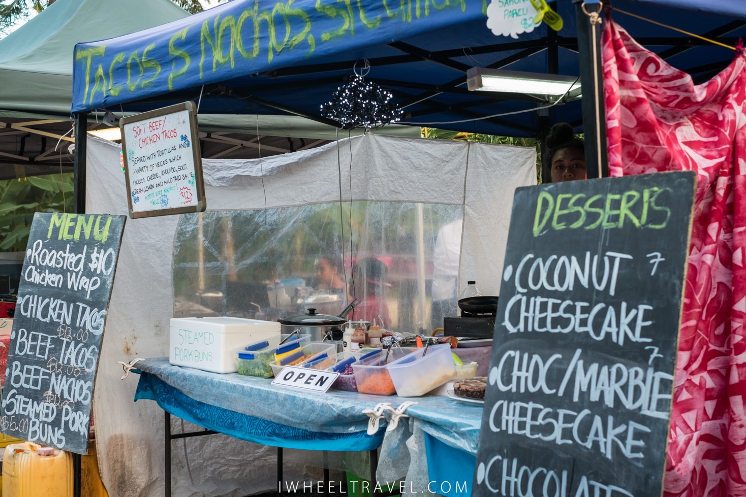 Deux marchés se tiennent régulièrement à Rarotonga. Le Muri Night Market a lieu tous les mardi, mercredi, jeudi et dimanche soirs de 17h à 21h. Sur ce marché on trouve pleins de stands de nourriture locale ou pas : fruits, curry de poissons, plat de poisson cru, calamars, tacos, poulet cajun, smoothies, cheesecakes… le tout dans une ambiance très années 70/80, au son du synthé à déguster son curry sur une chaise en plastique. Un peu de nostalgie de temps en temps ça ne fait pas de mal ! Si vous voulez faire un bon geste pour l’environnement vous pouvez louer assiette et couverts pour 2$NZ auprès des enfants d’une association scolaire. Moins de plastique et un coup de pouce pour le système d’éducation local : une double bonne action !