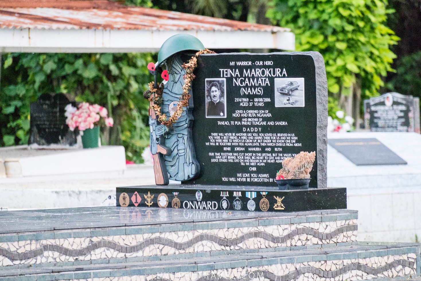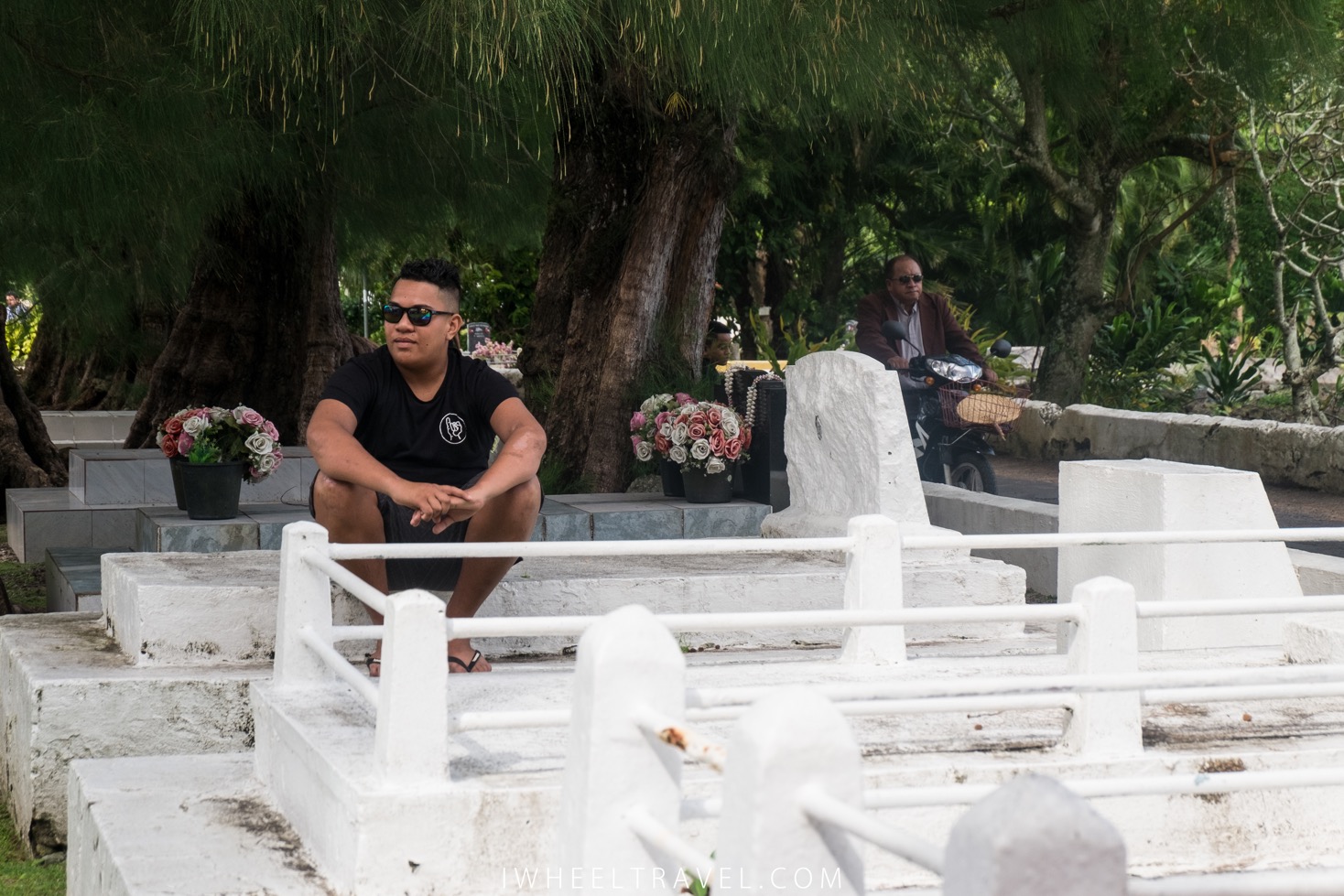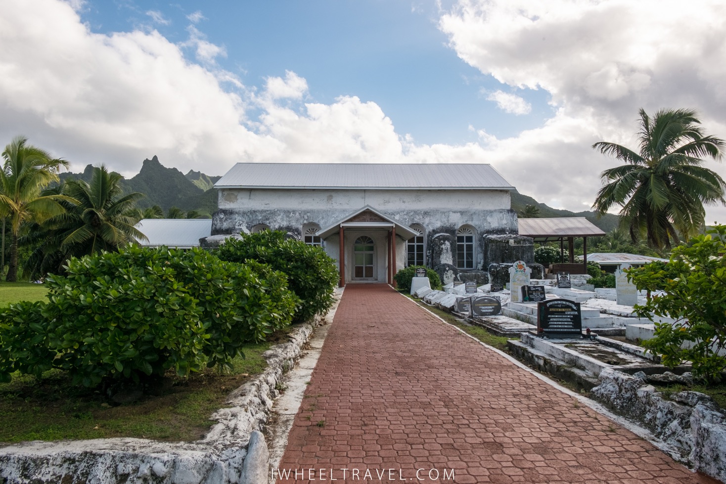 Il y a des cimetières autour de ces églises et il y a aussi de nombreuses sépultures un peu partout près des maisons. Les natifs de Rarotonga peuvent décider s’ils veulent être enterrés au cimetière ou sur leurs terres. Très souvent ils choisissent d’être enterrés sur leur propriété, auprès de leurs proches. Il y a donc de nombreuses tombes dans les jardins. Dans certaines cultures, on pourrait trouver cela bizarre et triste de voir la sépulture de ses parents depuis le salon mais aux iles Cook ce n’est pas du tout un problème. La sépulture est bien évidemment très respectée mais cela n’empêche que l’on puisse s’y asseoir et que les enfants puissent jouer dessus.