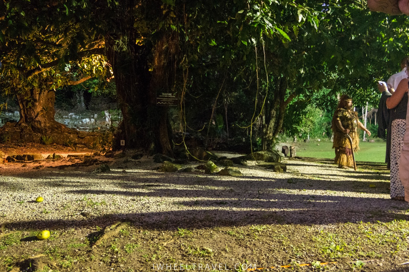 J’ai trouvé la visite du « village » assez décevante surtout en comparaison avec ce qui se fait en Nouvelle-Zélande dans les villages maoris. En réalité c’est plus une petite balade à l’extérieur pendant laquelle quelques éléments de la culture des tribus cookiennes sont expliqués. On apprend notamment quelle est l’utilité des différents fruits et arbres poussant aux environs et l’on découvre les légendes de la découverte de la Nouvelle-Zélande par les maoris des iles Cook. Le plus intéressant a été de découvrir que leurs Maraes sont différents de ceux de Nouvelle-Zélande. Dans les deux cultures le Marae a la même fonction : c’est un lieu de rassemblement au caractère religieux et sacré. Par contre leur matérialisation est très différente : en Nouvelle-Zélande il s’agit d’un bâtiment en bois avec de nombreuses gravures alors qu’aux iles Cook il s’agit d’un arbre imposant entouré d’un espace permettant d’accueillir quelques personnes. Seuls les hommes les plus importants de la tribus tels que le chef et les meilleurs guerriers peuvent y entrer. Les femmes n’ont pas le droit d’y entrer à l’exception de la matriarche.