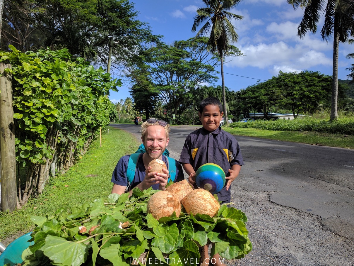 Franck avec notre première noix de coco et le garçon à qui nous l’avons achetée au bord de la route.