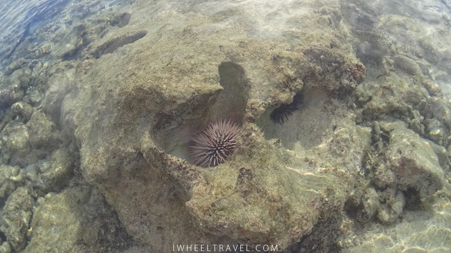Allons plutôt nous équiper de notre masque-tuba, revêtir nos chaussons de plongée et partons à la découverte du monde sous-marin. C’était la première fois que je faisais du snorkelling et j’en ai pris plein les yeux !  Il y a beaucoup de vie autour et dans les coraux. Nous y avons vu des concombres de mer, des oursins et des poissons de toutes les couleurs et de toutes les tailles! Jaune, noir, bleu, blanc, rose, rouge… Malheureusement la caméra n’a pas bien fonctionné sous l’eau alors je ne peux pas vous montrer tous ces beaux poissons tropicaux mais voila un petit aperçu de la vie sous-marine avec cet oursin !