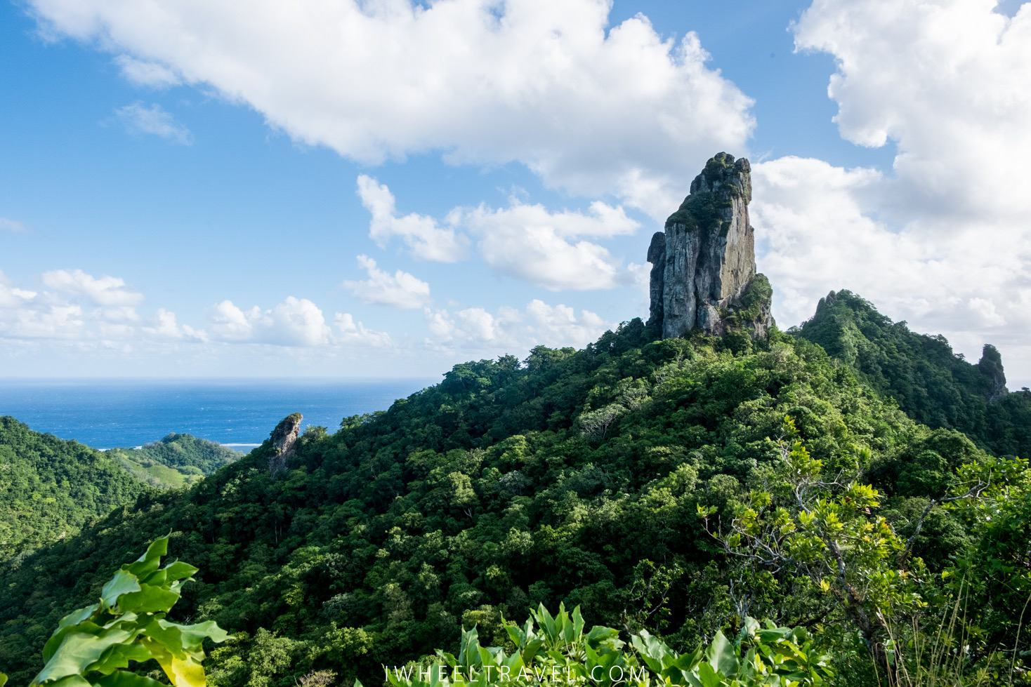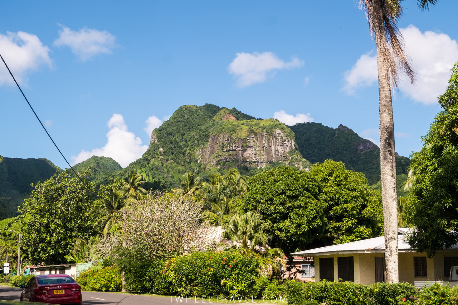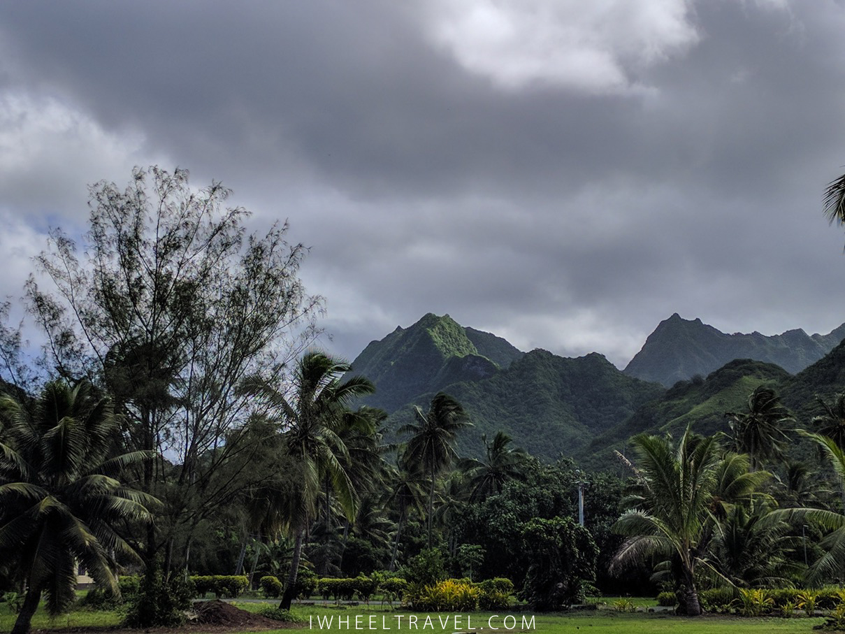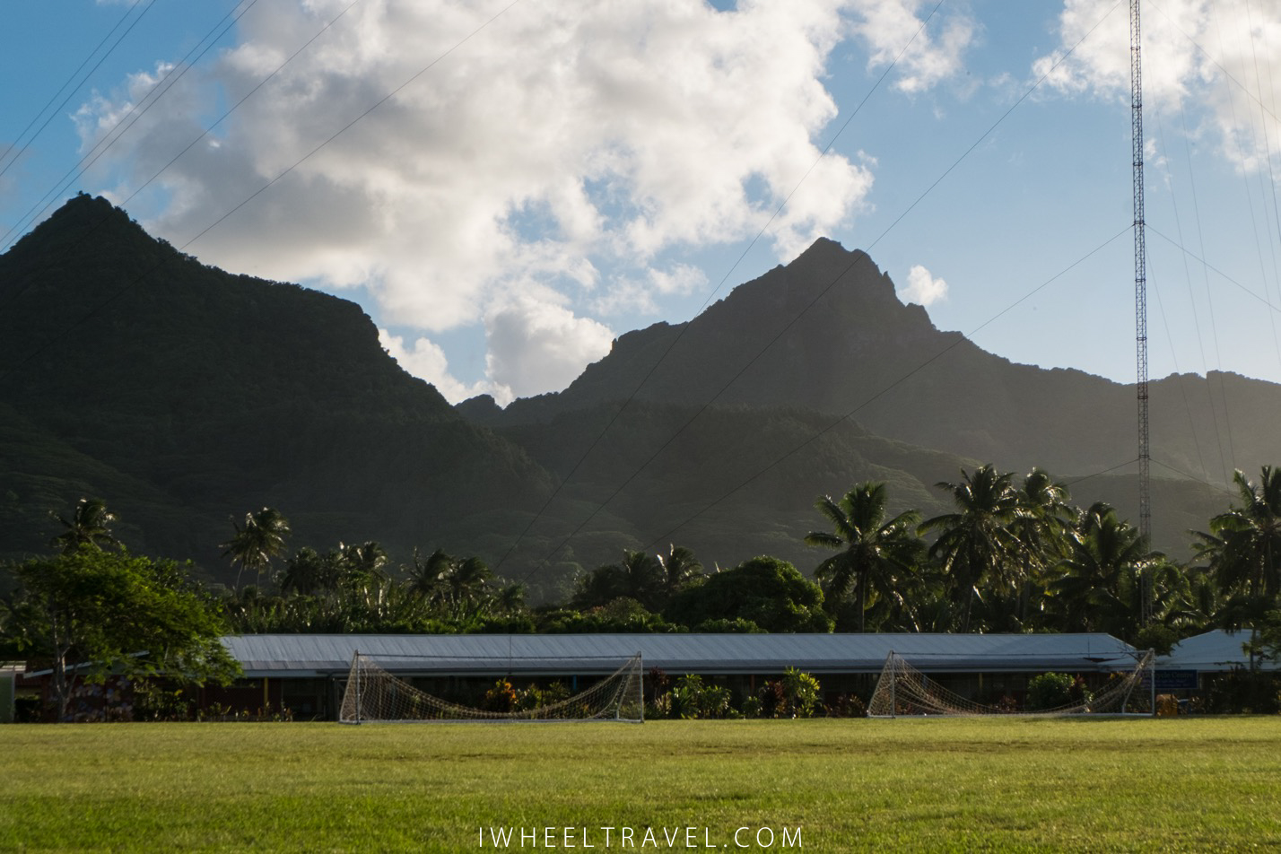 Le centre de l’ile est montagneux puisqu’il s’agit d’une ile volcanique. Les reliefs sont vraiment beaux. Le plus haut sommet, le pic Te Manga, culmine à seulement 653 mètres mais il se dégage de ces reliefs une réelle beauté. Une beauté sauvage. La crête des sommets semble déchirer le ciel alors que la forêt apparait si calme et mystérieuse. Ni routes ni habitations ne sont visibles. La végétation est dense. Il n’y a que très peu d’endroits on l’on peut distinguer la roche. Des palmiers dépassent un peu partout.
