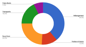 Étudions ce budget plus en détail. Comme très souvent, c’est l’hébergement qui a constitué la plus grande part de notre budget : 39%. A cela s’ajoutent les dépenses de nourriture (24%), des transports (18%), des visites et activités (12%) et enfin quelques frais divers (7%).