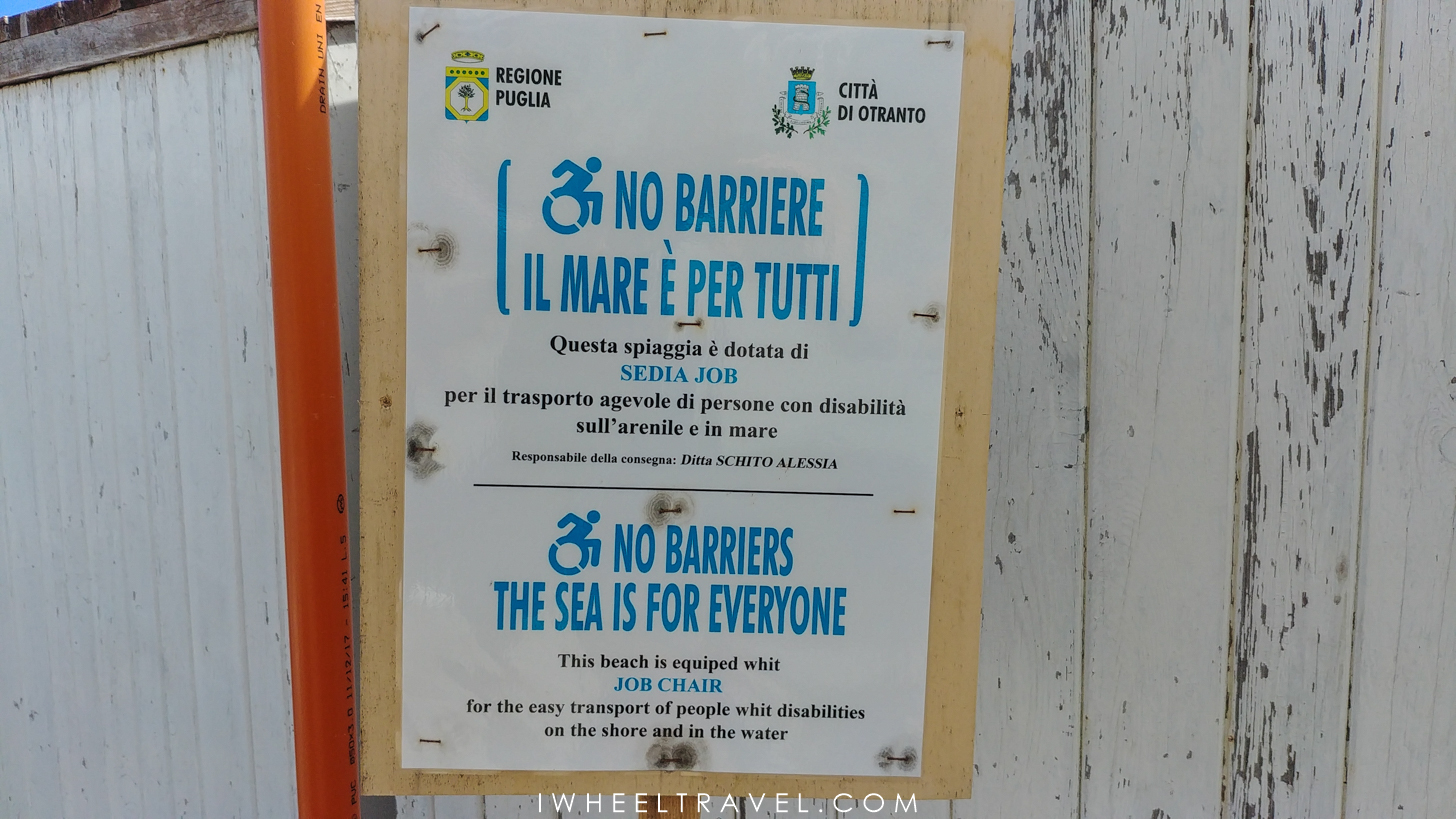 The Italian Adriatic and Ionan coasts are marvellous but it is not really easy to find wheelchair accessible beaches. As often, only a few beaches are fully accessible and equipped for people for reduced mobility. But no worries, even if sometimes we had some hard time finding one, there are wheelchair friendly beaches in Apulia and I must admit, there are more of them than what I thought. Eventually, the most difficult part is to find a free wheelchair accessible beach. Indeed, Italian seem to like private equipped beaches that they call “lidos”. But no worries, here is a list of many beaches I went to, sorted by accessibility grade. Only one is not free.