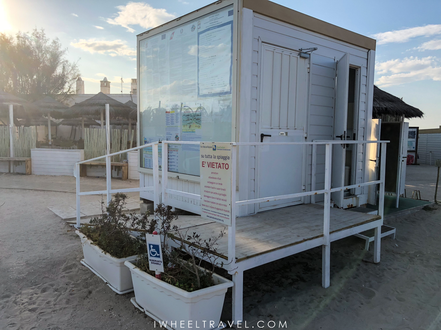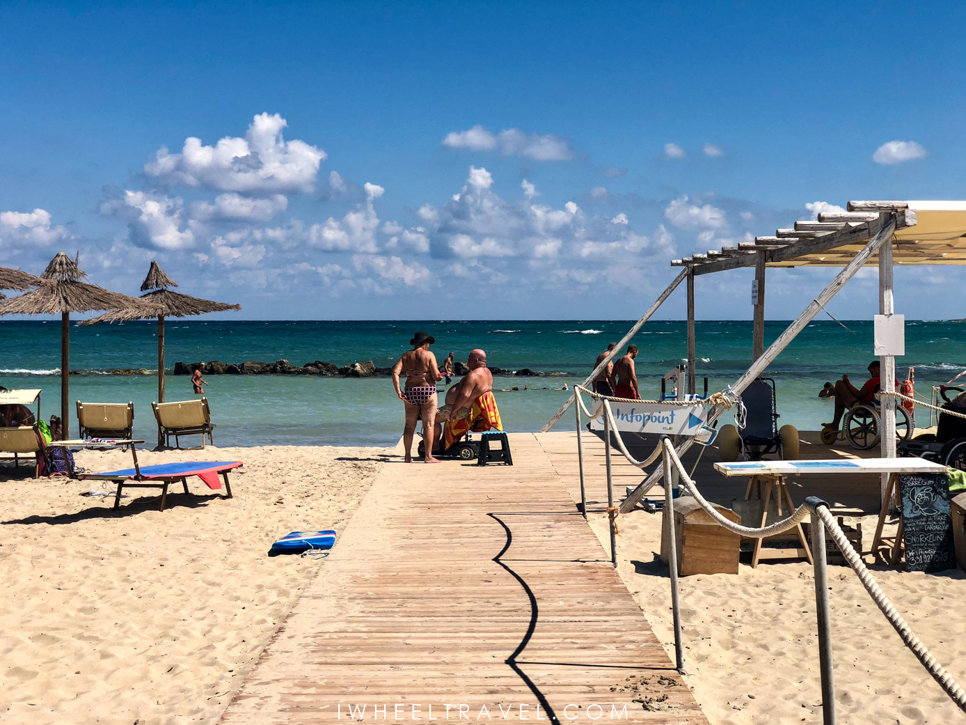 Lido Morelli is the only beach I listed that you have to pay to enjoy. It is a 15 minutes drive from Ostuni so it is a good location to enjoy a sunbath or a swim before or after visiting “the White City”. The lido is equipped with job chairs and a boardwalk leading to the sea (ending less than 10 metres away from it). When Franck and I went at this beach the lifeguard was paying close attention to the needs of disabled people and their caregivers. So feel free to ask the lifeguards for any help. At the lido entrance there is a disabled parking space (do not go in the main parking) and a restrooms for people with reduced mobility but there is 2cm edge which is quite annoying. Beeing in a wheelchair, we don’t have enough space to manoeuvre or build up momentum. Regarding the fees: whatever the time you will spend in Lido Morelli, a day costs 20 euros for two people with two deckchairs and a parasol.