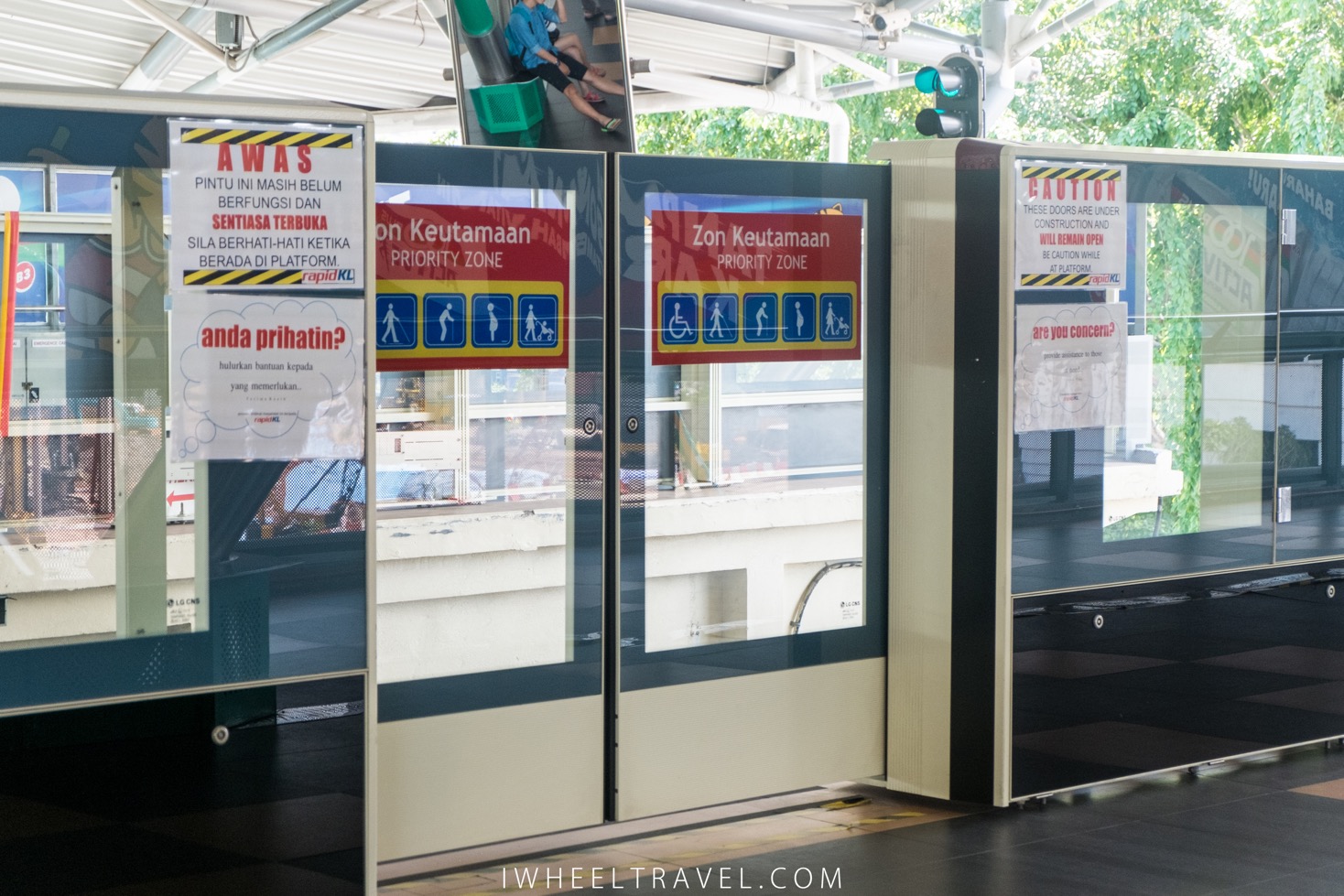 In the train there is plenty of space to park a wheelchair. But even if everything seems well conceived there is still a few things that could have been better. For example there is a large gap between the train and the quay so another person help is needed. Also the disabled restroom on the platform at Batu caves station was closed. Unfortunately this is a recurring problem in Malaysia: during my travel I often faced closed public disabled toilets.