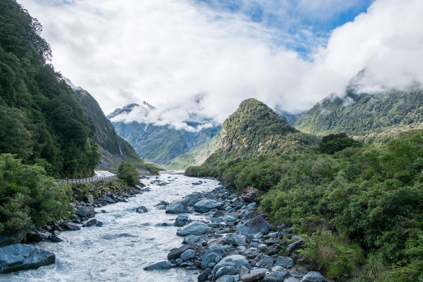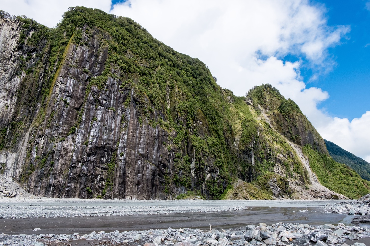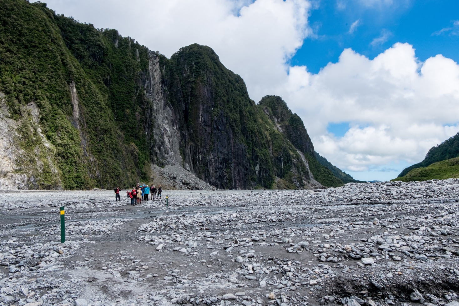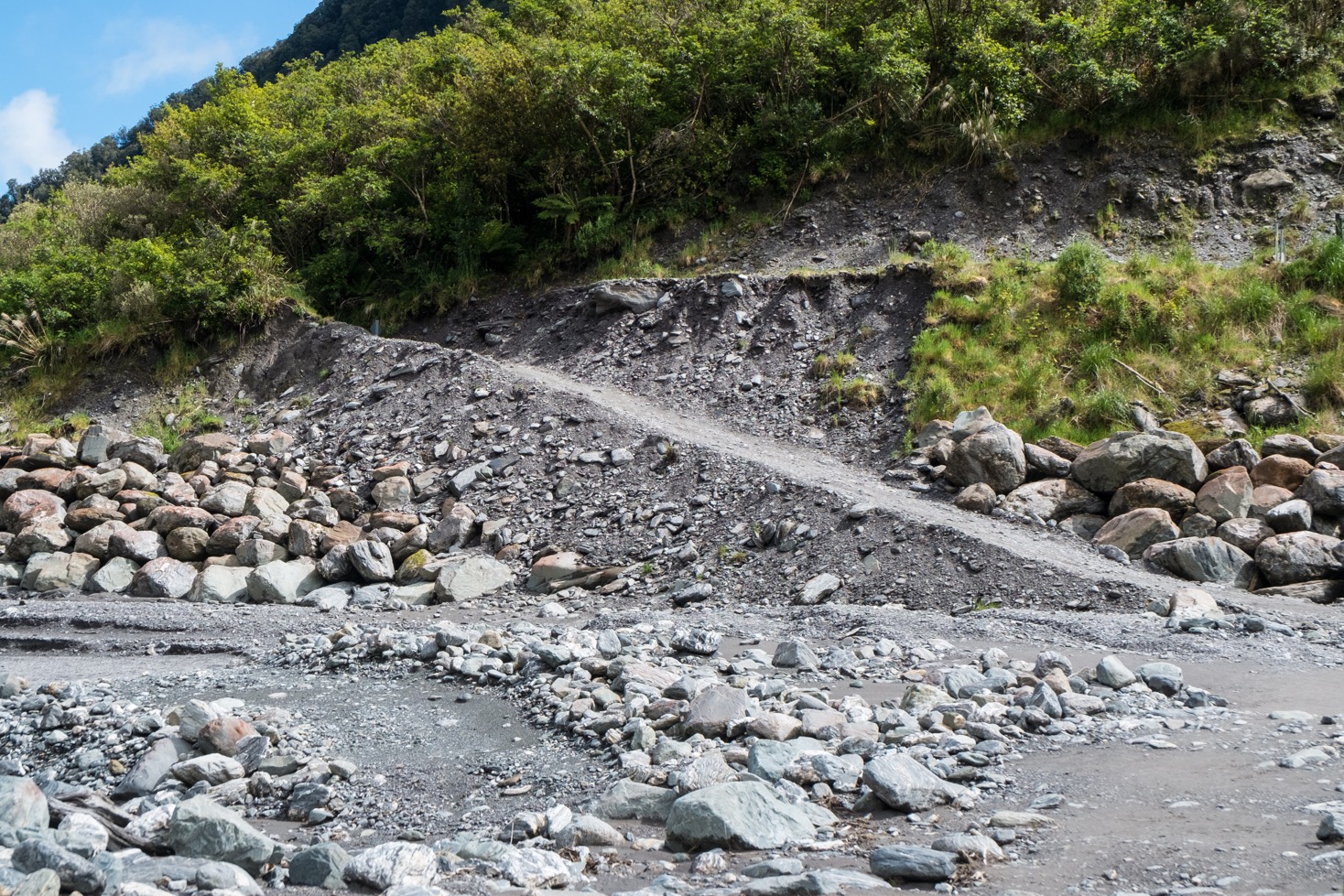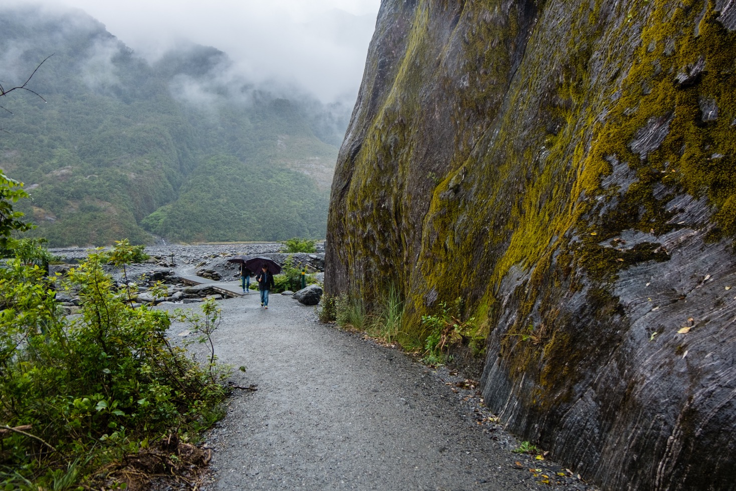 Les points de départ des randonnées de Fox Glacier se trouvent sur les parking situés aux extrémités de la « Glacier View Road » et de la « Fox Glacier Access Road ». Nous avons donc laissé la voiture sur le parking de la « Glacier View Road » pour faire la « River Walk » qui rejoint l’autre parking. Cette balade de 900 mètres dans les bois est assez agréable. Si ce chemin offre une opportunité de plus de découvrir le bush néo-zélandais ce n’est cependant pas à la portée de tout le monde. En effet cette courte marche est assez difficile en fauteuil roulant car elle passe, à certains moments, dans les moraines.