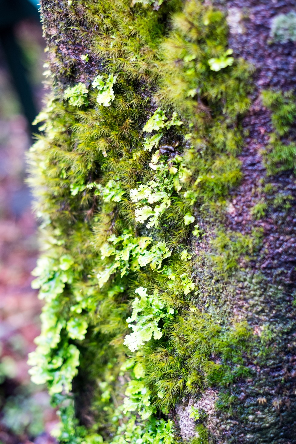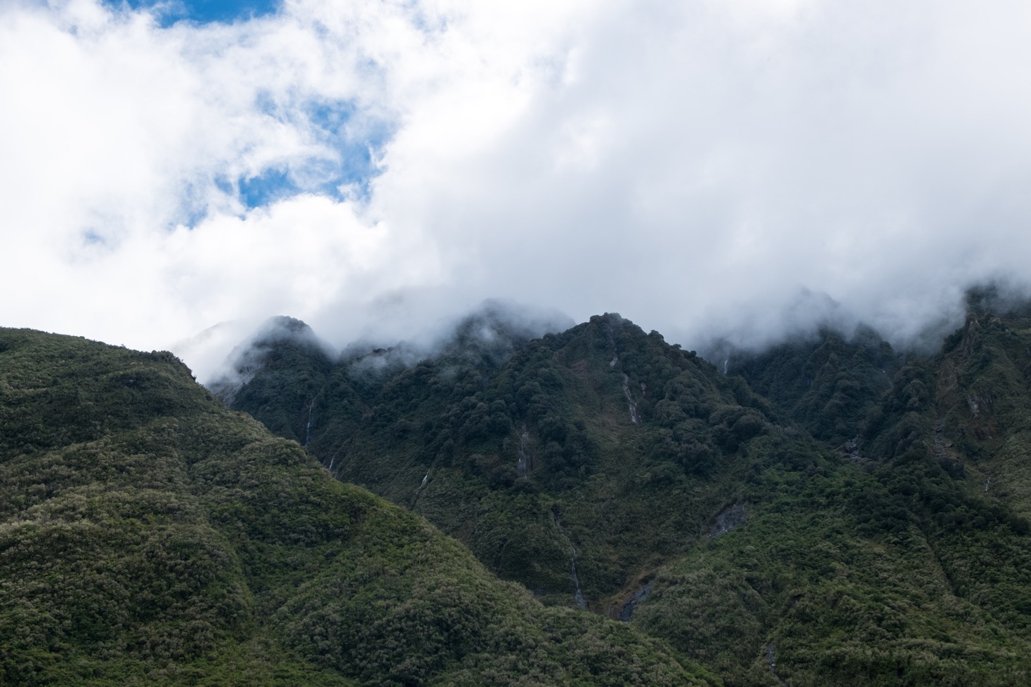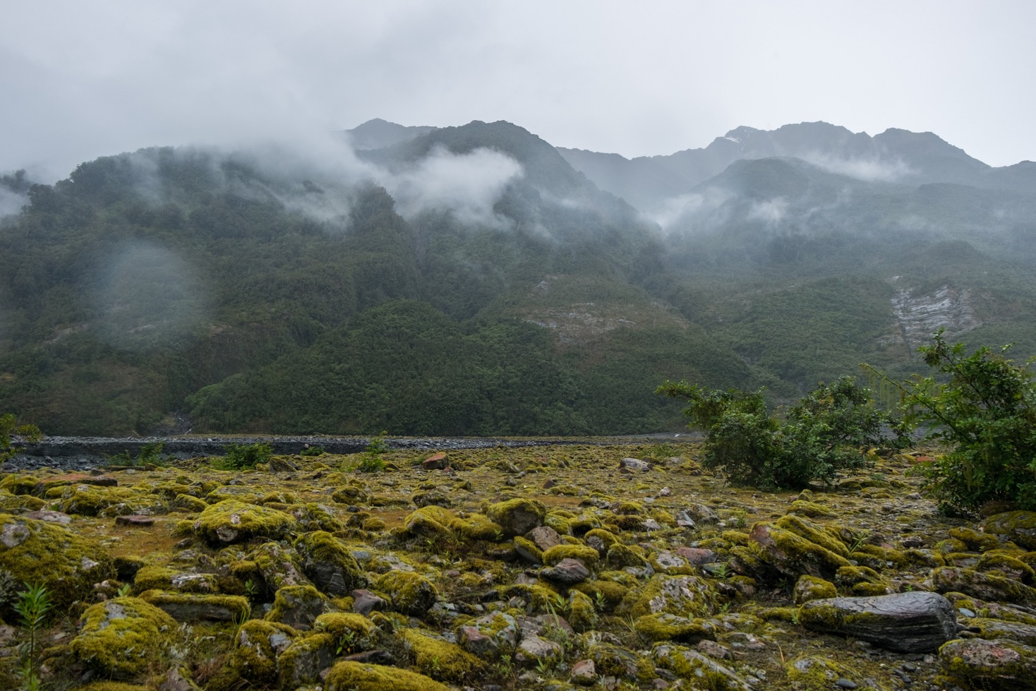 Le paysage autour de nous est impressionnant. Les montagnes se dressent de chaque côté des moraines et dissimulent légèrement leurs sommets derrière un voile nuageux. Les roches au sol sont recouvertes d’une belle mousse aux nuances vertes et jaunes.