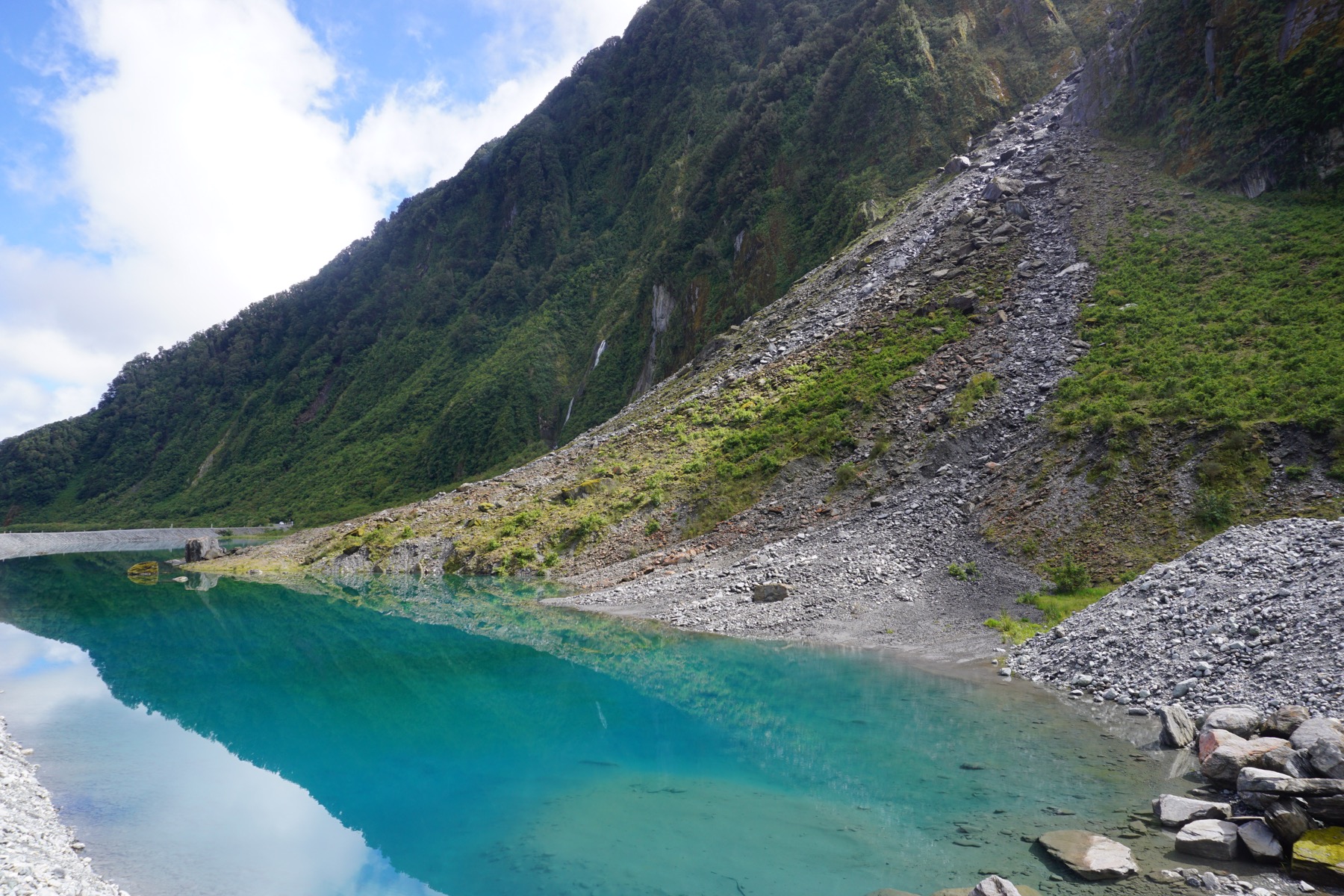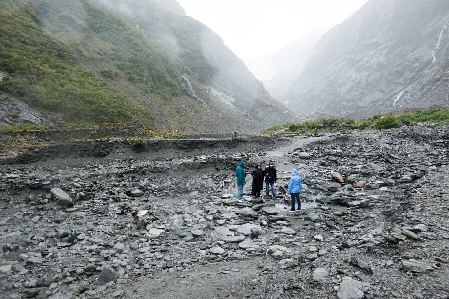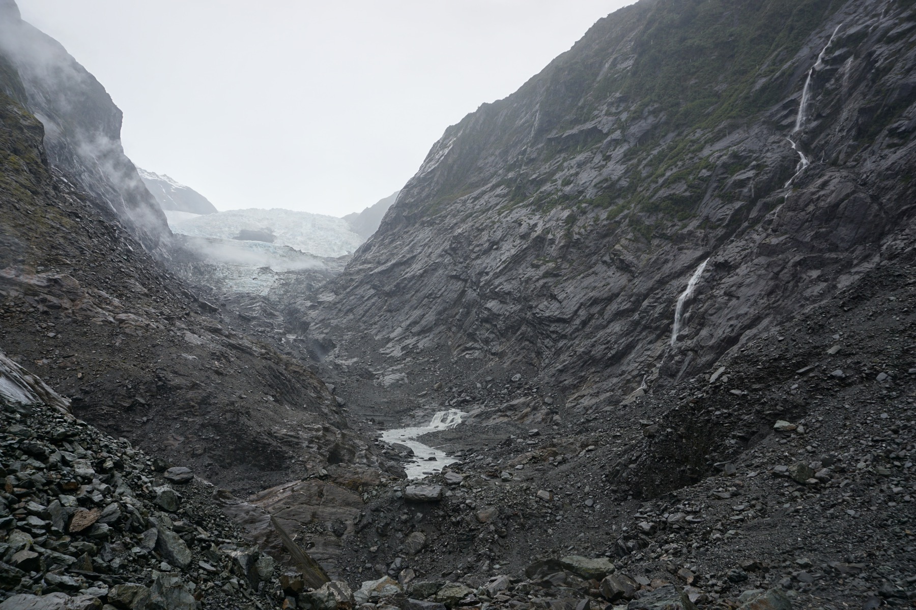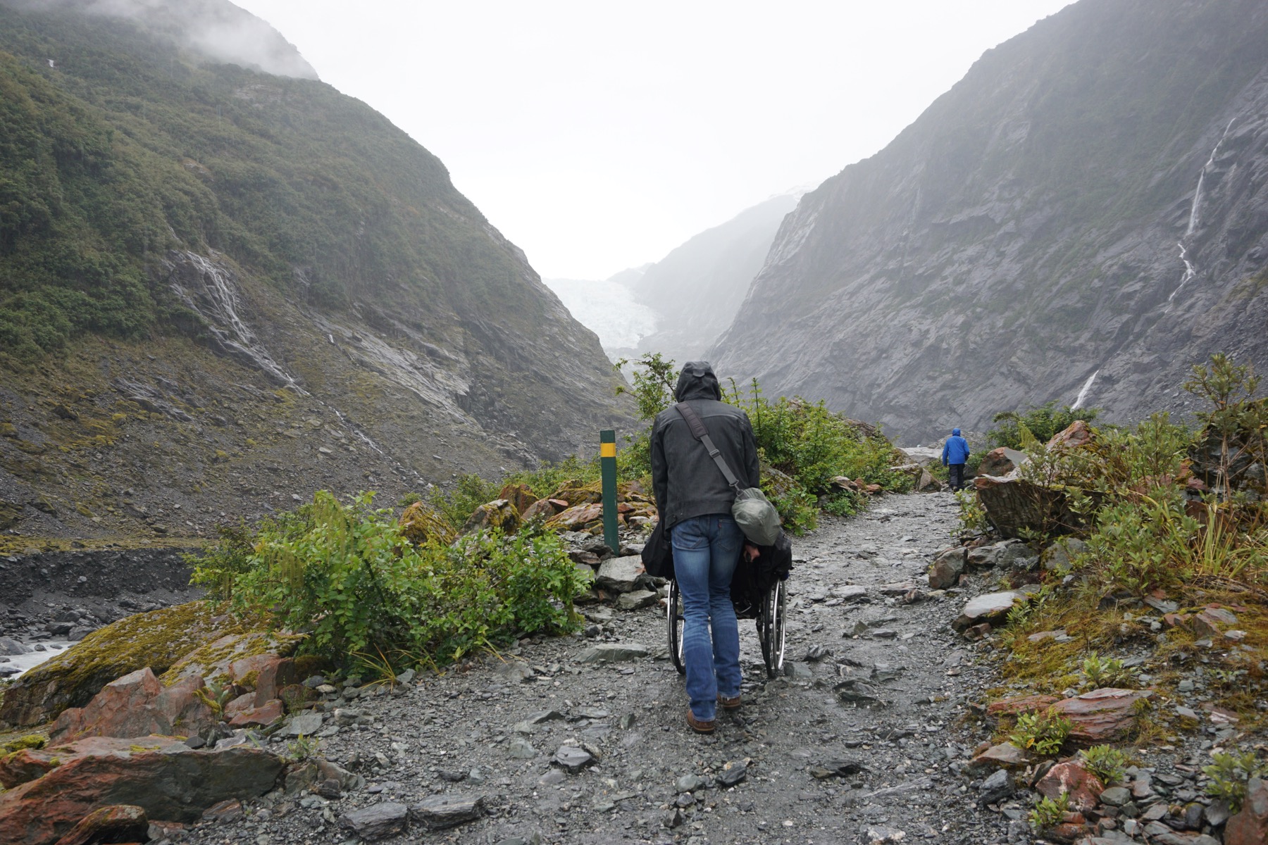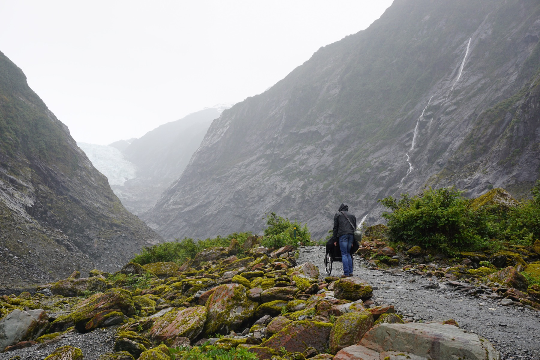 C’est dans ce cadre aux allures presque mystiques que la randonnée s’arrête pour moi. Pour atteindre le dernier point de vue il faut grimper sur une montée très raide avec un sol toujours très rocheux. Marcher jusque là nous a déjà bien fatigués, surtout Franck. Me pousser sur les roues arrières durant tout ce temps lui a demandé beaucoup d’efforts. Du coup les garçons finissent cette marche vers le glacier tous les deux. De mon côté je profite de ce temps pour admirer le glacier, les montagnes et les nombreuses cascades autour de moi. Je prends conscience de ce que nous accomplissons ensemble et de la chance que j’ai d’être là, en Nouvelle-Zélande, à quelques mètres d’un glacier.