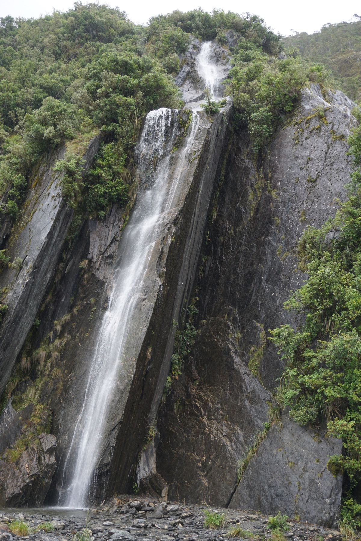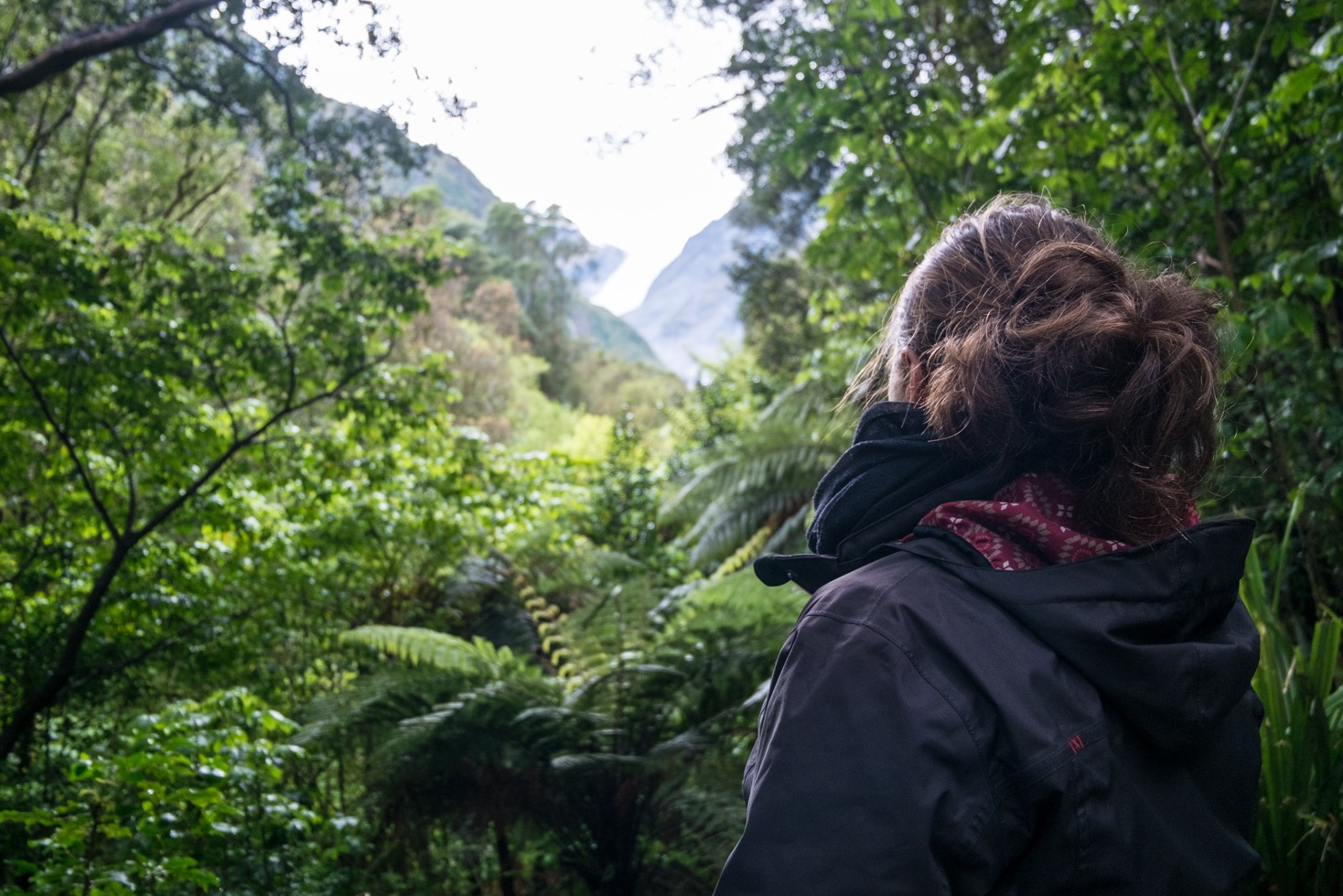 Une fois arrivés de l’autre côté de la « River Walk », Franck a été récupérer la voiture pour nous permettre de rejoindre le début de la « Fox Glacier Valley Walk« . Aujourd’hui il ne pleut pas et cette marche est plus courte que celle de la veille : seulement 2,6 kilomètres aller-retour. Nous sommes donc assez confiants. Finalement nous trouvons cette walk plus difficile. Le chemin comporte plusieurs montées et descentes et, là encore, nous devons traverser la rivière. Nous accusons peut-être également la fatigue de la veille.