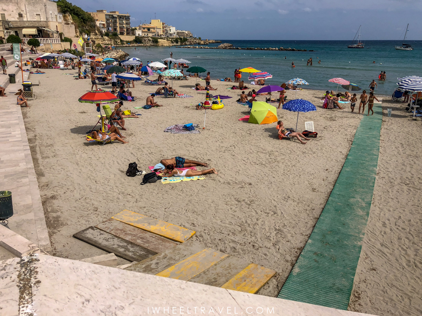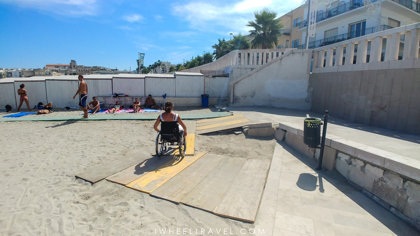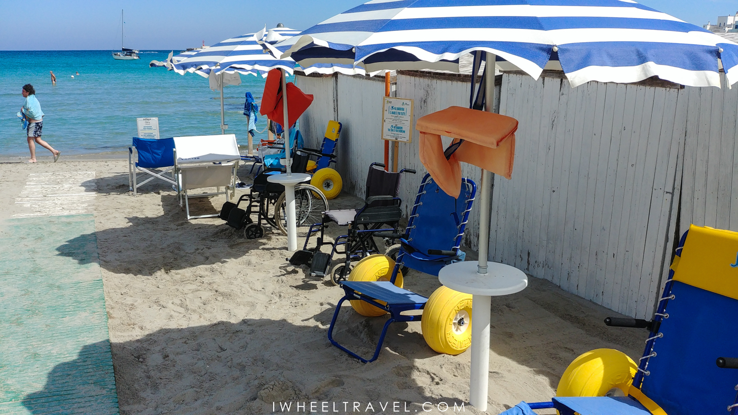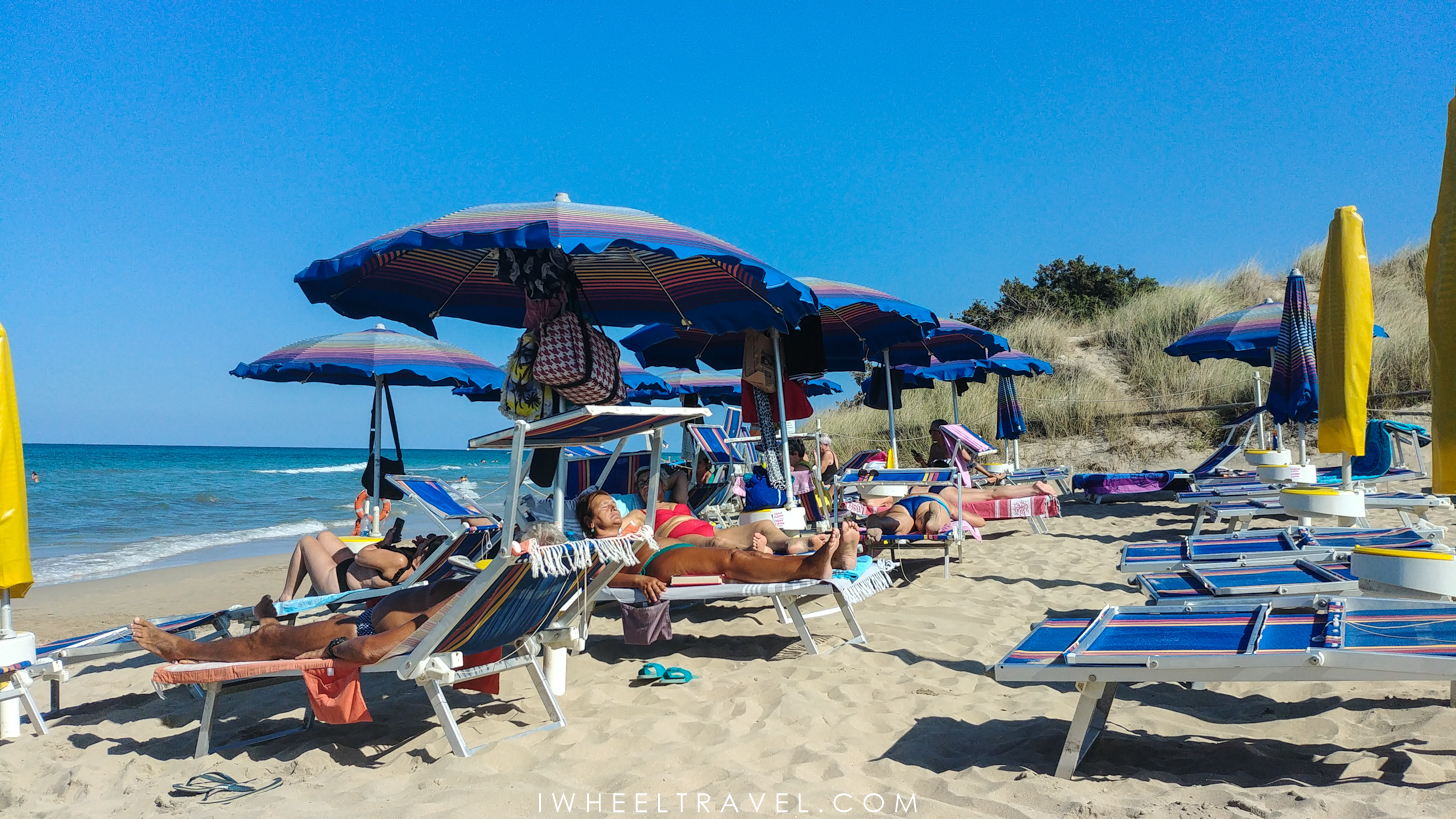 Mais, si les côtes adriatiques et ioniennes sont magnifiques, il n’est pas toujours facile d’y trouver des plages accessibles pour les personnes à mobilité réduite. Comme chez nous, toutes les plages ne sont pas aménagées pour permettre aux personnes en fauteuil roulant d’y accéder facilement. Mais rassurez-vous, même si nous avons parfois eu du mal à les trouver, il y a des plages accessibles dans les Pouilles. Je dois même avouer qu’il y en a plus que ce que j’avais imaginé. Finalement le plus difficile n’est pas de trouver une plage accessible mais de trouver une plage accessible gratuite. En effet, les Italiens semblent assez friands des plages aménagées privatisées et donc payantes qu’ils appellent « lidos ». Mais pas de panique voilà plusieurs plages que j’ai testées et classées selon leur niveau d’accessibilité. Parmi celles-ci une seule est payante.