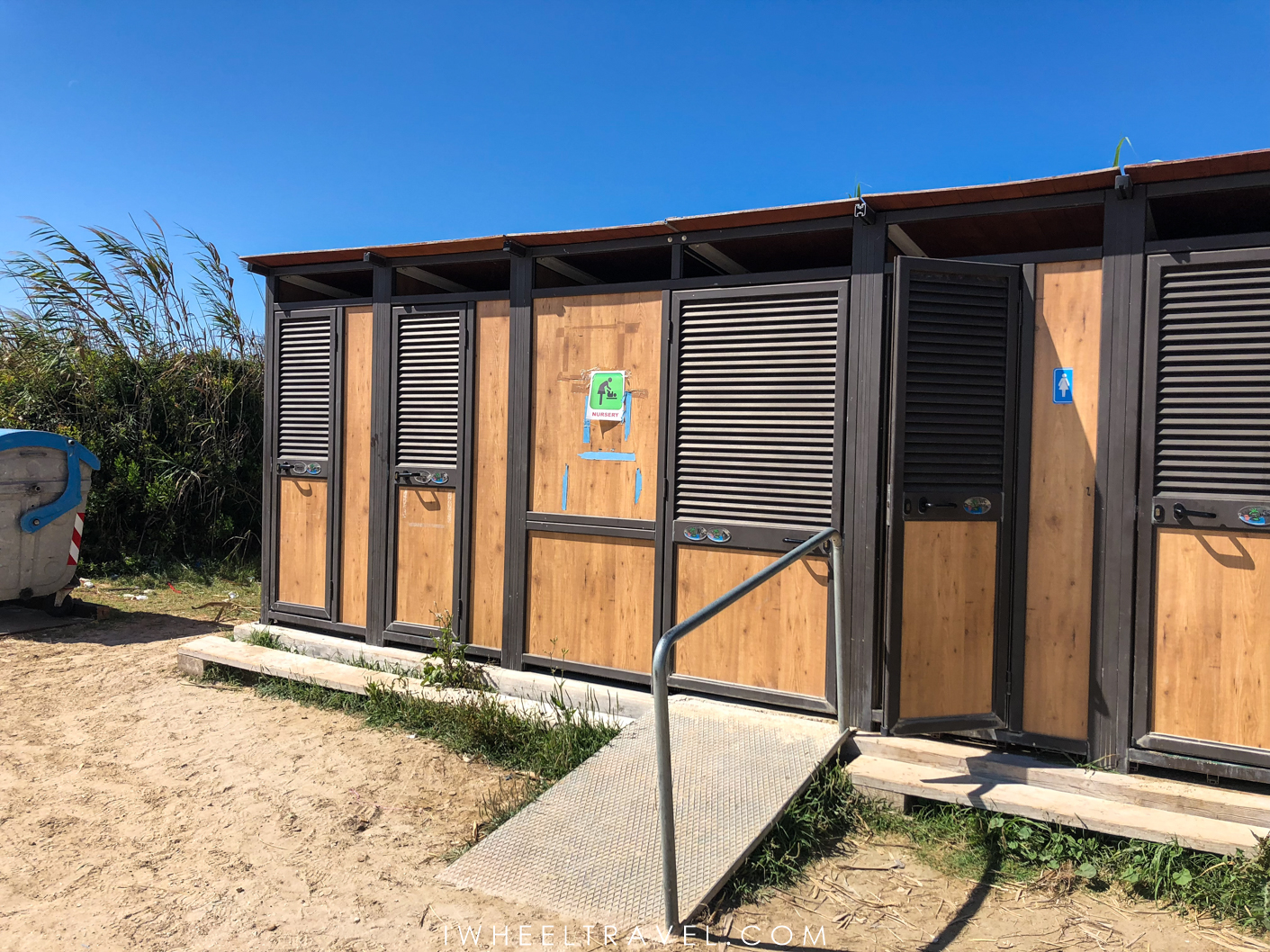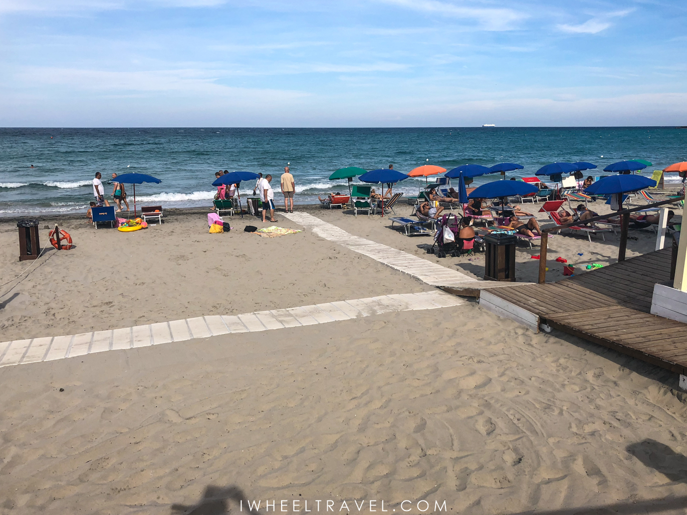 Il y a de nombreux fauteuils de plage à disposition et un fauteuil de baignade. Ces fauteuils de plage italiens « job chair », sont un peu différents des tiralos ou fauteuils hippocampes que nous connaissons. La plage est également équipée d’un toilette adapté et un chemin en bois a été aménagé pour rejoindre l’eau. Seulement 3/4 mètres séparent ce chemin de la mer adriatique.
