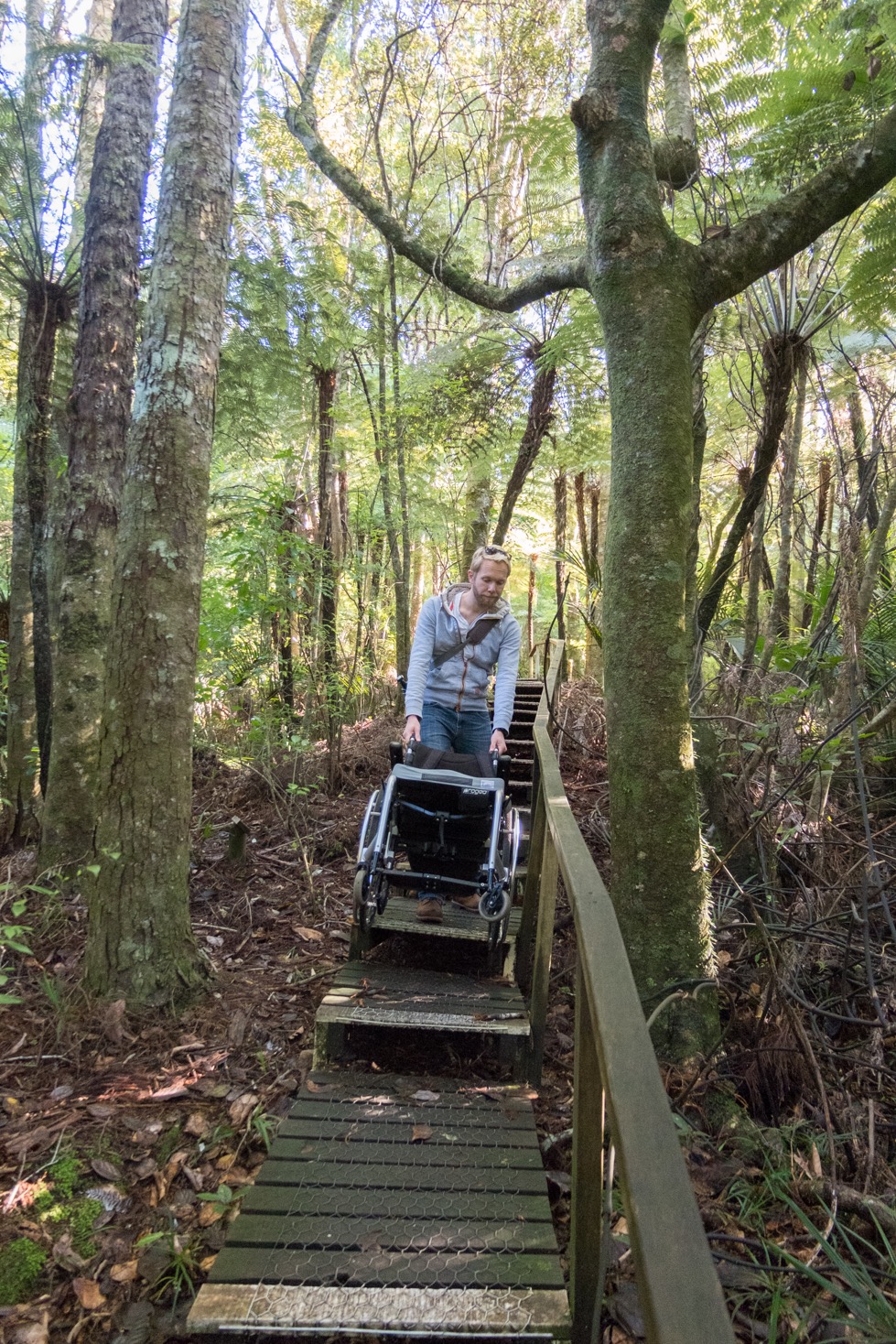 La balade permet d’être en immersion dans le bush, d’admirer des impressionnants arbres, d’entendre les chants des oiseaux néo-zélandais et peut-être de les apercevoir. Cependant cette balade n’est pas accessible. J’ai pu faire les premiers mètres en fauteuil roulant puis j’ai vite aperçu les premiers escaliers. Je suis sortie de mon fauteuil et j’ai commencé à marcher en espérant que nous allions vite retrouver un sol plat. En réalité il y a des marches quasiment tout le long de la walk. J’ai donc fait la balade à pied avec Franck qui me suivait en transportant le fauteuil. Tranquillement mais sûrement !