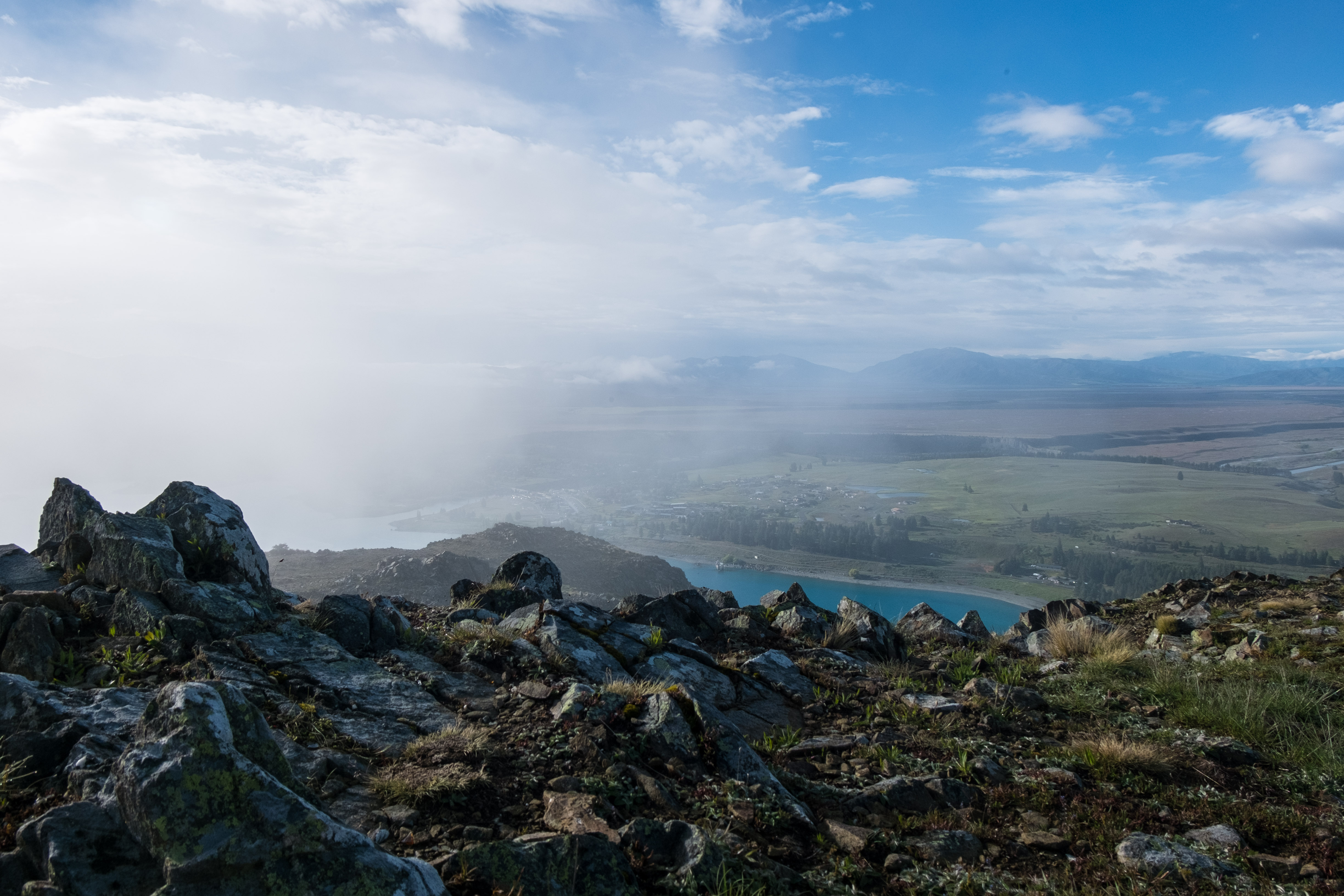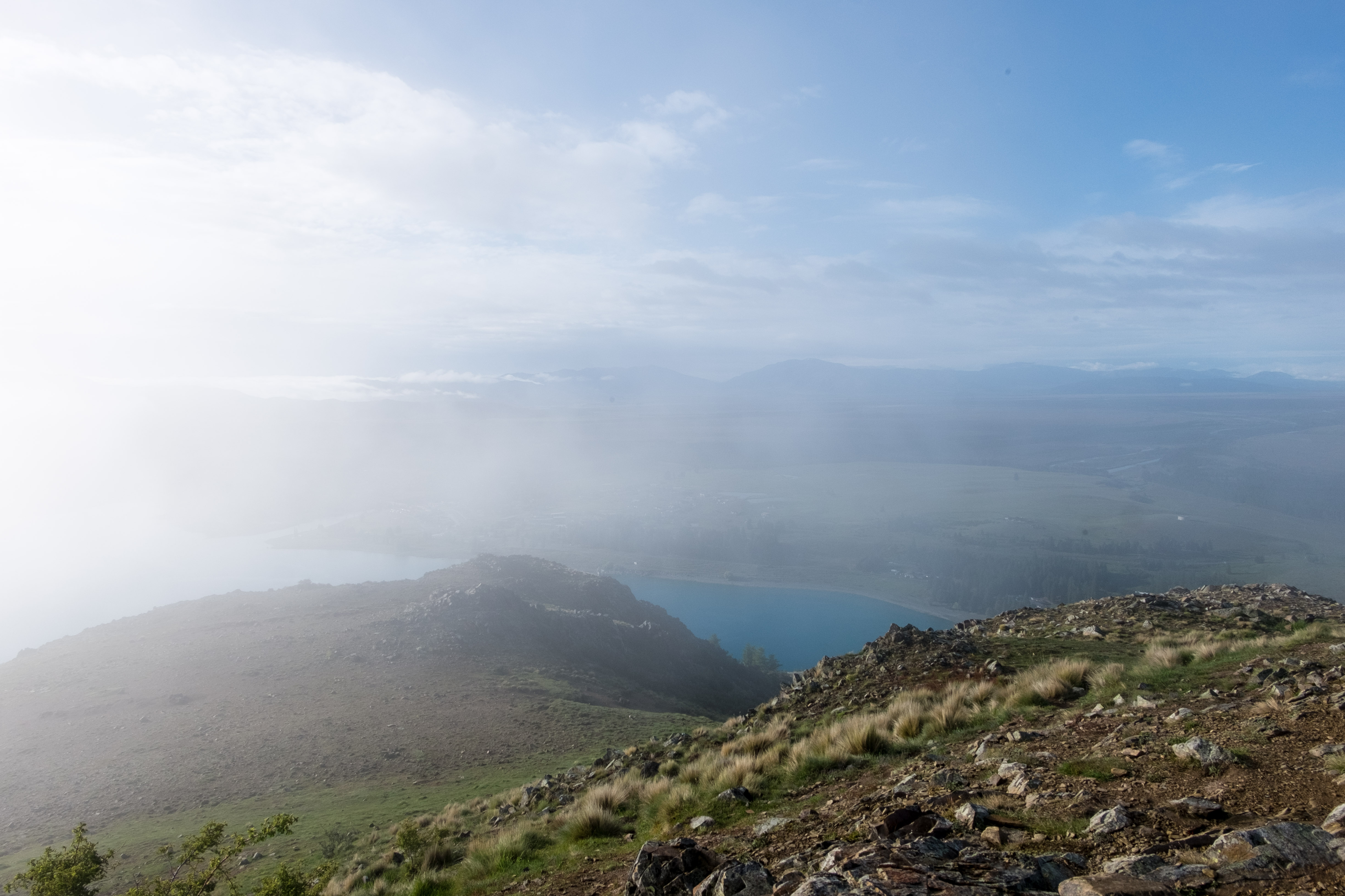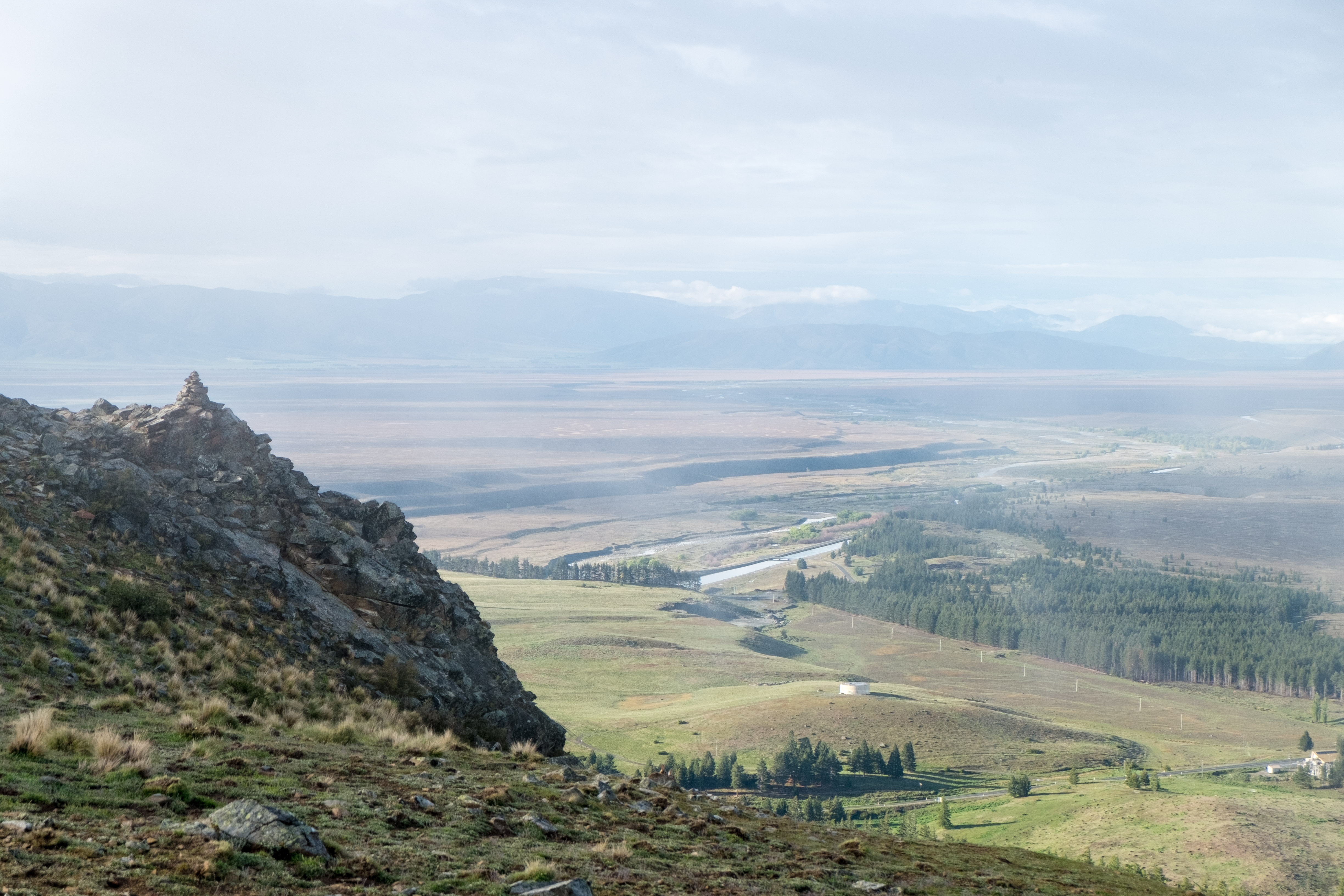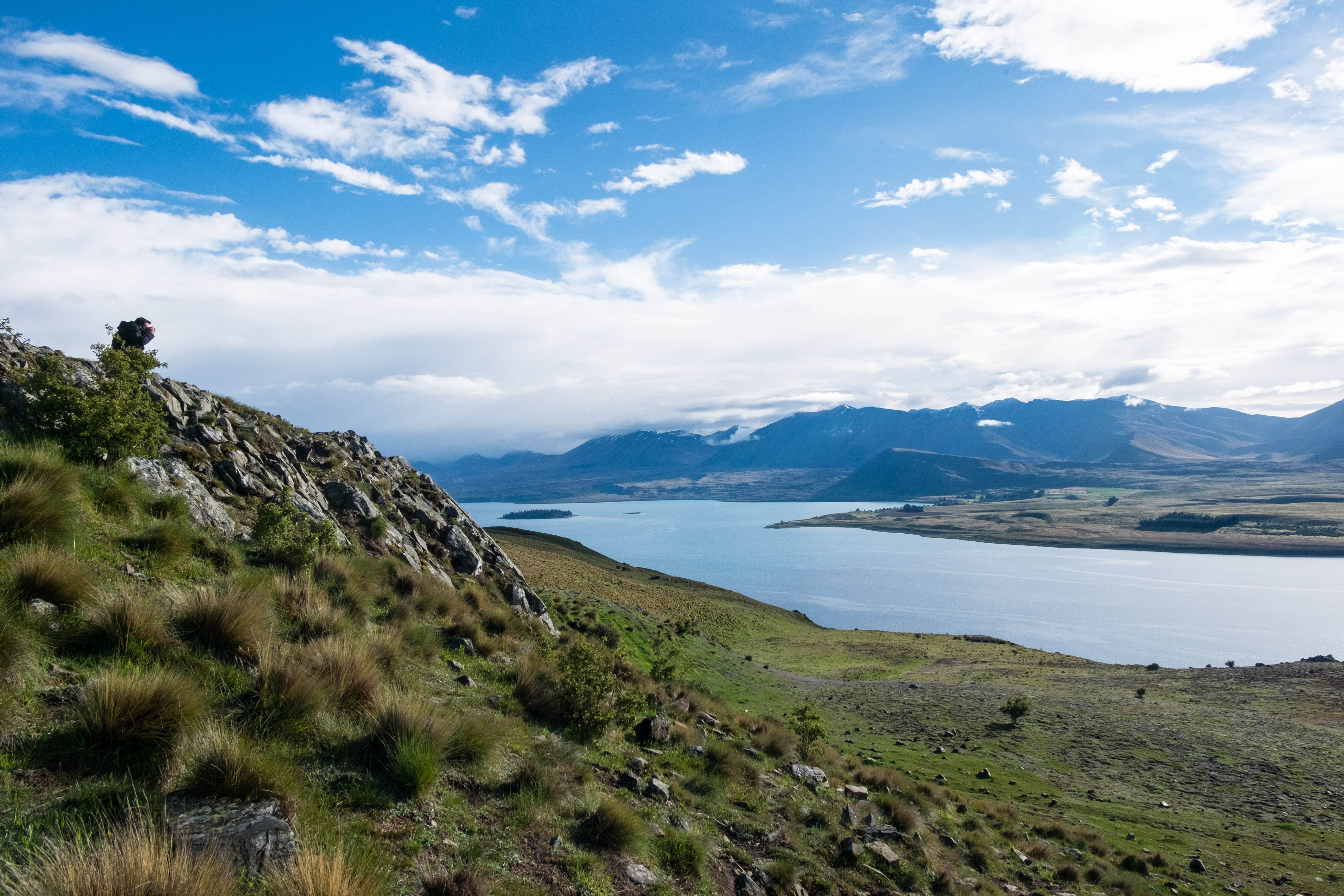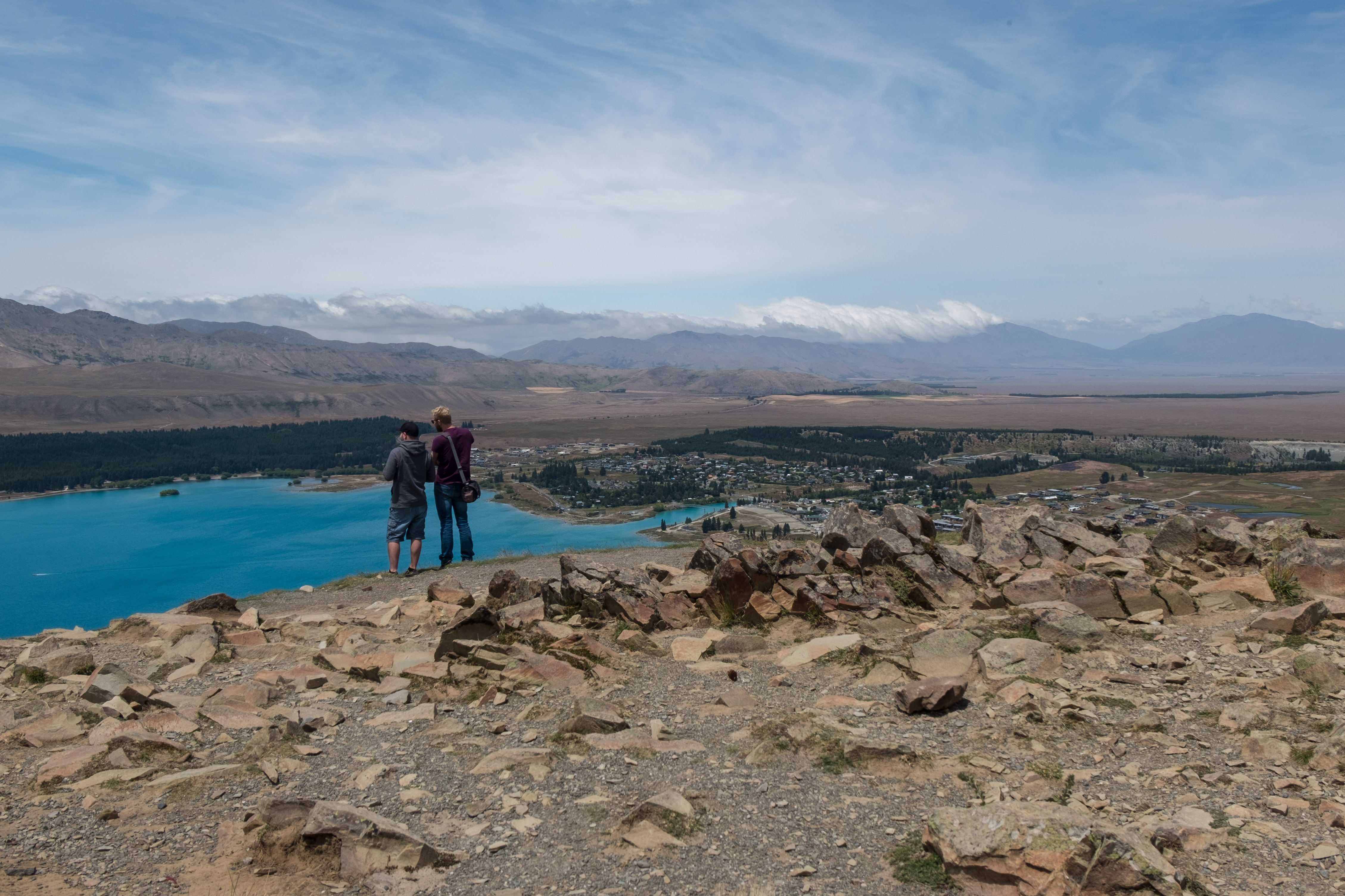 Qu’à cela ne tienne ! De retour à Tekapo en compagnie de notre ami Baptiste nous décidons de monter tous ensemble par la route. A notre arrivée en bas de la route permettant d’accéder au sommet et à l’observatoire, nous découvrons avec surprise qu’emprunter celle-ci coûte 8 dollars néo-zélandais par véhicule. Nous avons payé et nous n’avons pas regretté un seul moment. La vue panoramique à 360 degrés est magnifique. De là-haut je peux admirer le lac et les montagnes aux sommets encore un peu enneigés. Le bleu turquoise du lac Tekapo parait encore plus intense vu d’ici !