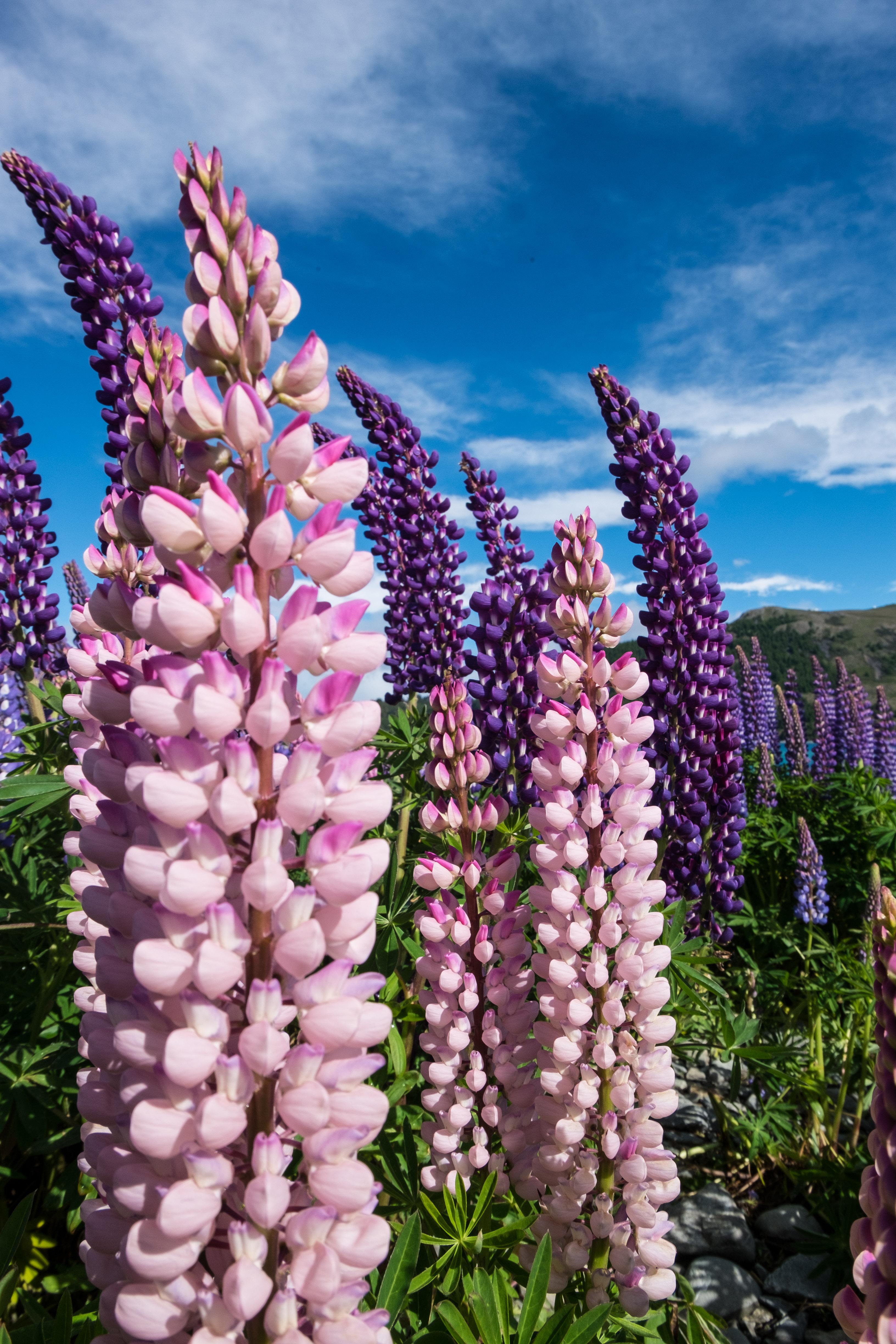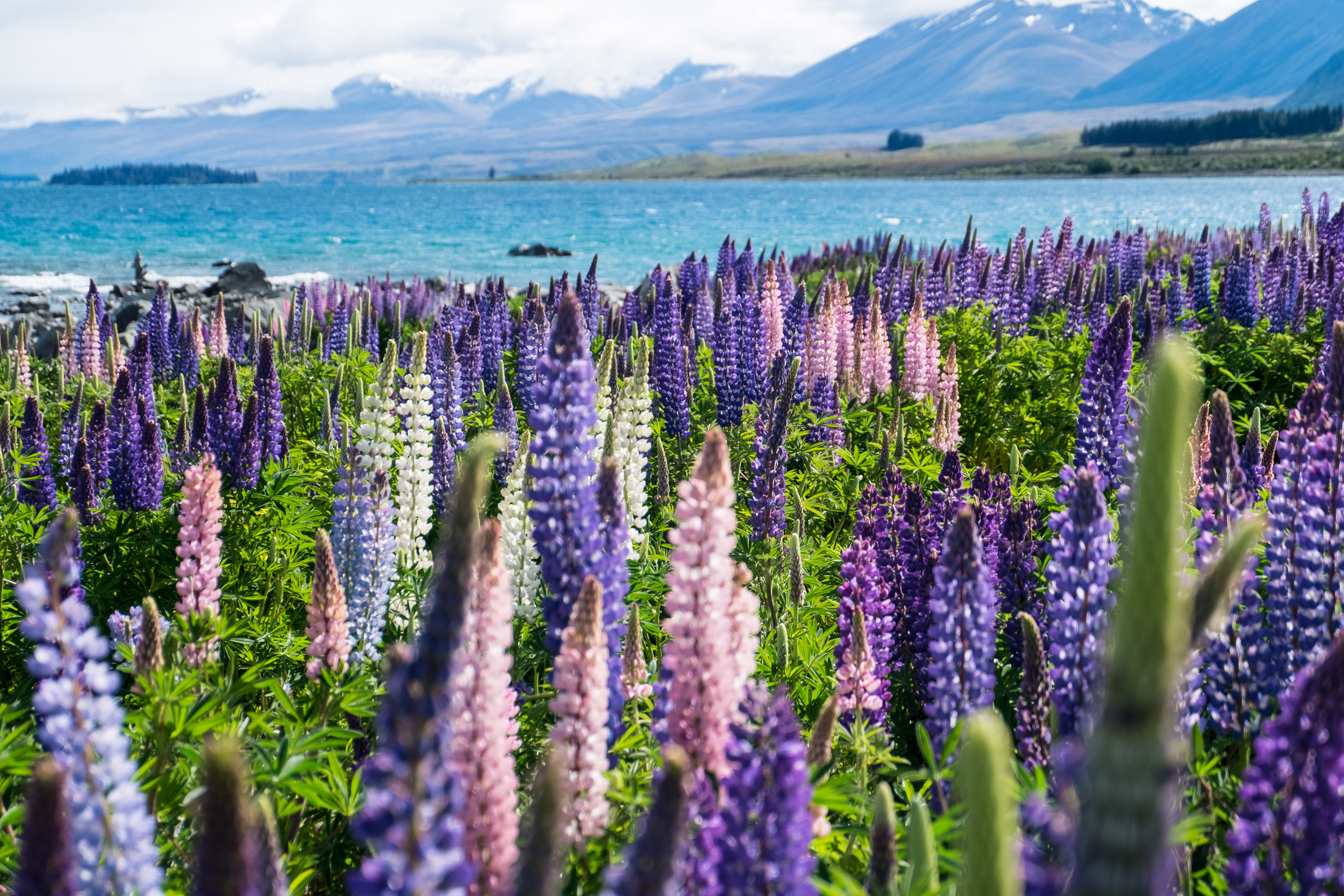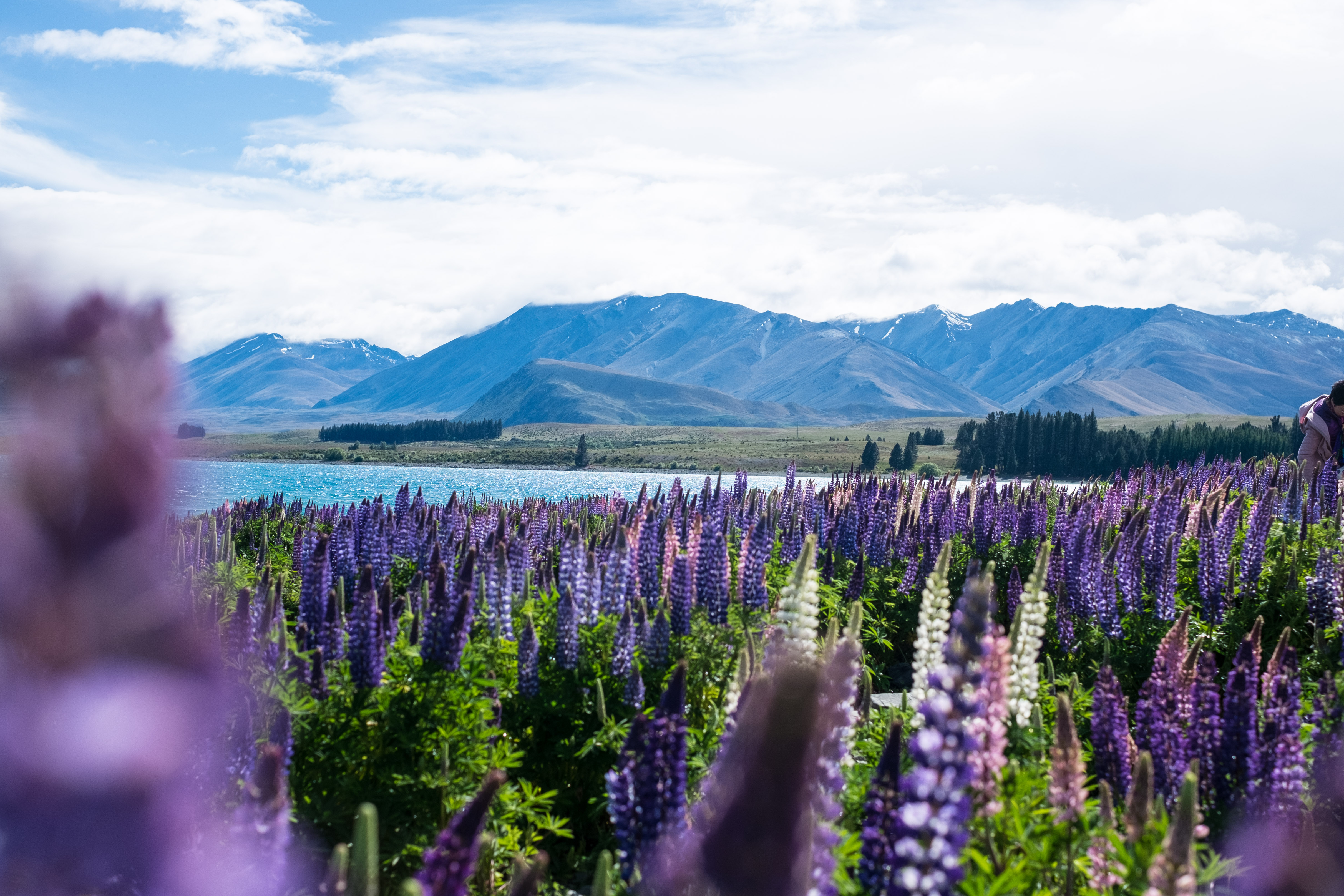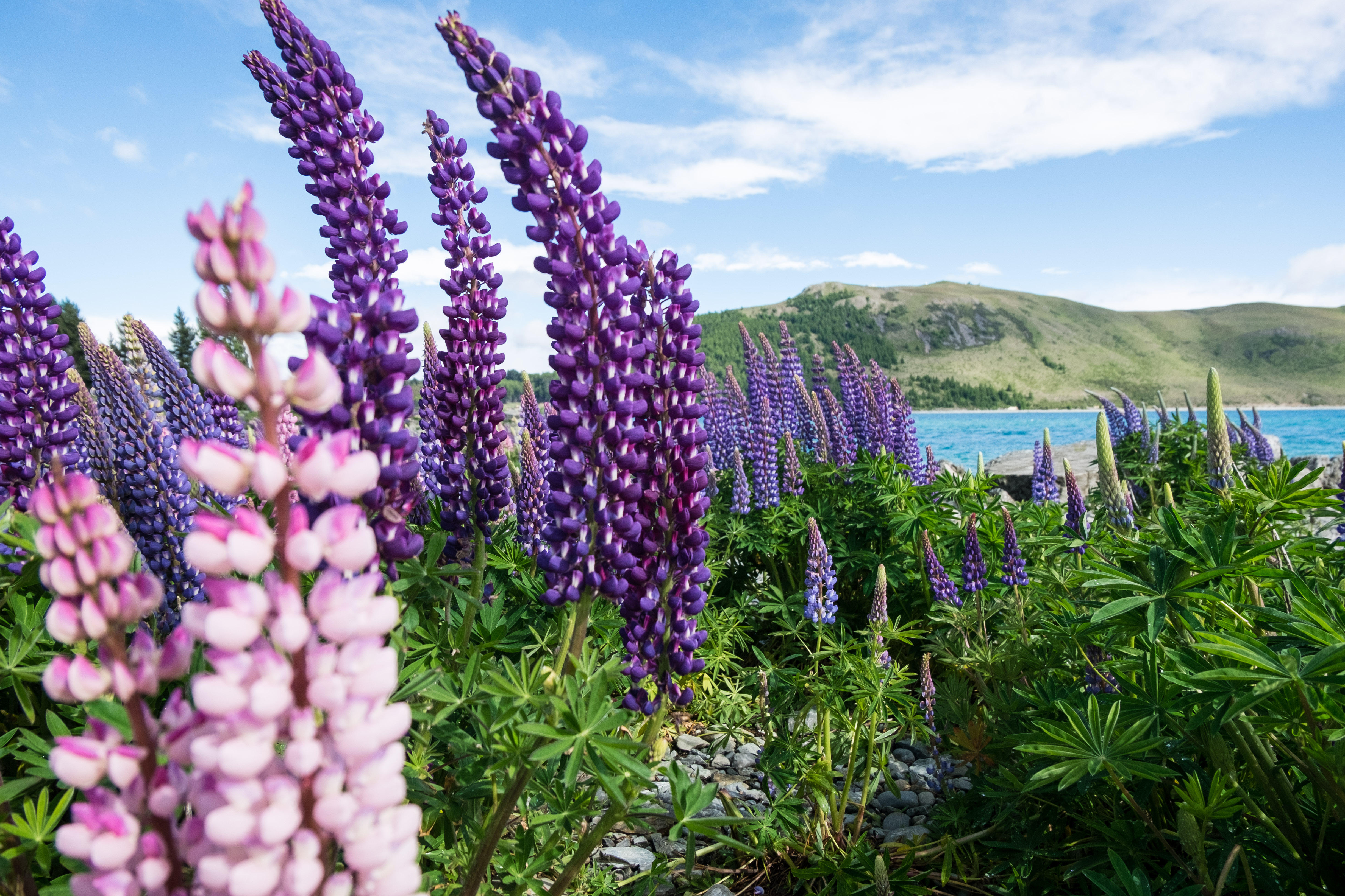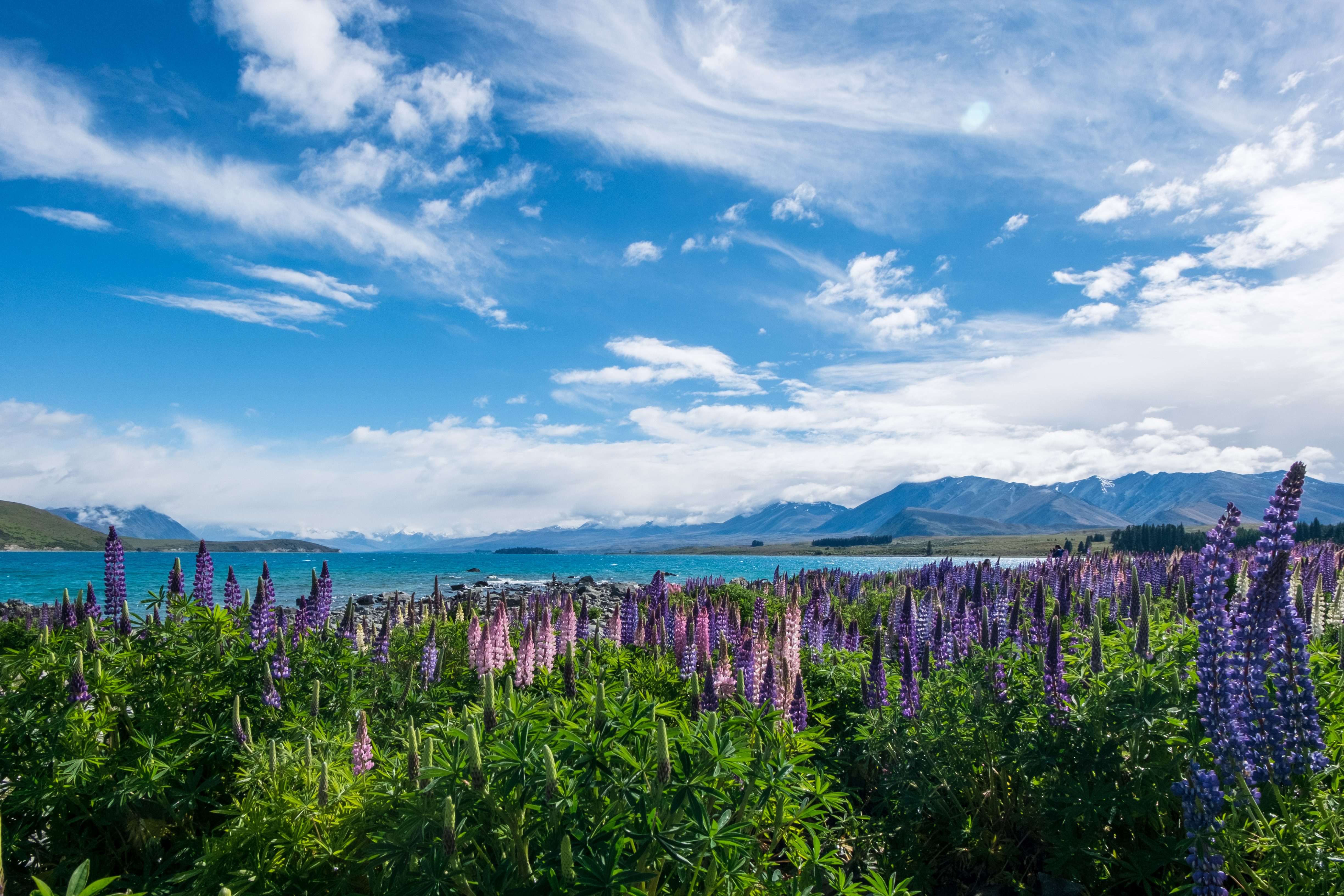 Ce n’est pas un hasard si le lac Tekapo est l’un des plus connus du pays. Ce lac aux eaux d’un très beau bleu turquoise est bordé par un nombre impressionnant de fleurs violettes et roses se courbant au gré du vent. Le mélange de toutes ces couleurs est un vrai régal pour les yeux. Au loin, les montagnes aux sommets enneigés viennent parfaire ce décor. Une fois de plus, j’admire un paysage d’une beauté inouïe. La Nouvelle-Zélande n’en finit pas de m’enchanter. Malheureusement quand nous sommes revenus un mois plus tard, fin Décembre, les couleurs éclatantes des fleurs s’étaient estompées pour laisser place à des tons pastels. Parmi les centaines de fleurs que nous avions vu seules quelques dizaines subsistaient.