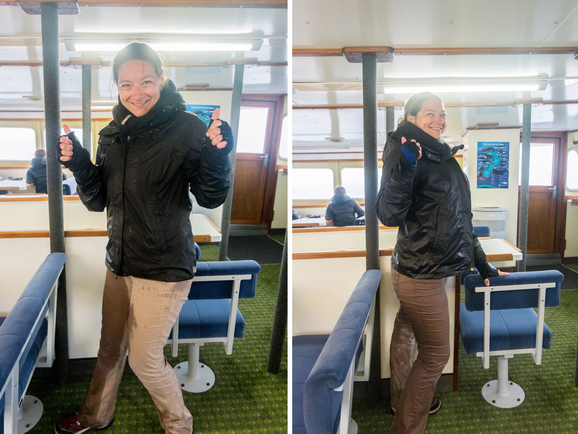 Et puis en bonne bretonne que je suis ce n’est pas la pluie qui m’effraie alors j’ai décidé de rester dehors pour admirer les falaises et les chutes d’eau. Alors que nous étions tout à l’avant du bateau, quelques minutes plus tard, une vague plus grosse que les autres est venue frapper la proue lorsque nous faisions demi-tour dans à l’entrée de la mer de Tasman. Celle-là nous ne l’avions pas vu venir ! Si Franck et Baptiste ont juste été un peu mouillés, j’ai été complètement trempée sur tout mon côté droit. Nous en avons bien ri ! Très rafraichissant !