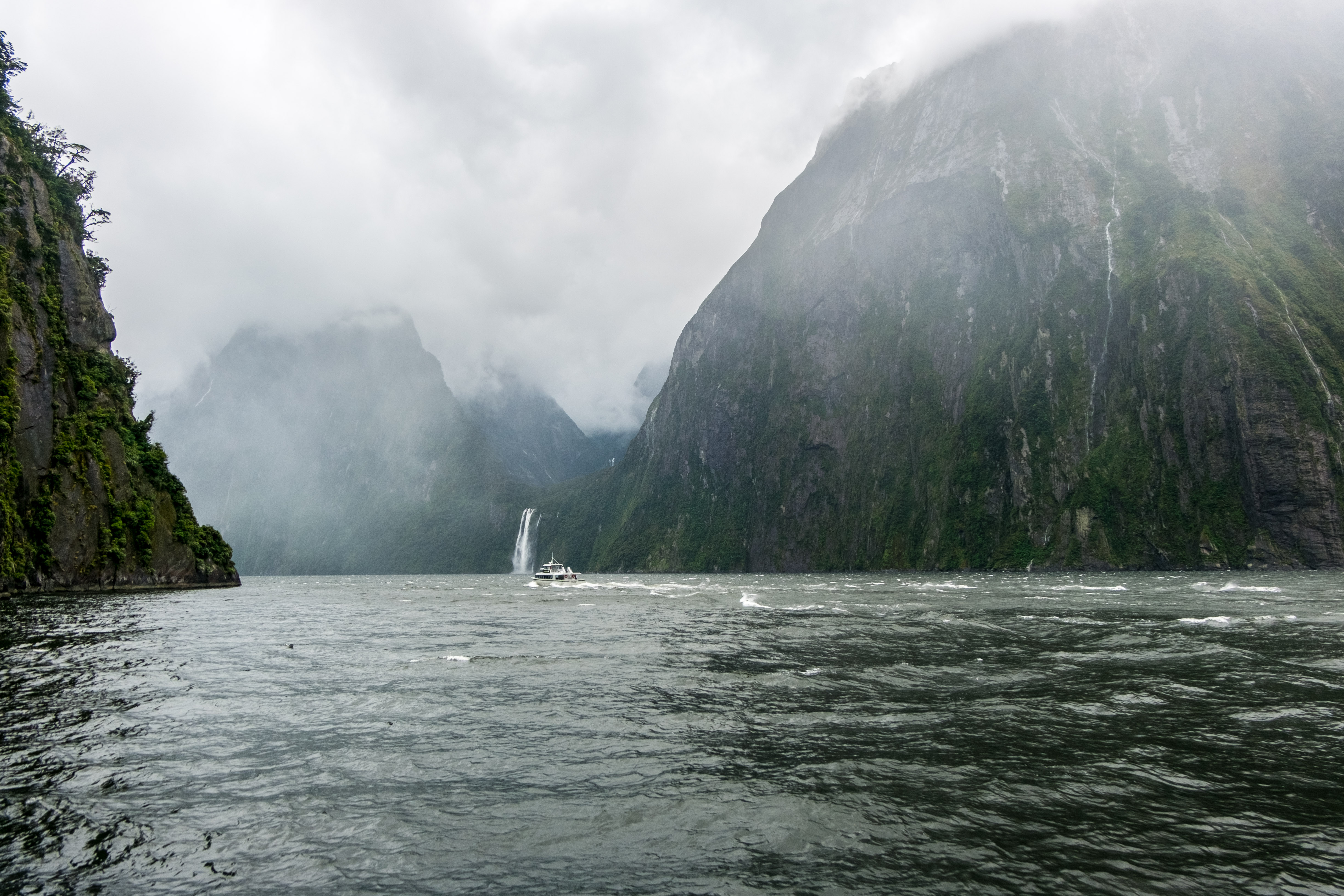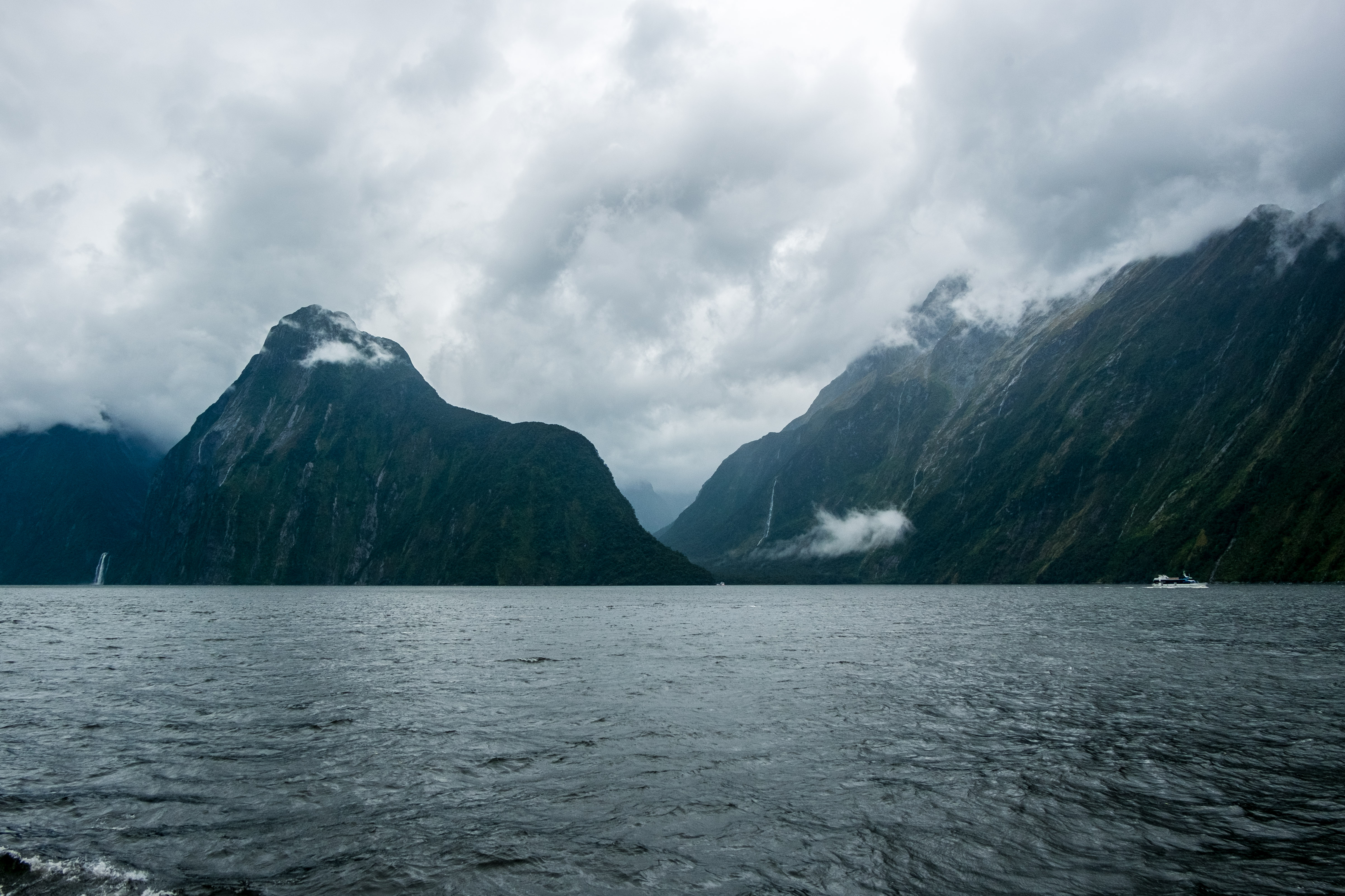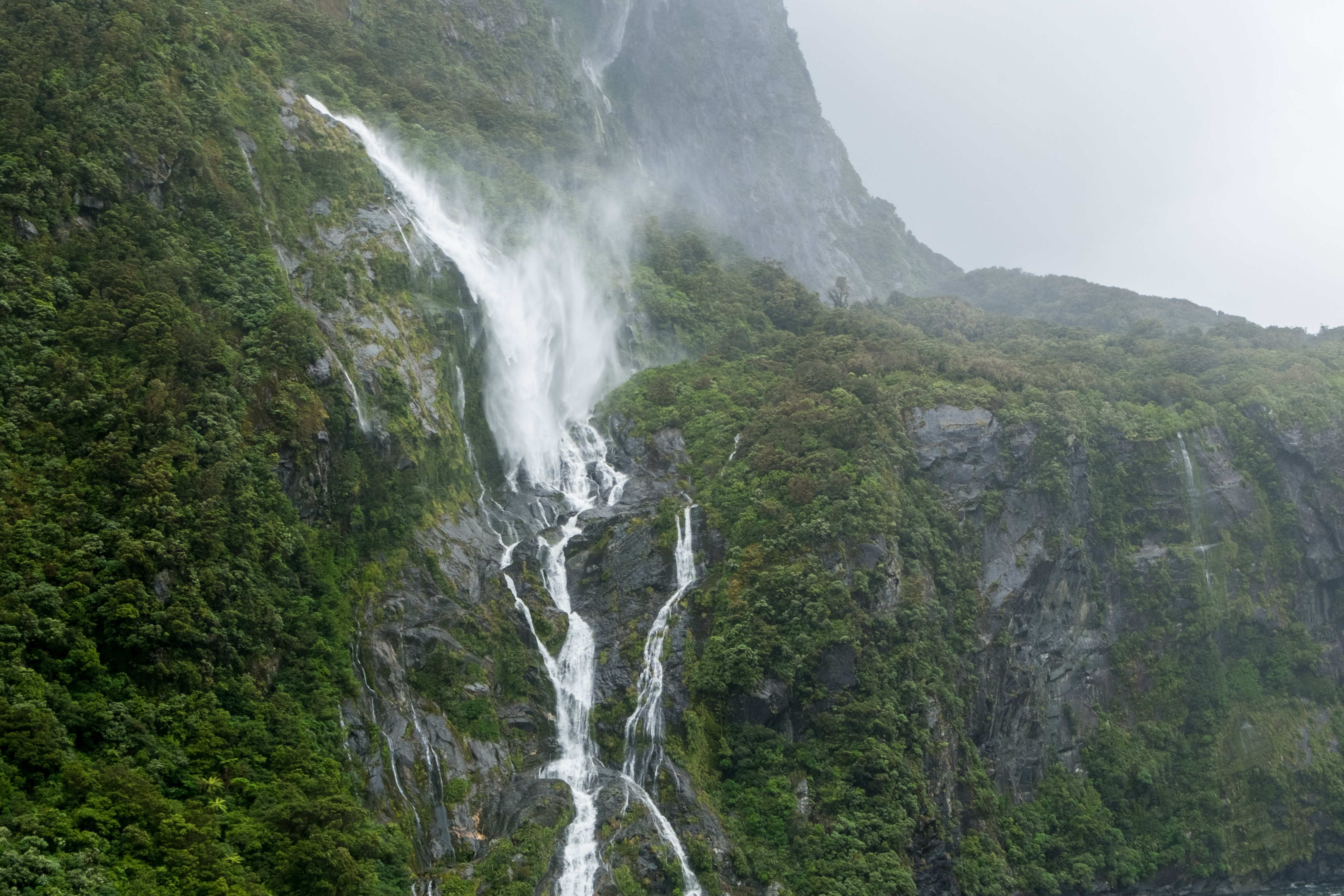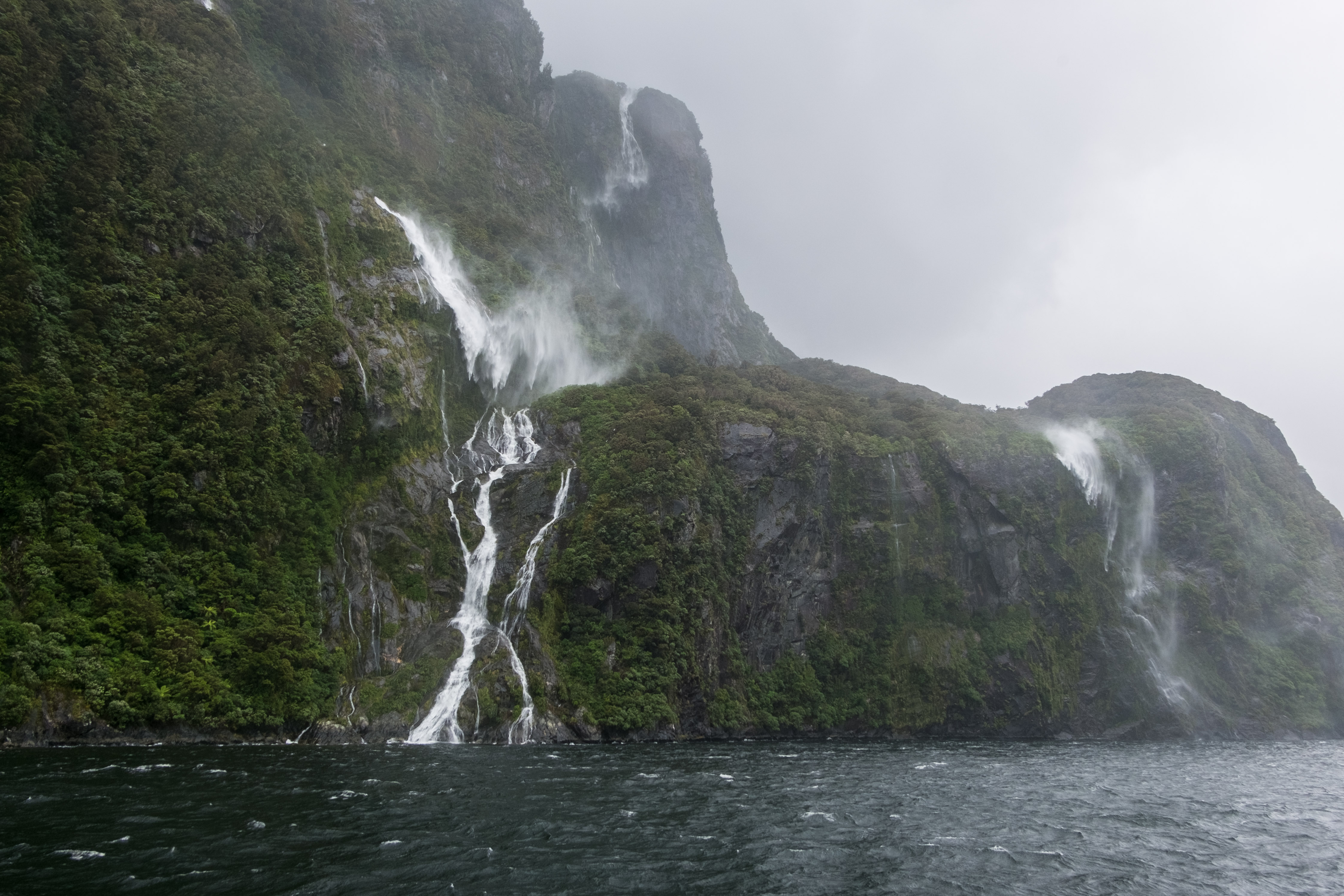 Durant notre visite cette fois pas de grand soleil mais, à la place, un ciel nuageux au début et même de la pluie pendant les dernières 45 minutes. En effet la région des fjords néozélandais est connue pour être particulièrement pluvieuse. Alors aller à Milford Sound implique la plupart du temps d’affronter la pluie mais c’est aussi ce qui fait son charme. Le voile brumeux donne une dimension mystique à cet incroyable décor et la pluie alimente les très nombreuses cascades.