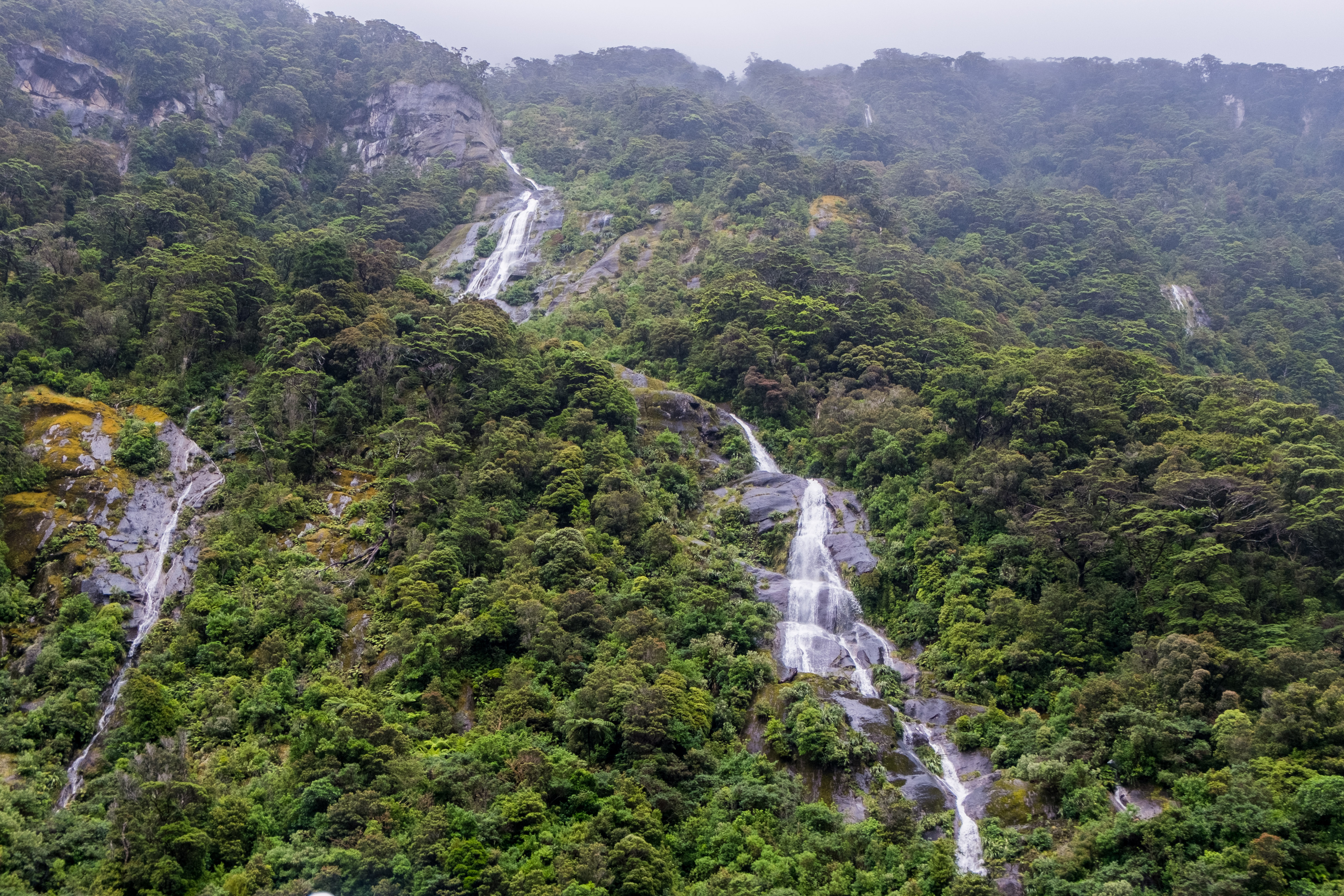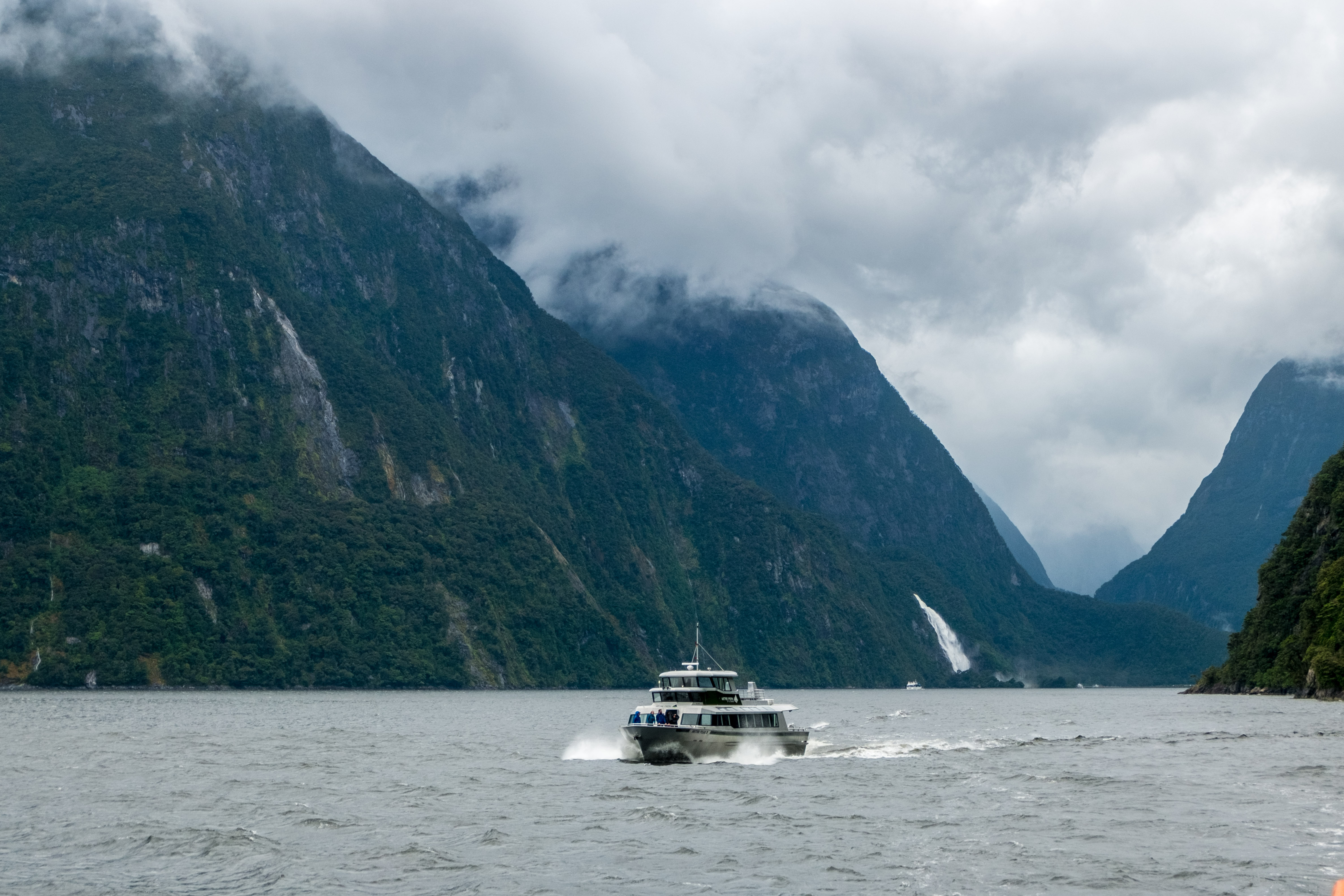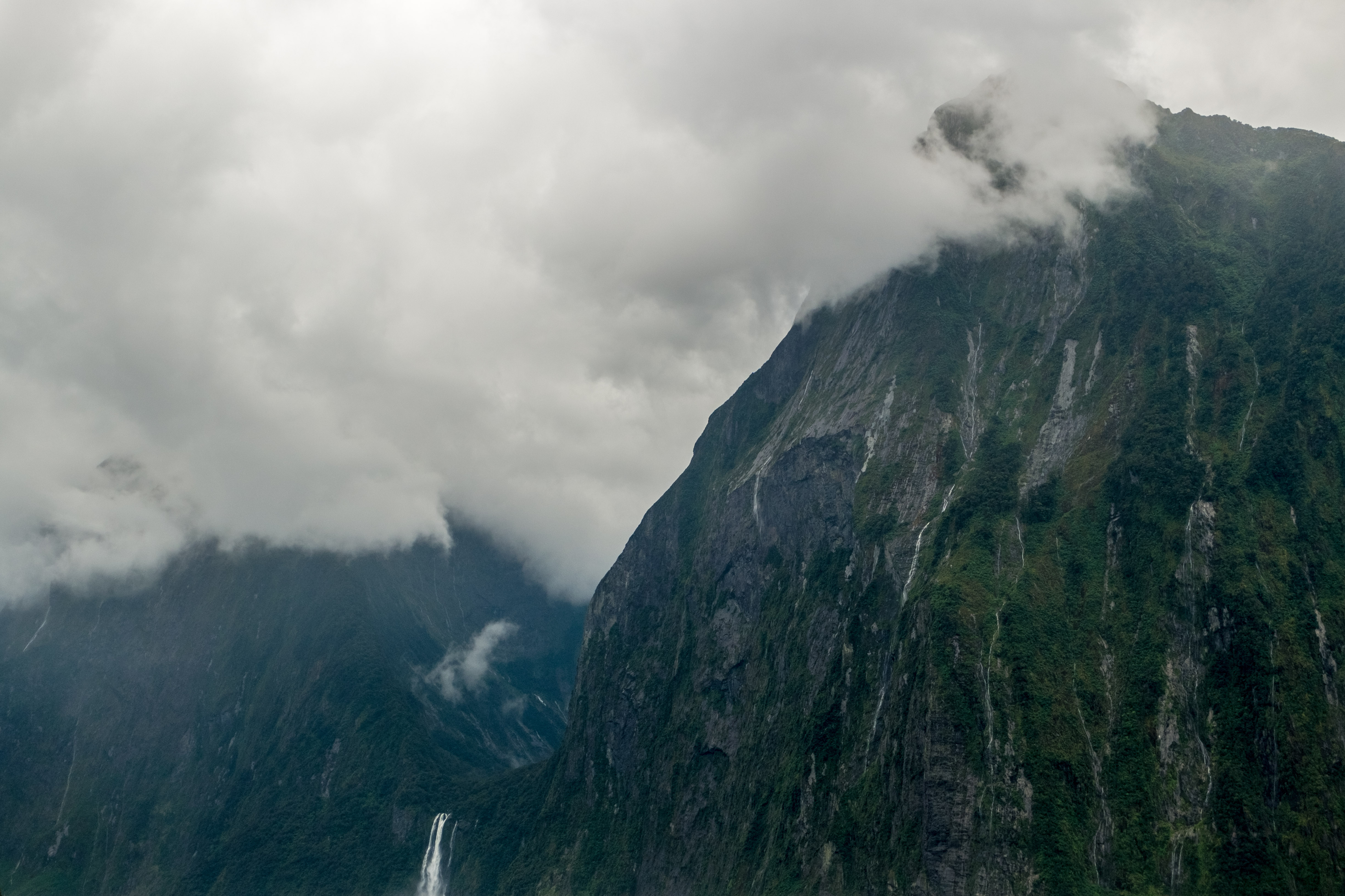 Durant notre visite cette fois pas de grand soleil mais, à la place, un ciel nuageux au début et même de la pluie pendant les dernières 45 minutes. En effet la région des fjords néozélandais est connue pour être particulièrement pluvieuse. Alors aller à Milford Sound implique la plupart du temps d’affronter la pluie mais c’est aussi ce qui fait son charme. Le voile brumeux donne une dimension mystique à cet incroyable décor et la pluie alimente les très nombreuses cascades.