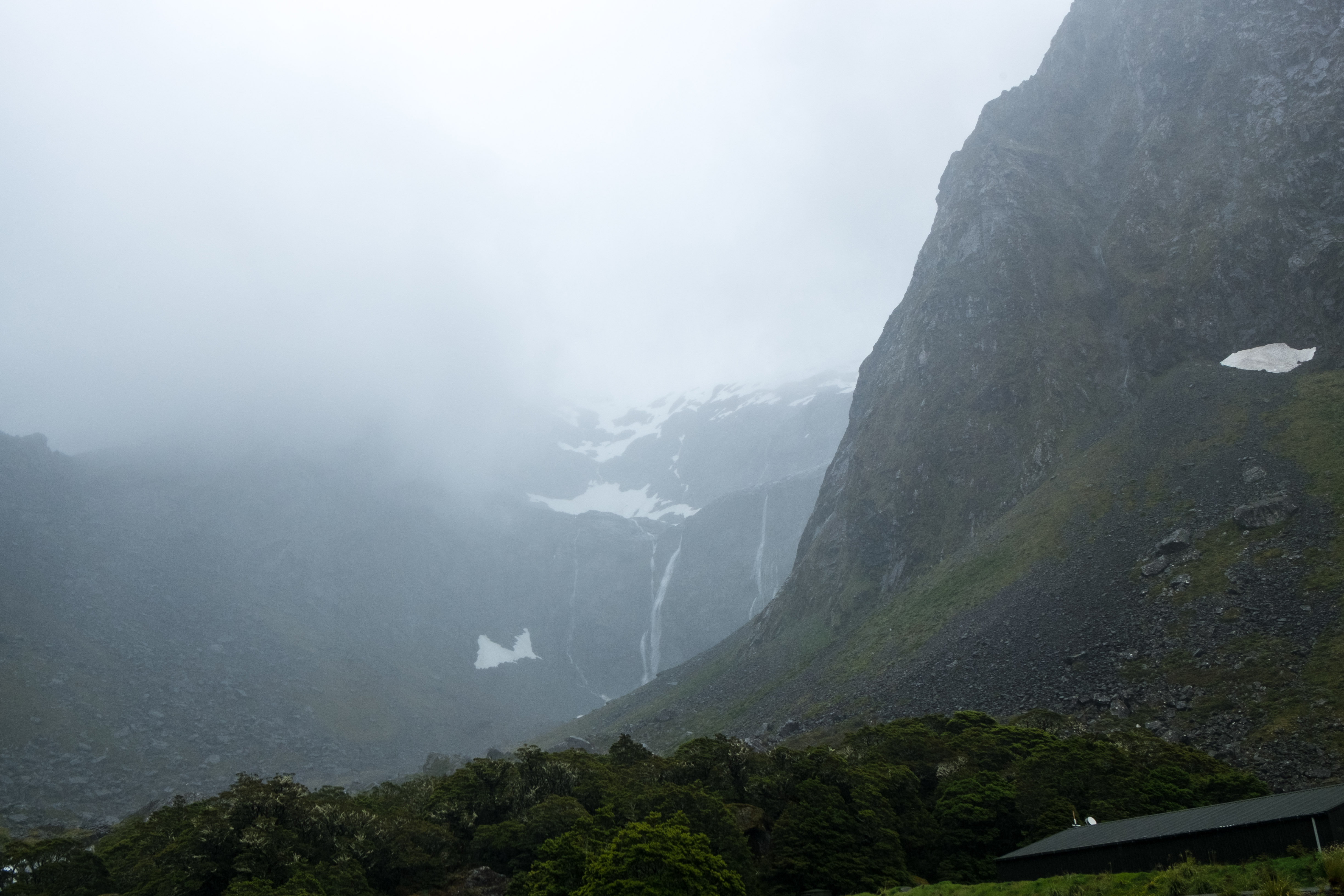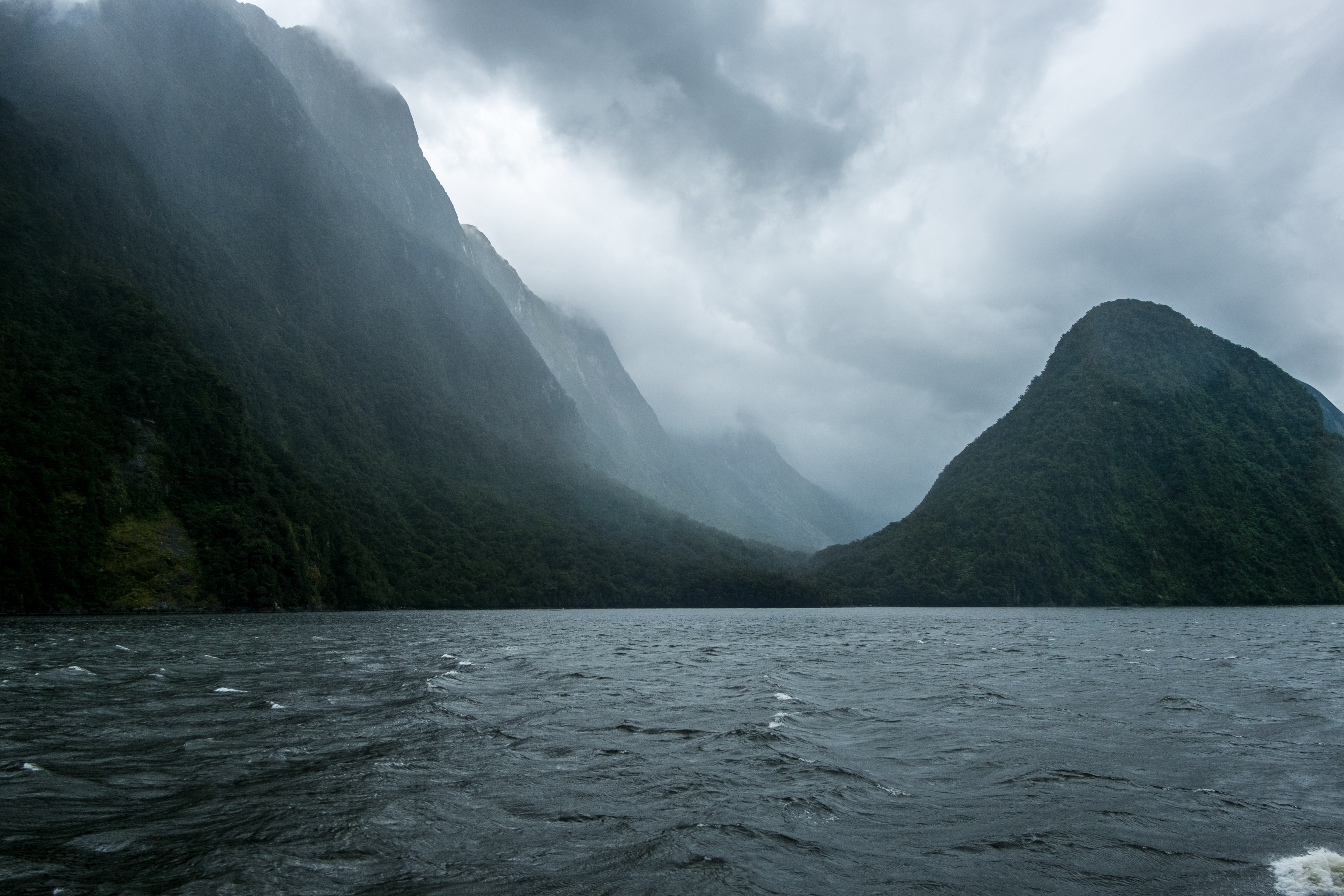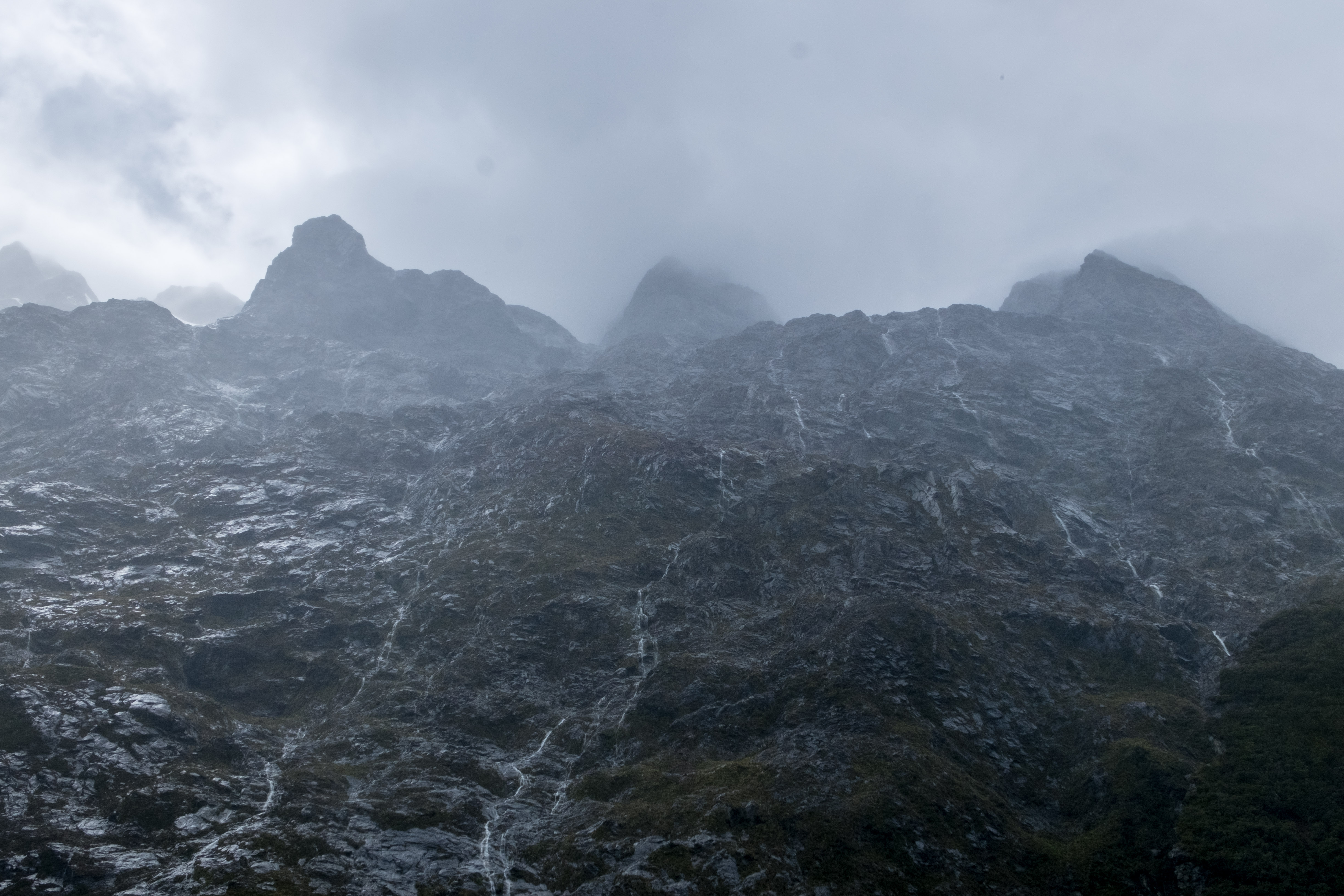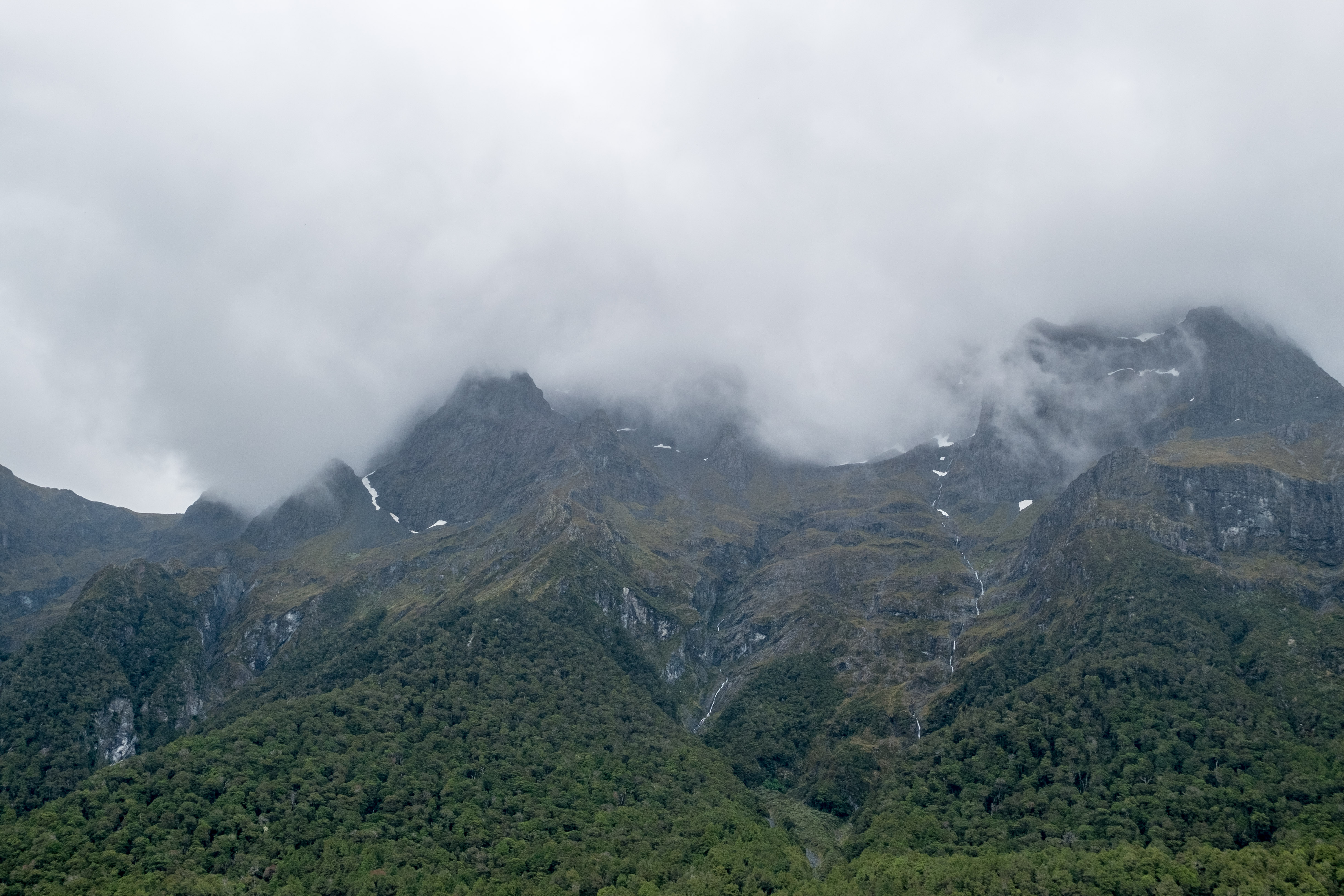 Durant notre visite cette fois pas de grand soleil mais, à la place, un ciel nuageux au début et même de la pluie pendant les dernières 45 minutes. En effet la région des fjords néozélandais est connue pour être particulièrement pluvieuse. Alors aller à Milford Sound implique la plupart du temps d’affronter la pluie mais c’est aussi ce qui fait son charme. Le voile brumeux donne une dimension mystique à cet incroyable décor et la pluie alimente les très nombreuses cascades.