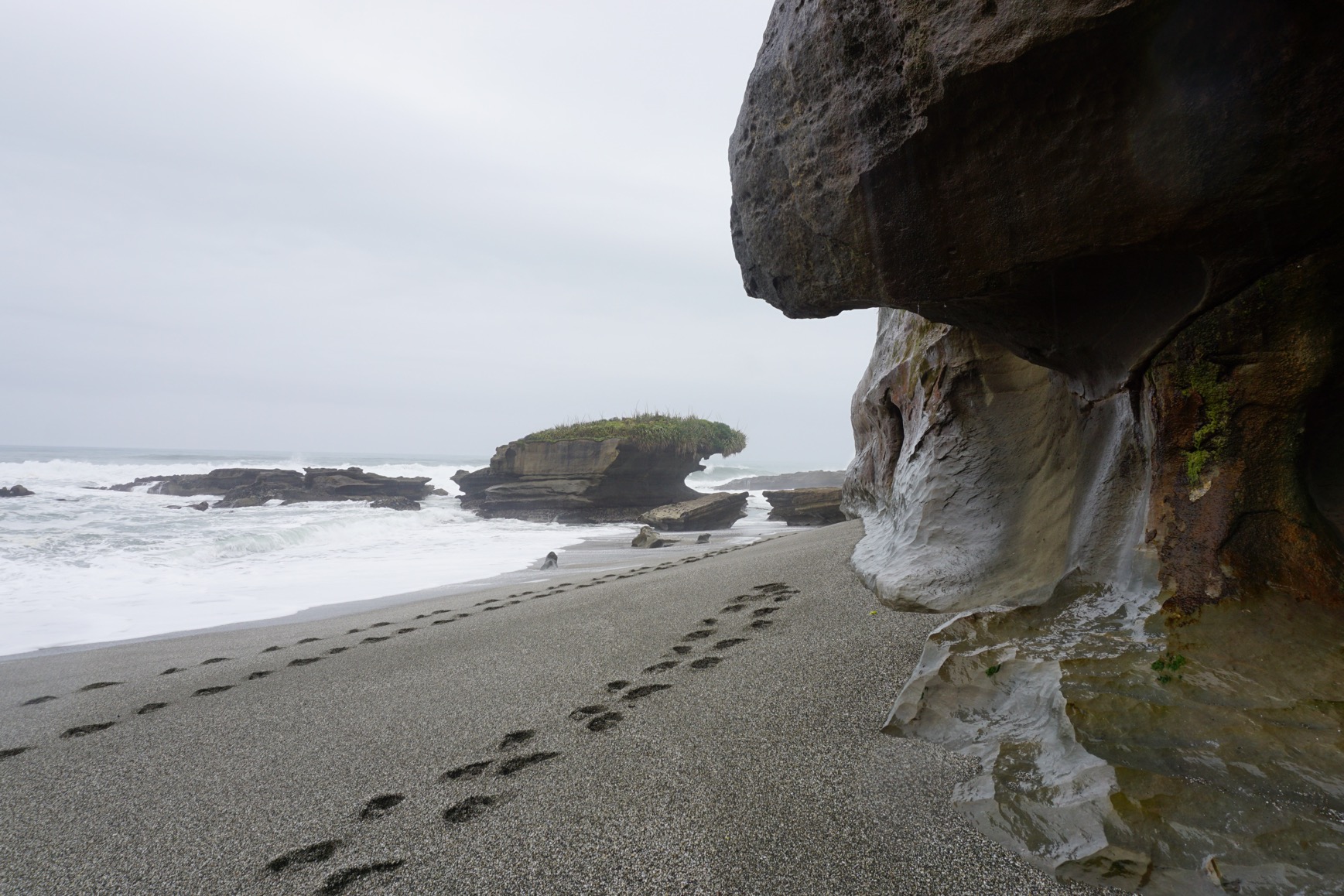 Juste avant d’aller voir les Pancakes Rocks nous nous arrêtons une deuxième fois en chemin pour prendre le temps de faire la Truman Track à Punakaiki. Cette marche de 1400 mètres aller-retour nous fait traverser le bush avant de pouvoir contempler l’océan. La partie dans les bois se fait facilement en fauteuil roulant avec l’aide d’une personne pour pousser car, même si la plupart du temps le sol est plat, il a quelques pentes assez raides. Le sol est recouverts de petits graviers compactés. La progression est donc assez facile… jusqu’à la sortie du bois ! A partir de ce point là il est impossible de continuer en fauteuil roulant car il y a une quinzaine de marches à descendre avant d’arriver sur des rochers à la surface glissante. Pour moi la balade s’arrête ici, au pied de la plage. Pour accéder à celle-ci il faut descendre sur des roches très irrégulières. Franck reste avec moi et nous regardons la mer déchainée rencontrer la côte. Pendant ce temps là Dimitri se balade sur cette plage de sable noire où les falaises semblent rabotées par les lames des vagues.