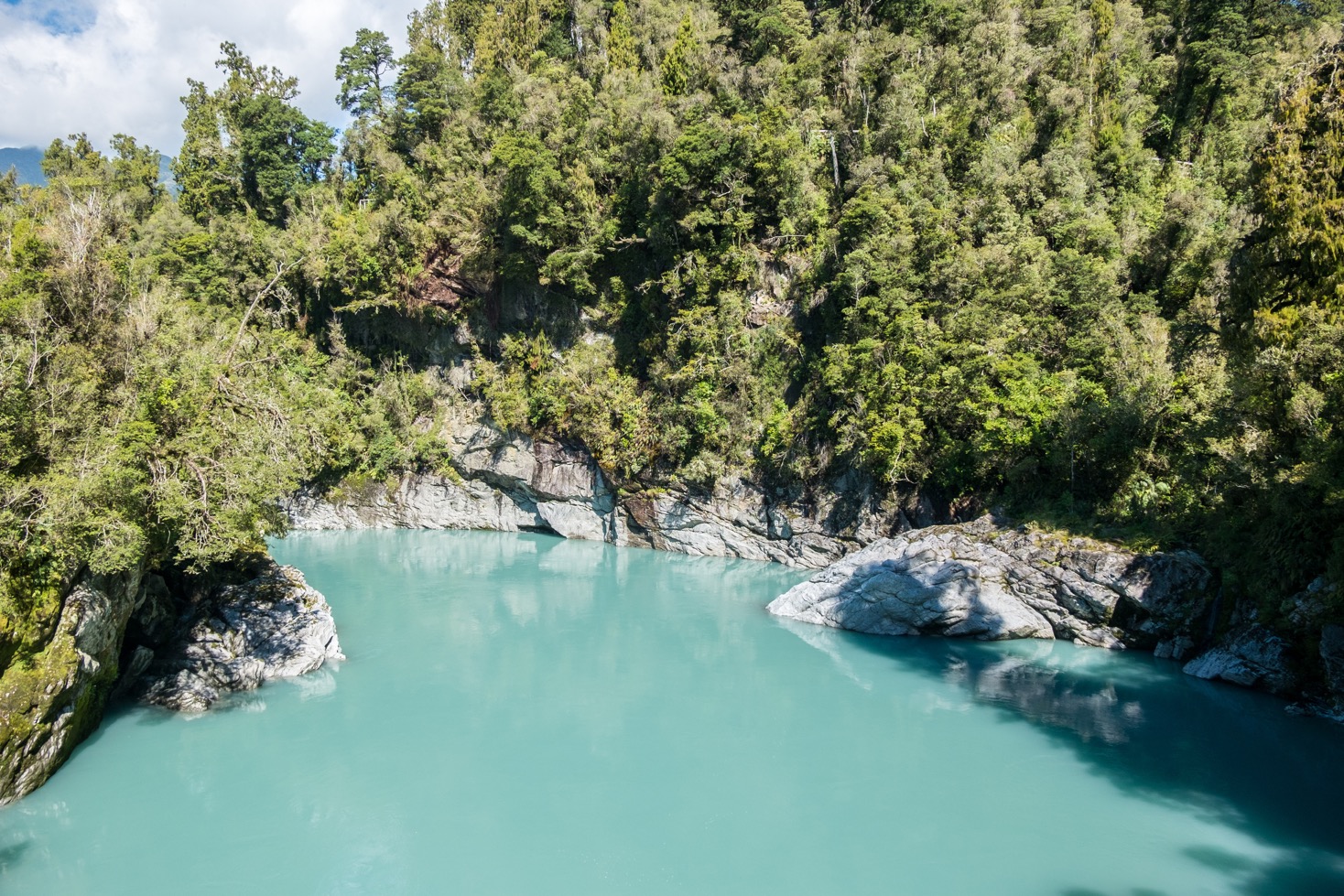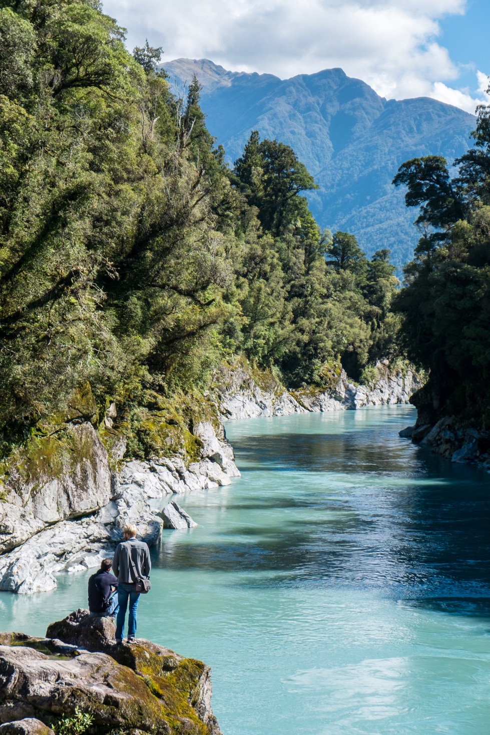 Nous voilà arrivés aux gorges d’Hokitika. C’est la première fois que je vois une rivière à la couleur bleue turquoise lactée ! Assez intriguant. Des panneaux d’information le long de la marche expliquent que cette couleur est le résultat du mélange des pierres de schistes et de calcaires effritées avec la glace fondue du glacier et l’eau de la rivière. C’est super beau ! D’autant plus avec les falaises venant enclaver la rivière. Un superbe moment donc malgré la présence des sandflies qui n’ont pas hésité à attaquer Dimitri lorsqu’il prenait des photos !