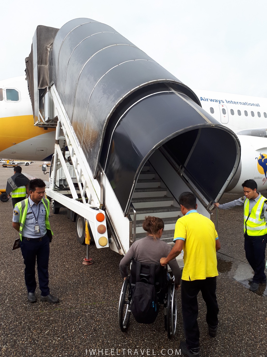 • Les terminaux de l’aéroport de Rangoun sont accessibles en fauteuil roulant. Aux départs et aux arrivées des terminaux internationaux il y a des ascenseurs et des sanitaires adaptés permettant de se transférer latéralement du fauteuil aux toilettes. Au terminal domestique il y a un ascenseur puis une rampe afin d’atteindre le tarmac où une navette équipée d’une rampe vous attend pour vous amener à votre avion. En effet les vols internes se font à bord de petits avions et l’embarquement se fait donc depuis le tarmac ce qui nécessite de monter un escalier. Durant tout le processus un membre du personnel de l’aéroport vous accompagnera. Pour les vols internationaux j’ai toujours pu embarquer par une passerelle.
