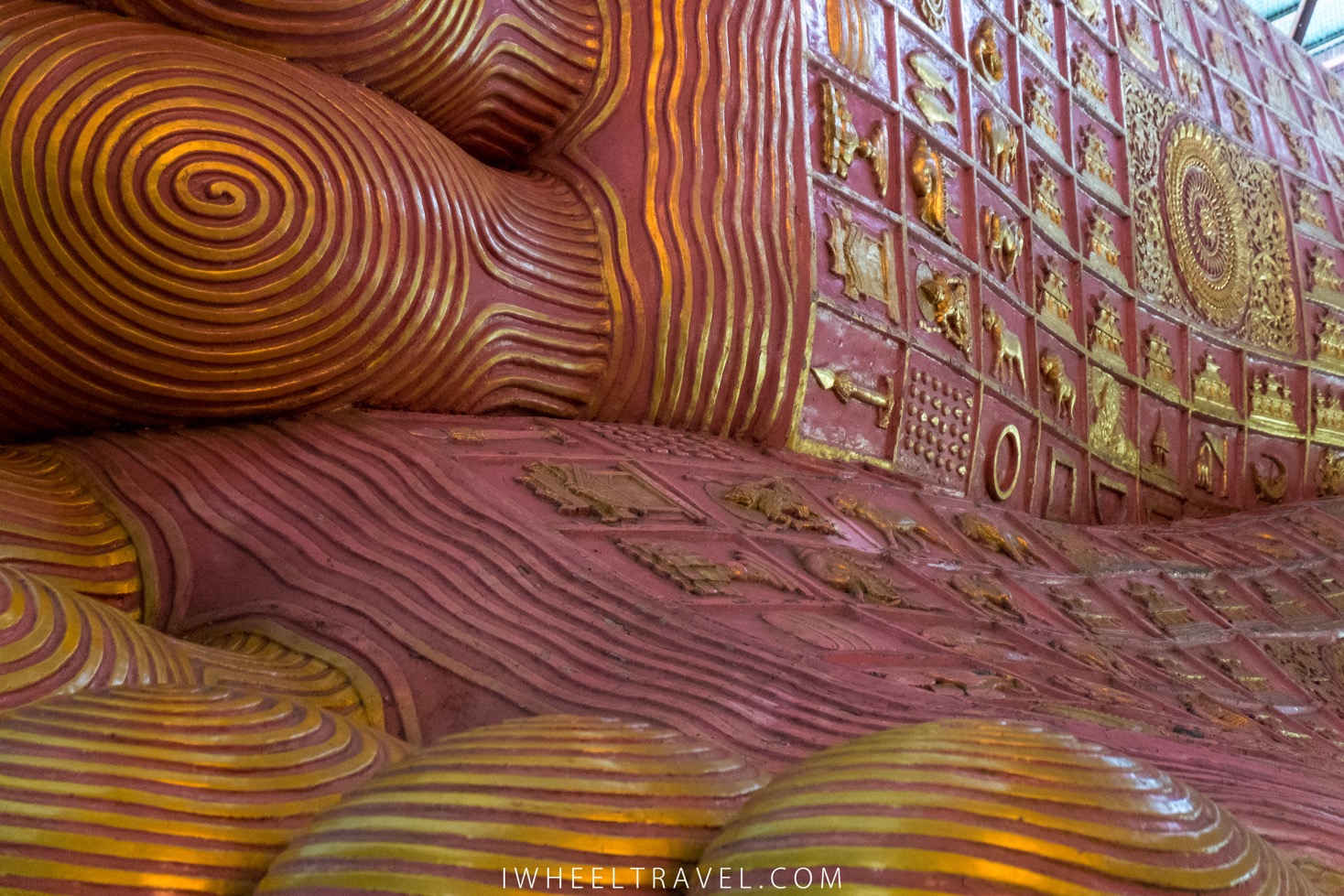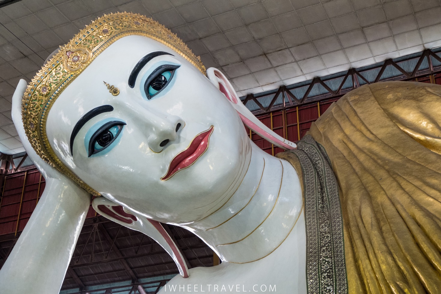 Si Rangoun a des caractéristiques que l’on retrouve dans toute grande ville du globe, son identité birmane est bien présente. Comme partout dans le pays, on trouve bien sûr des temples et autres lieux de cultes bouddhistes un peu partout dans la ville. Nous commençons donc notre journée par la découverte du grand bouddha Chaukhtatgyi. Absolument gigantesque ! La statue du bouddha allongé fait 66 mètres de long et, encore une fois, elle est en grande partie recouverte d’or. Le lieu est entièrement accessible en fauteuil roulant.