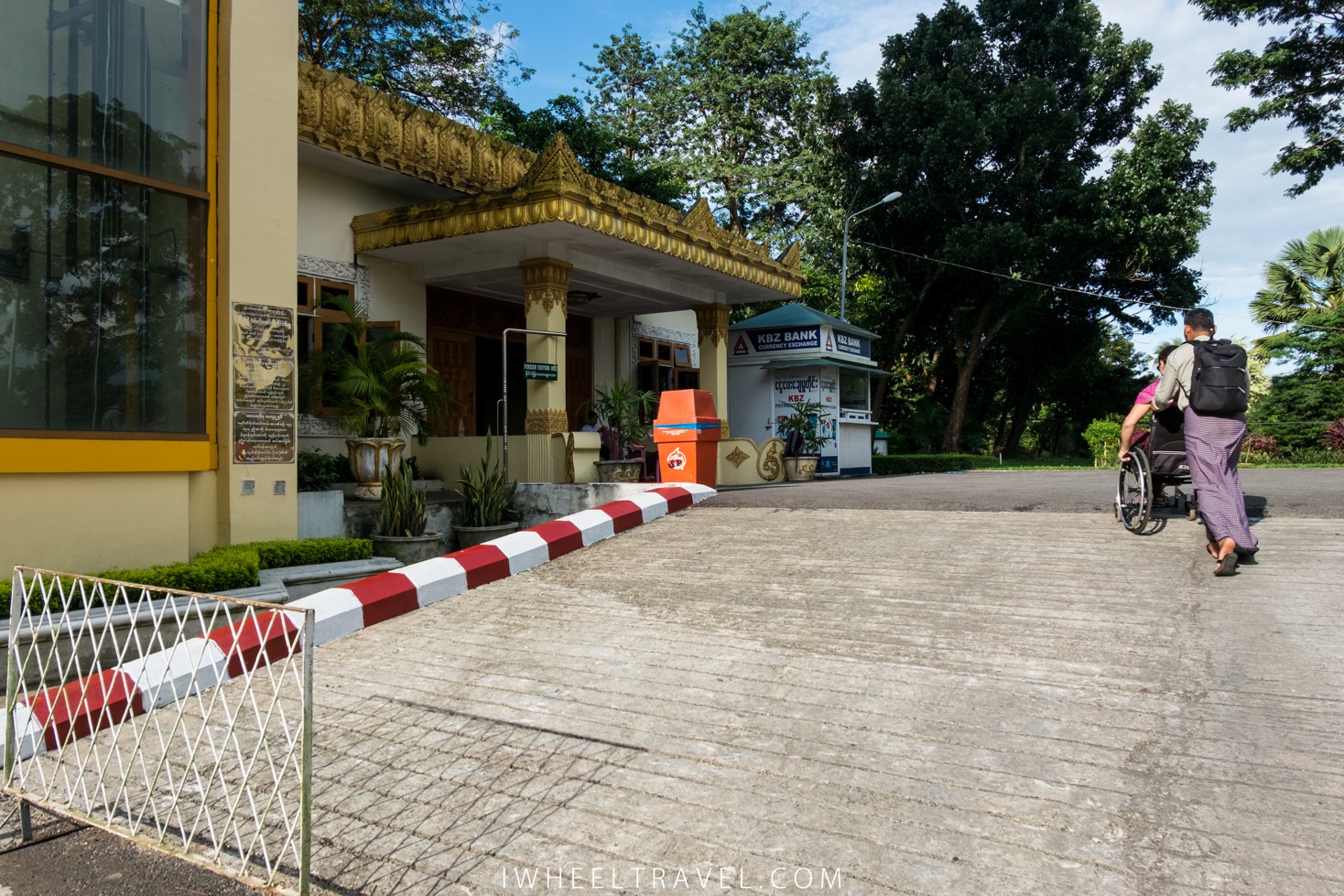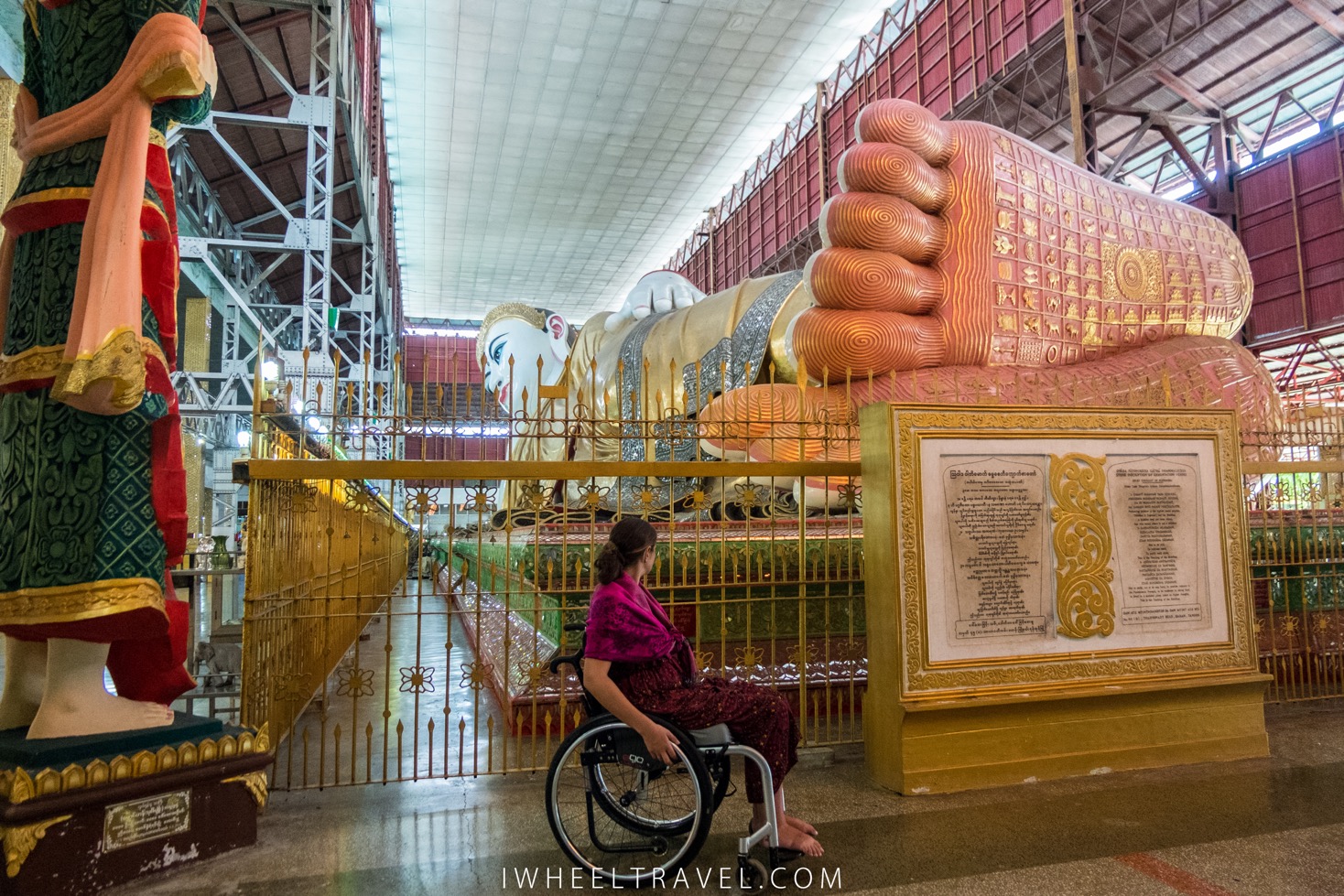 La pagode Shwedagon se visite facilement en fauteuil roulant. Il y a des ascenseurs à trois endroits différents pour accéder au niveau de la pagode. J’ai utilisé ceux situés entre les escaliers sud et est. En arrivant en haut il y a des sanitaires. Ils ne sont pas spécialement adaptés pour les fauteuils roulants mais assez larges pour se transférer latéralement du fauteuil aux toilettes. Par contre il n’y a pas de barre d’appui et une rampe transportable est nécessaire pour y accéder.