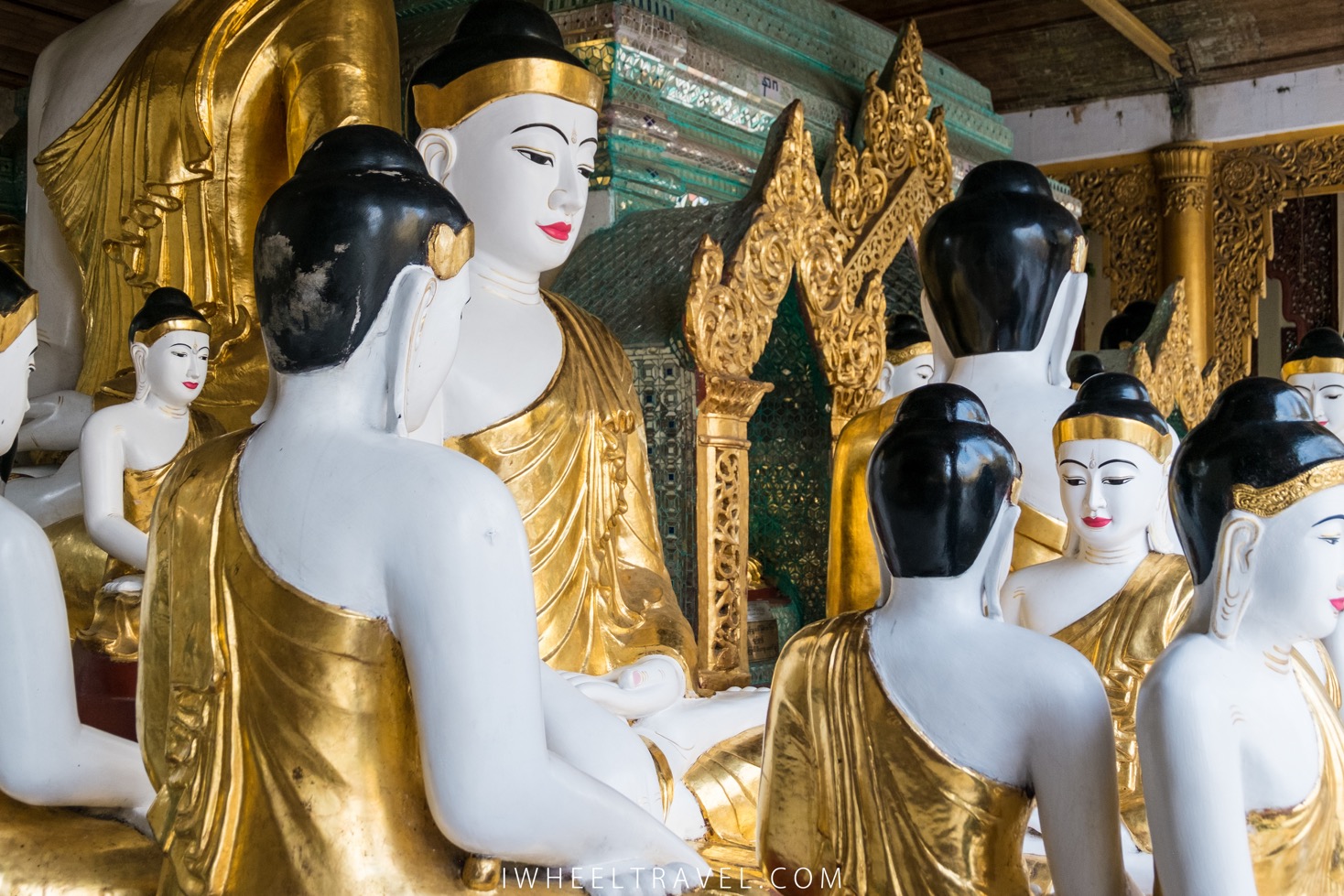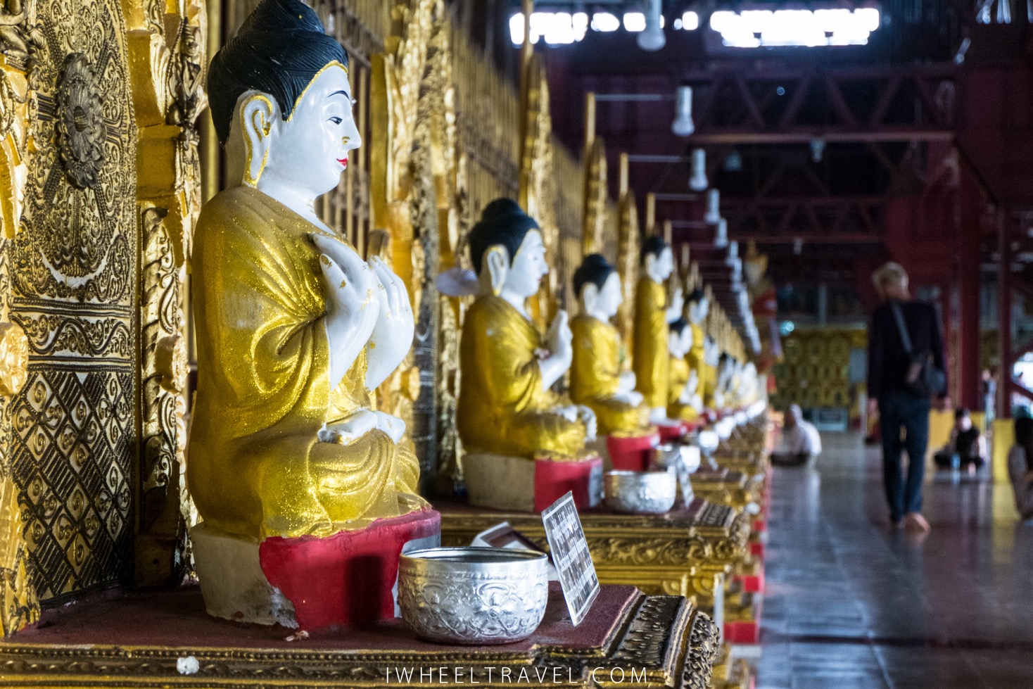 Beaucoup de Birmans viennent ici pour prier, se recueillir ou juste pour échapper à la chaleur. Il fait plus frais ici que dans les maisons. Certains d’entre-eux prient face à cet énorme bouddha et d’autres préfèrent se recueillir plus au calme devant l’une des nombreuses petites statues alignées derrière le grand bouddha, chacune favorisant la prière dans un domaine particulier. Mais peu importe le lieu ou le sujet de la prière un bouddhiste ne doit pas prier pour lui ou pour ses proches en premier. Il se doit d’être altruiste et de prier d’abord pour des personnes qu’il ne connait pas. Ainsi notre guide nous expliquait qu’il est possible de prier pour la population de telle ou telle ville par exemple.