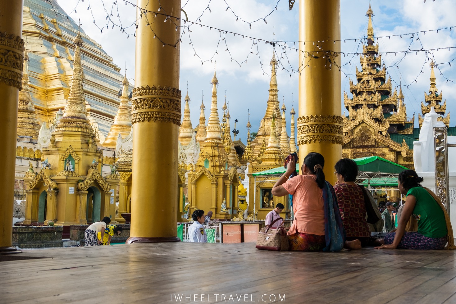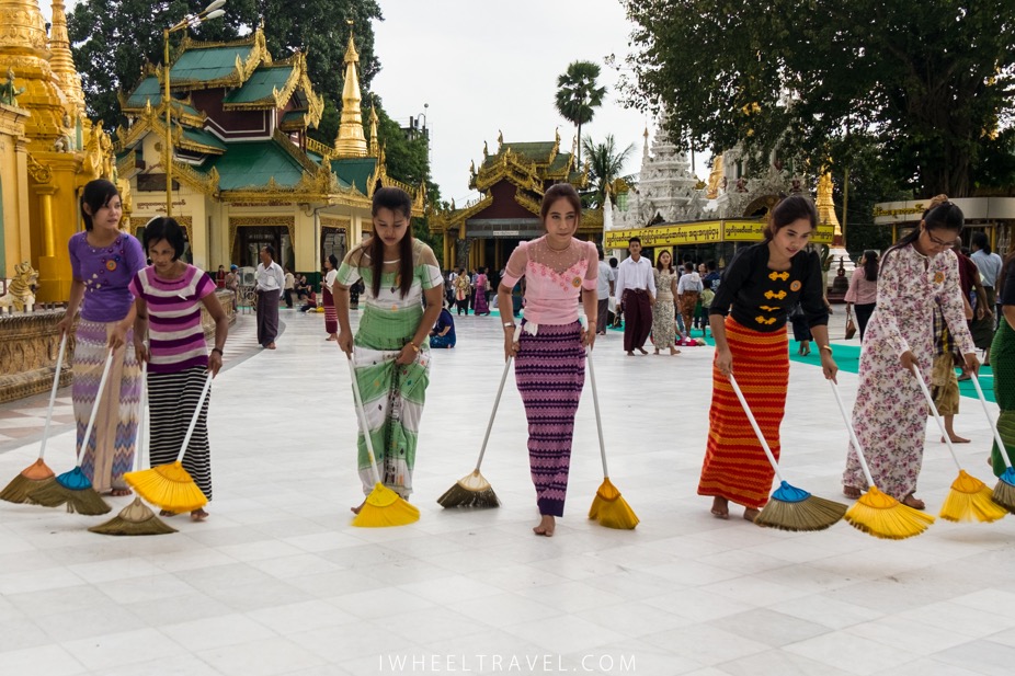 La pagode centrale est bien sûr le clou du spectacle mais cela vaut le coup de se promener un peu partout autour car il y a pleins de plus petites pagodes à découvrir et surtout parce que l’on assiste à plein de scènes de vie. Alors que de nombreuses personnes prient agenouillées, d’autres suivent des cours de méditation et certains moines montent sur la pagode pour la nettoyer. Nous avons même assisté au nettoyage du dimanche : plusieurs femmes s’alignent équipées chacune d’un balai et avancent côte à côte, faisant ainsi le tour la pagode. C’est assez drôle !