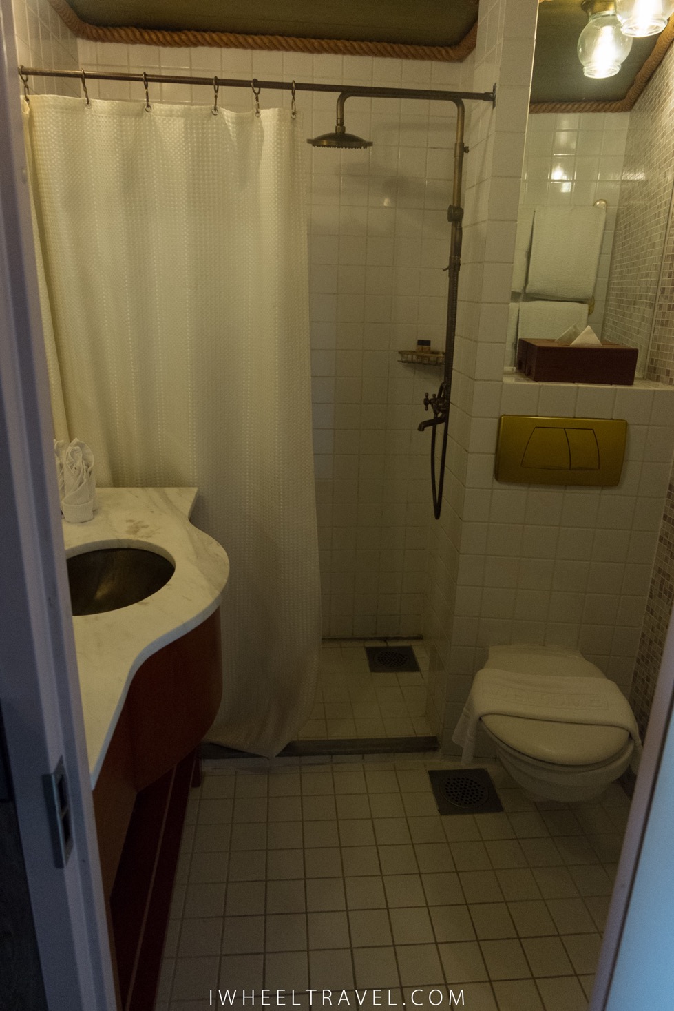 • Côté hébergement nous avons dormi au Vintage Luxury Yacht Hotel, construit dans un paquebot nous faisant voyager au début du 20ème siècle tout en restant bien ancré, à quai. On se seraient presque cru sur le Titanic ! Accéder au bateau se fait facilement par un long chemin. Il est en pente mais cela ne pose pas problème car un membre du personnel de l’hôtel est toujours là pour aider. A l’intérieur du bateau il y a des ascenseurs pour se rendre d’un étage à l’étage, au bar et au restaurant. Pour entrer au restaurant il y a un rebord de 2/3cm de haut à passer. Pour vous rendre à votre chambre je vous conseille de faire appel à un membre du personnel car les portes des couloirs sont lourdes et difficiles à manipuler. La chambre est assez grande pour y circuler en fauteuil roulant mais la porte pour y entrer n’est pas large. Avec mon fauteuil roulant j’ai pu y entrer tout juste mais certains fauteuils roulants ne passeront pas. Entrer dans la chambre n’est donc pas facile, d’autant plus qu’il y a un rebord. Il en est de même pour accéder au balcon et à la salle de bain qui n’est pas adaptée.