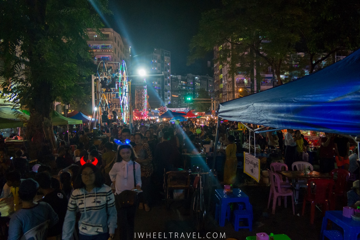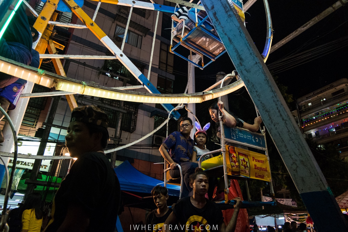 Quelques jours plus tard, la nuit tombée, l’ambiance a bien changé. La fête des lumières, connu sous le nom de festival Thadingyut, vient de commencer et les rues du centre-ville débordent de monde. Pendant plusieurs jours, chaque année, les bouddhistes du pays vont célébrer le retour de Bouddha sur terre après plusieurs mois passés à enseigner la philosophie bouddhiste à sa mère au paradis. Mais comme nous partons le lendemain nous ne verrons qu’une petite partie des festivités. Néanmoins nous pouvons ressentir l’engouement de la population qui s’amasse dans les rues, pose des bougies dans les pagodes ou sur les balcons et vient profiter des manèges et stands de nourriture.