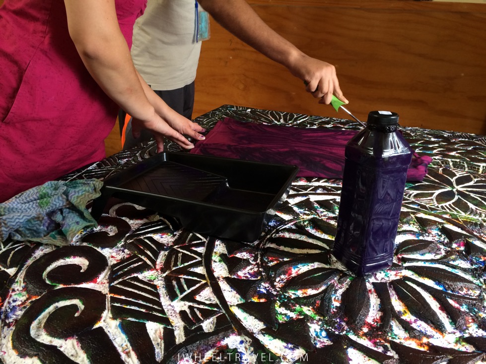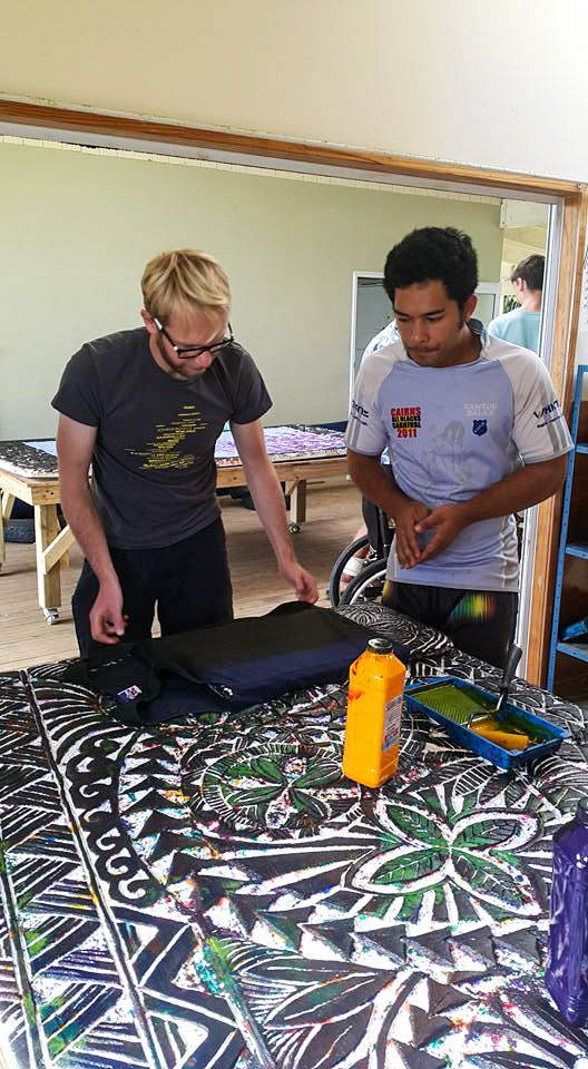 Heureusement au Creative Centre on est bien loin de penser comme cela. Ici l’ambiance est bonne et l’on encourage chacun à s’exprimer et à s’épanouir. Tous les jours il y a un programme dans lequel les étudiants sont impliqués. Ceux qui ne sont pas en mesure d’y participer ne sont néanmoins pas laissés de côté puisqu’au moins l’un des travailleurs restera avec eux. Le programme quotidien implique souvent une activité artistique. Cela peut-être un cours de peinture, de musique, de chants, de culture maorie ou encore de poterie. Le jour où nous sommes venus c’était activité teinture de paréos et de t-shirts. Nous avons donc appris comment teindre des paréos et nous avons aidé les étudiants dans cette tâche. Les paréos sont ensuite revendus au marché ce qui permet de percevoir des fonds pour le bon fonctionnement du centre.