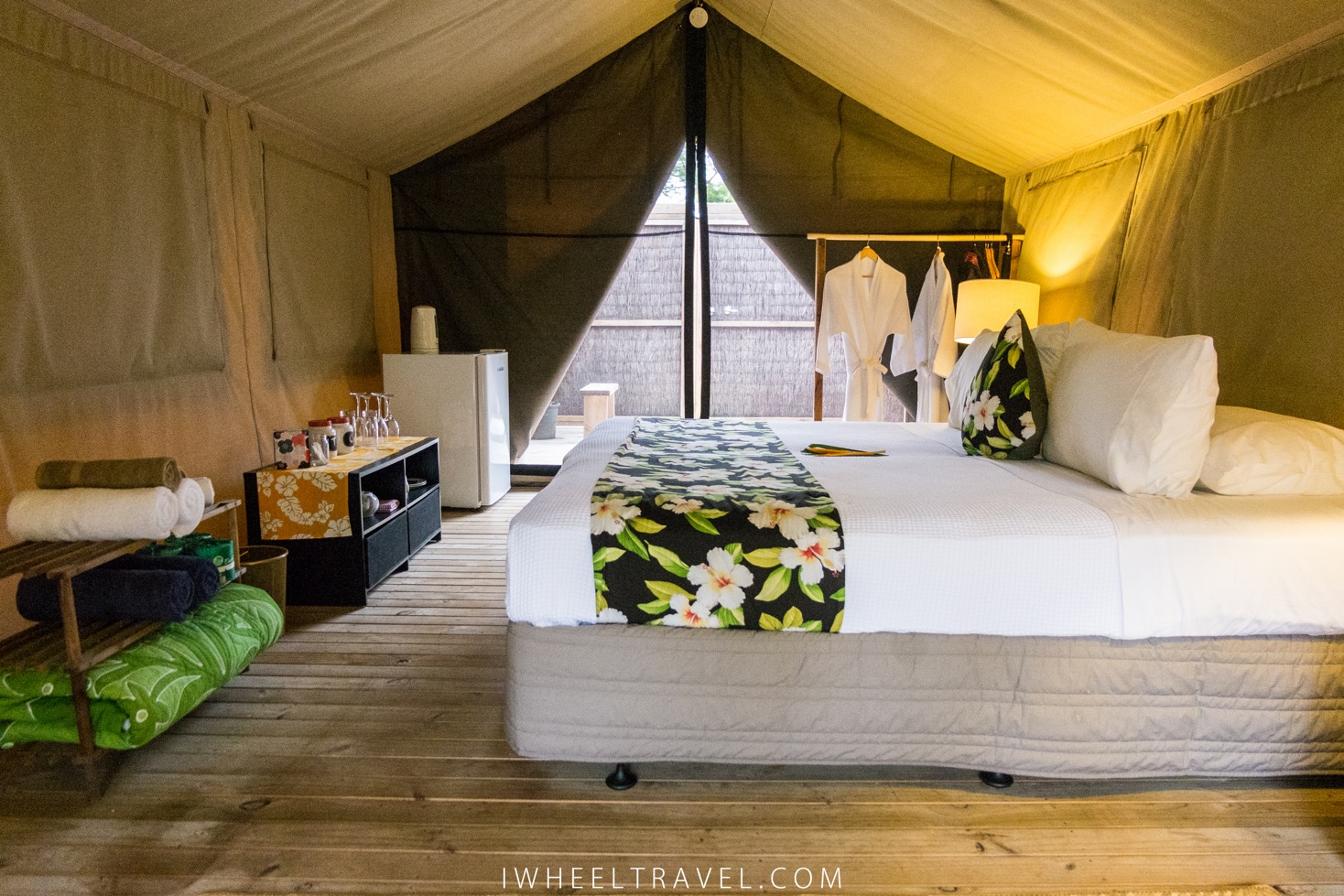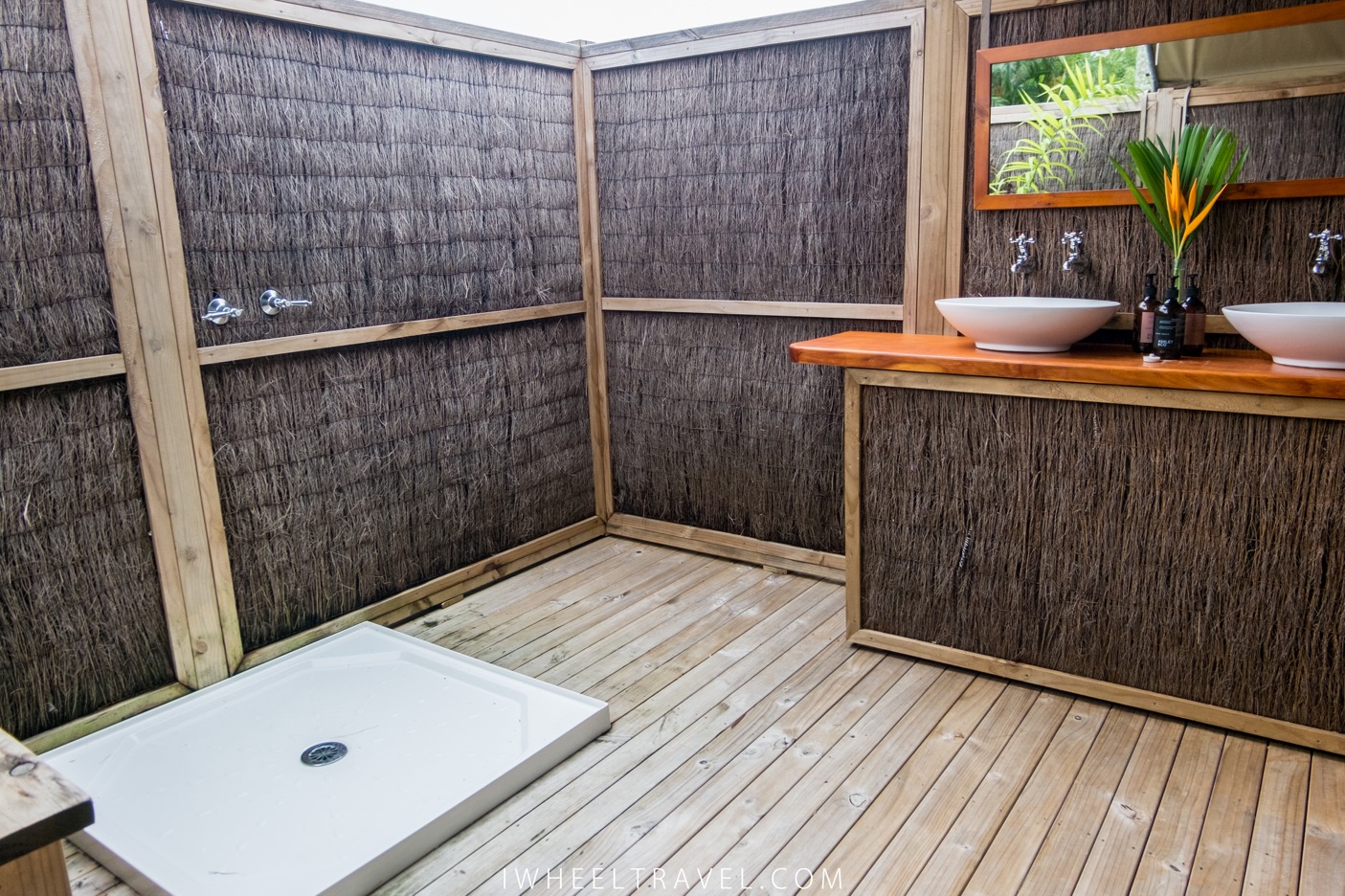 Toutes les informations qui précèdent m’ont été communiquées par les hôtels mais je n’ai pas séjourné dans ces établissements car les tarifs appliqués sont au dessus de nos moyens. A la place nous avons séjourné à « Ikurangi Eco Retreat » pour un tarif un peu moins élevé de 249$NZ la nuit (158€). Cet établissement n’est pas du tout accessible en fauteuil roulant. Il y a des marches pour entrer dans chaque logement et les salles de bain ne sont pas adaptées. Nous avons choisi de réserver chez eux car c’est un établissement portant une particulière attention au tourisme durable. Ici pas de clim, les produits de douches sont organiques et l’on dort dans des studios de type polynésien ou des tentes de luxes avec douches à l’extérieur. Nous avions réservé un studio mais pour des raisons inconnues nous avons été surclassés gratuitement en tente. Je ne regrette pas du tout d’avoir choisi ce logement ! En plus du cadre parfait, les propriétaires ont vraiment été très attentionnés avec nous durant tout notre séjour. Ils nous ont attribué la tente la plus proche du parking qui est également celle qui a le moins de marches et ont ajouté un banc pour la douche. Ils nous ont également conduit au supermarché à notre arrivée car comme c’était un dimanche il n’y avait quasiment pas de bus.