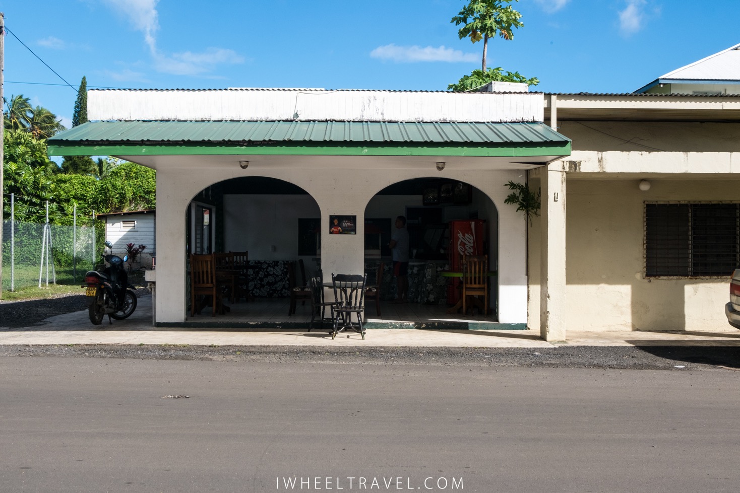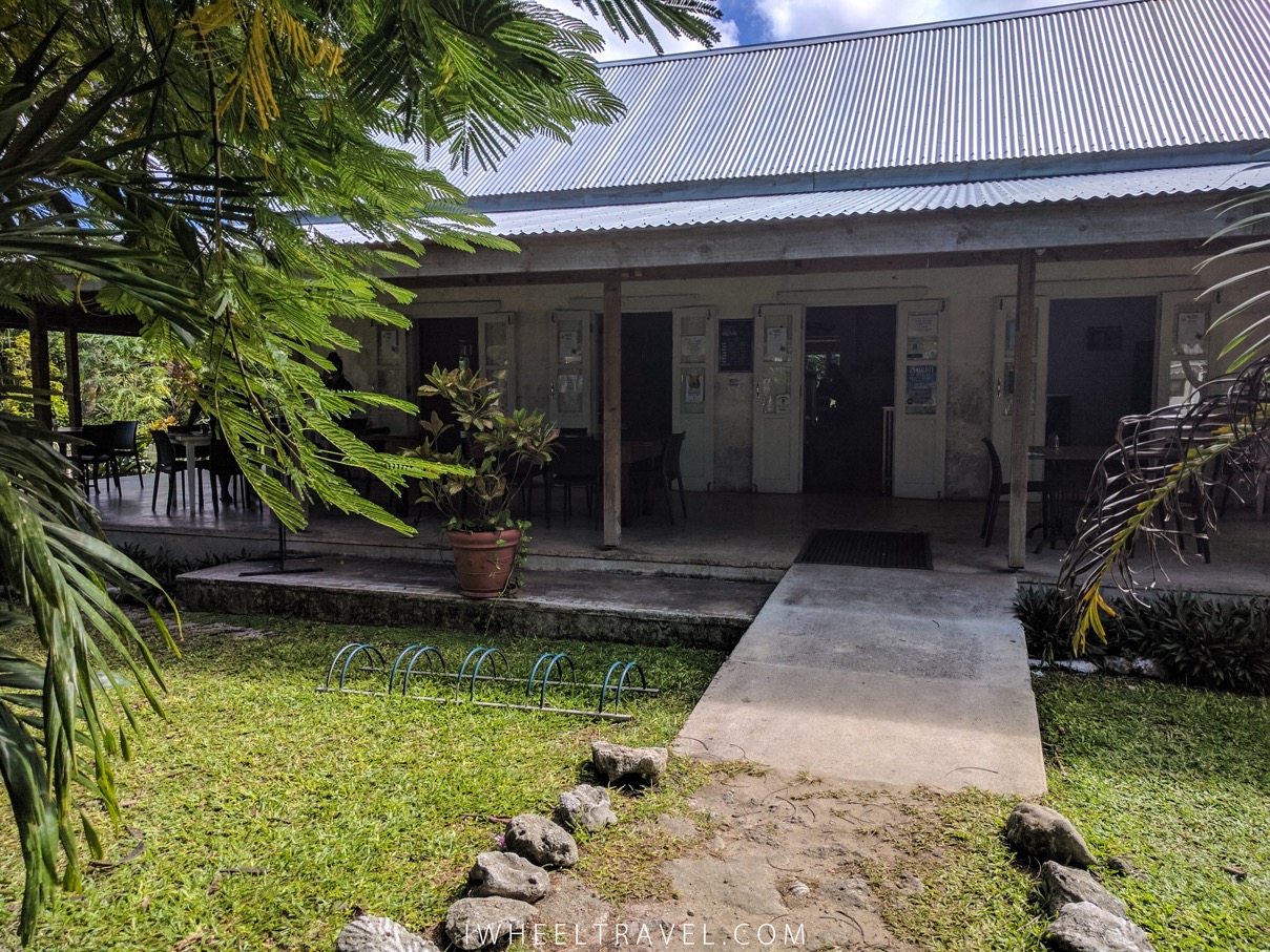 Beaucoup de commerces et de restaurants ne sont pas accessibles mais la pharmacie CITC à Avarua, les commerces adjacents à celle-ci et le restaurant « LBV- Le Bon Vivant » à Muri Beach sont accessibles. Au LBV il y a une rampe d’accès mais avant d’atteindre celle-ci il faut déjà réussir à faire quelques metres sur un sol avec des racines d’arbres qui gênent. Pour les restaurants une autre solution peut être de manger à l’une des nombreuses terrasses et de demander à un serveur d’aller commander pour vous lorsque le service et le paiement se font au comptoir. En effet il existe des établissements dont seule la terrasse est accessible.