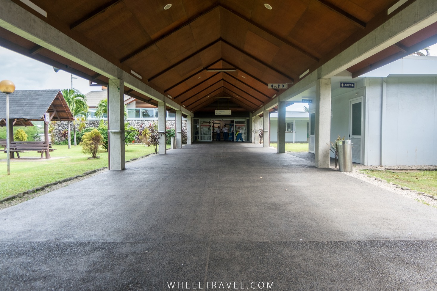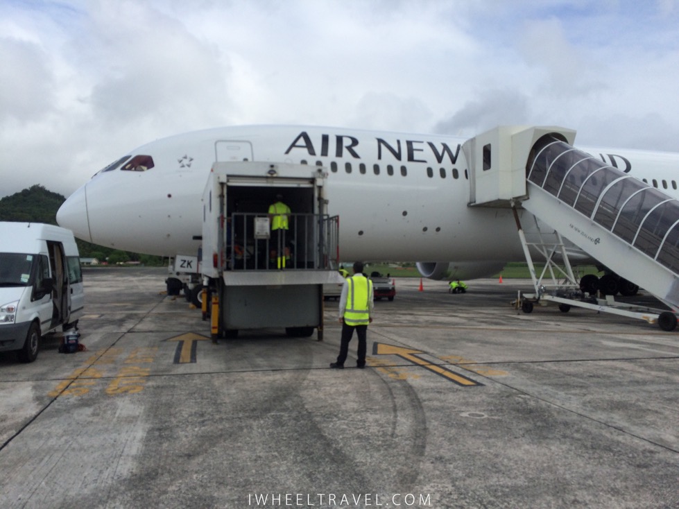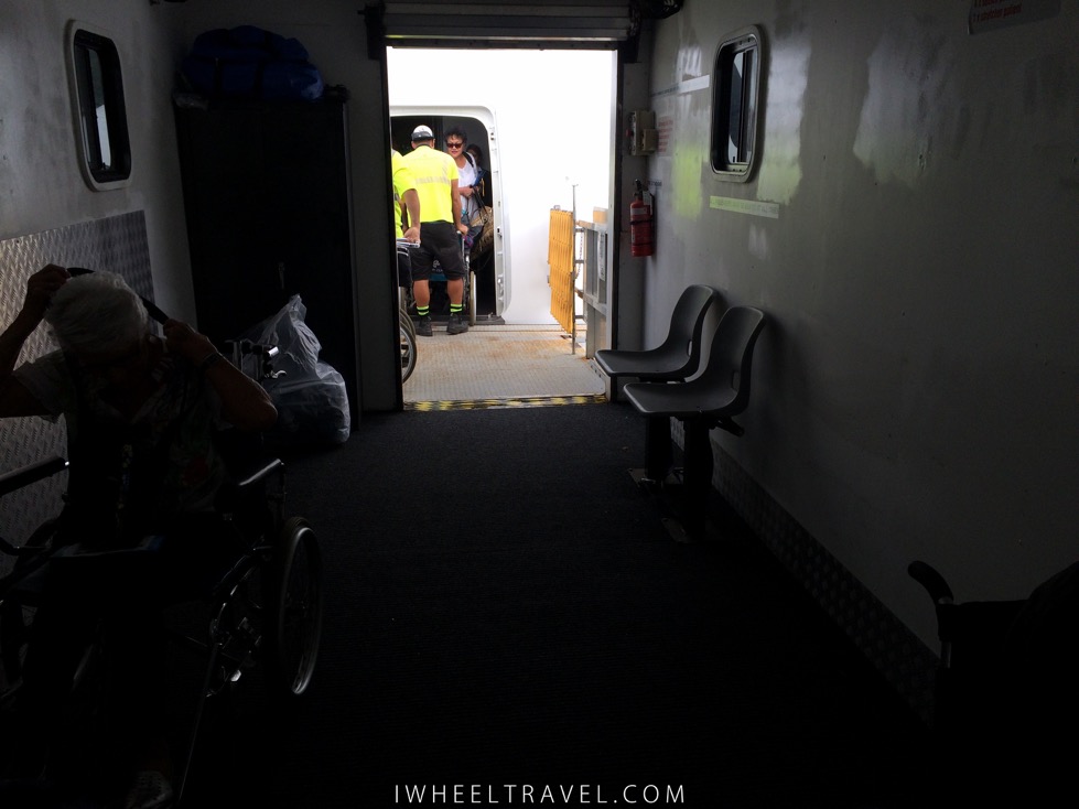 Quelques minutes avant d’atterrir une annonce au micro nous informe qu’il va falloir descendre de l’avion par des escaliers comme il n’y a pas de passerelle. Et oui l’aéroport de Rarotonga est vraiment tout petit mais pas de panique tout est prévu ! A la sortie de l’avion on m’apporte mon fauteuil roulant et je monte avec toutes les autres personnes à mobilité réduite dans un ambulift (véhicule équipé d’un ascenseur) qui nous descend jusqu’au tarmac. Une fois dans l’aéroport aucune difficulté. Il n’y a pas d’étage donc pas besoin de chercher un ascenseur. Il y a des toilettes accessibles à l’intérieur, aux arrivées et aux départs, ainsi qu’à l’extérieur des terminaux. L’arrivée s’est donc très bien passée. Ma seule déception a été de ne pas recevoir un collier à fleur de bienvenue comme ceux qu’on reçus les autres passagers à la sortie des escaliers sur le tarmac.