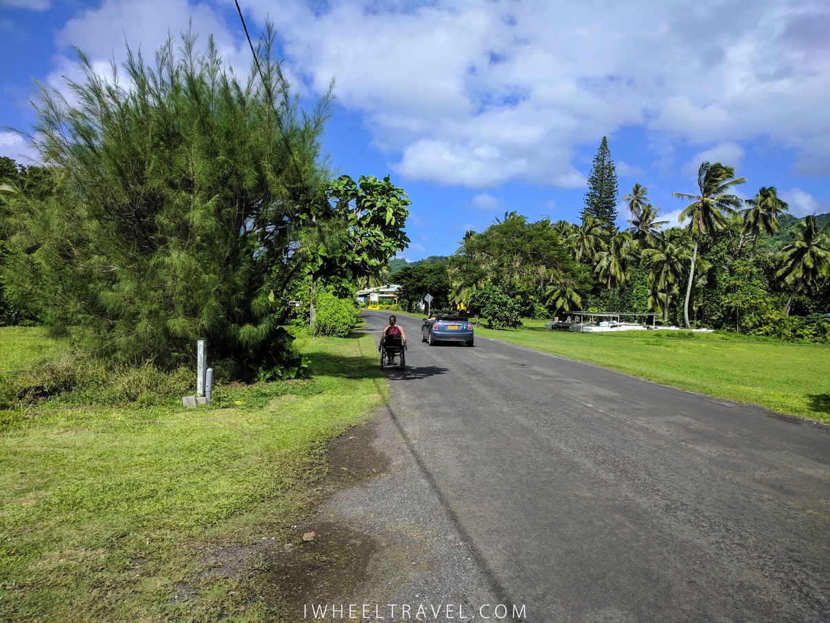 Du côté de la voirie et de l’accessibilité des bâtiments ce n’est pas trop ça non plus. On ne trouve que rarement des bateaux d’accès pour descendre et monter des trottoirs. La plupart du temps qu’il est possible de monter sur un trottoir c’est car il y a une sortie de garage. Au final c’est parfois plus simple de rouler avec son fauteuil roulant sur la route ! En plus ça ne semble déranger personne. La route principale qui fait le tour de l’ile est goudronnée donc il est facile de rouler dessus. A l’inverse il est difficile d’avancer aux marchés de Muri Night Market et de Punanga Nui Market car le sol est revêtu de graviers. Du coté des plages malheureusement pas de surprise : aucune plage ne dispose d’aménagement pour les personnes en fauteuil roulant.