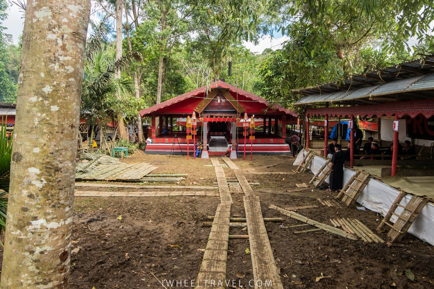 Nous profitons de ce moment calme pour observer la mise en place de l’espace de célébration. En seulement trois jours, des « maisons » temporaires en bambous ont été construites pour accueillir les invités (y compris les touristes). Ces abris sont assez sommaires mais jolis car des décorations rouges les ornent. Toutefois nous sommes surpris de découvrir des bannières de publicité pour des marques de cigarettes… Quoique cela semble moins choquant lorsque l’on sait que l’on voit de la publicité pour les cigarettes un peu partout en Indonésie avec des slogans tels que « Pro never quit » (« Les pros n’arrêtent jamais »)…