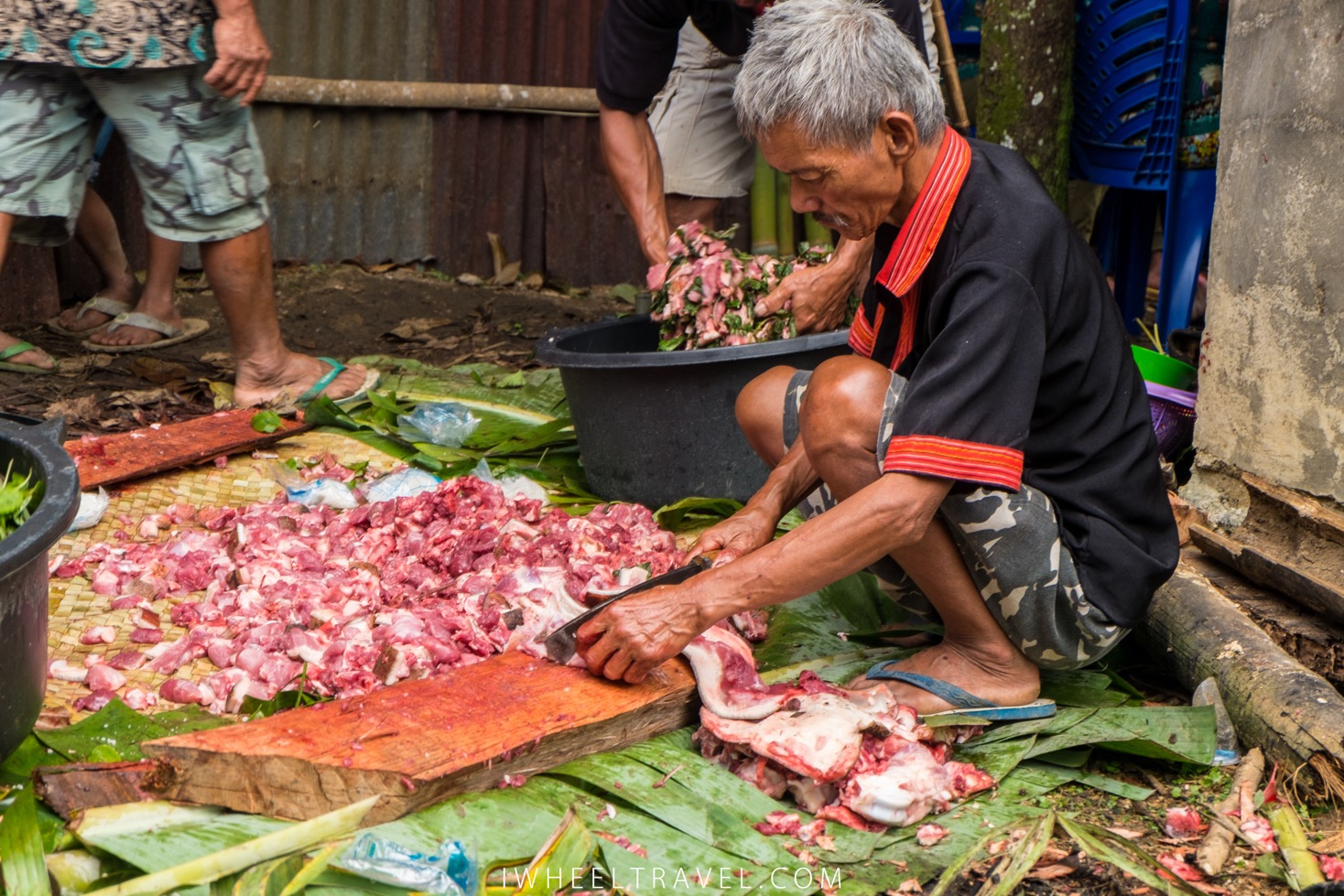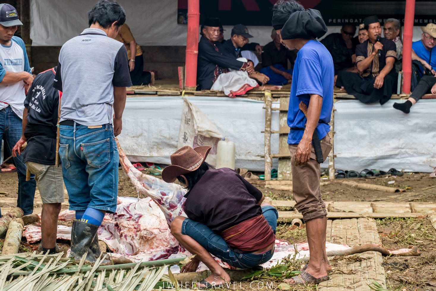 Maintenant la bête gît sur le sol, inerte. Plusieurs hommes arrivent, installent des nattes de bambous au sol près de la bête et commence à lui retirer sa peau. Elle sera séchée puis exportée pour être vendue. Puis les entrailles de l’animal sont retirées, les membres de l’animal sont sectionnés et la viande est coupée en morceaux et placée sur les nattes de bambous. En moins d’une heure il ne reste plus rien de l’animal à part sa tête qui reste sur le sol, à la vue de tous. La viande sera ensuite partagée entre la famille du défunt, les invités et les villageois.