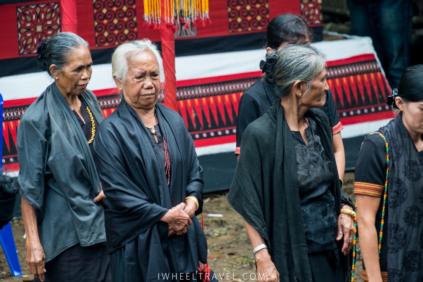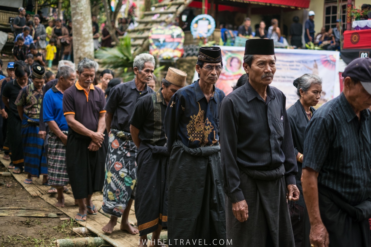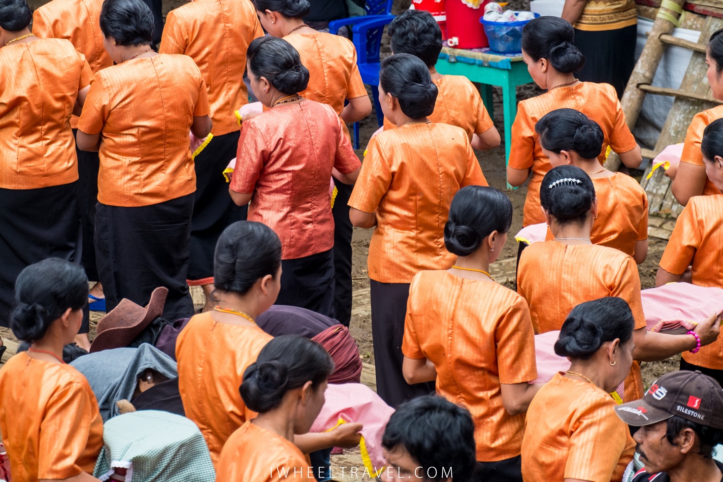 Quelques minutes plus tard la cérémonie commence réellement. Plusieurs processions se mettent en marche vers le bâtiment principal. Les hommes sont habillés en noirs. Beaucoup d’entre-eux sont vêtus d’un sarong qu’ils utilisent pour couvrir leurs jambes et portent un chapeau traditionnel. Pour les femmes je remarque qu’il y a deux tenues différentes. Certaines sont vêtues d’une tenue traditionnelle noire avec quelques broderies aux teintes rouges/orangées : ce sont les membres de la famille directe et leurs proches. Les autres femmes, habillées en longues jupes noires et en hauts oranges, connaissaient également la défunte mais n’entretenaient pas de relations aussi étroites avec elle. Celles-ci, souvent des cousines ou des voisines, veillent à ce que les autres invités ne manquent de rien. Elles aident notamment à servir les repas et les boissons. Les fillettes et les jeunes femmes sont magnifiques. Elles sont vêtues de tenues noires ou rouges ornées par des bijoux de perles. Enfin les invités qui n’ont pas de tenues spéciales sont des personnes plus éloignées de la famille.