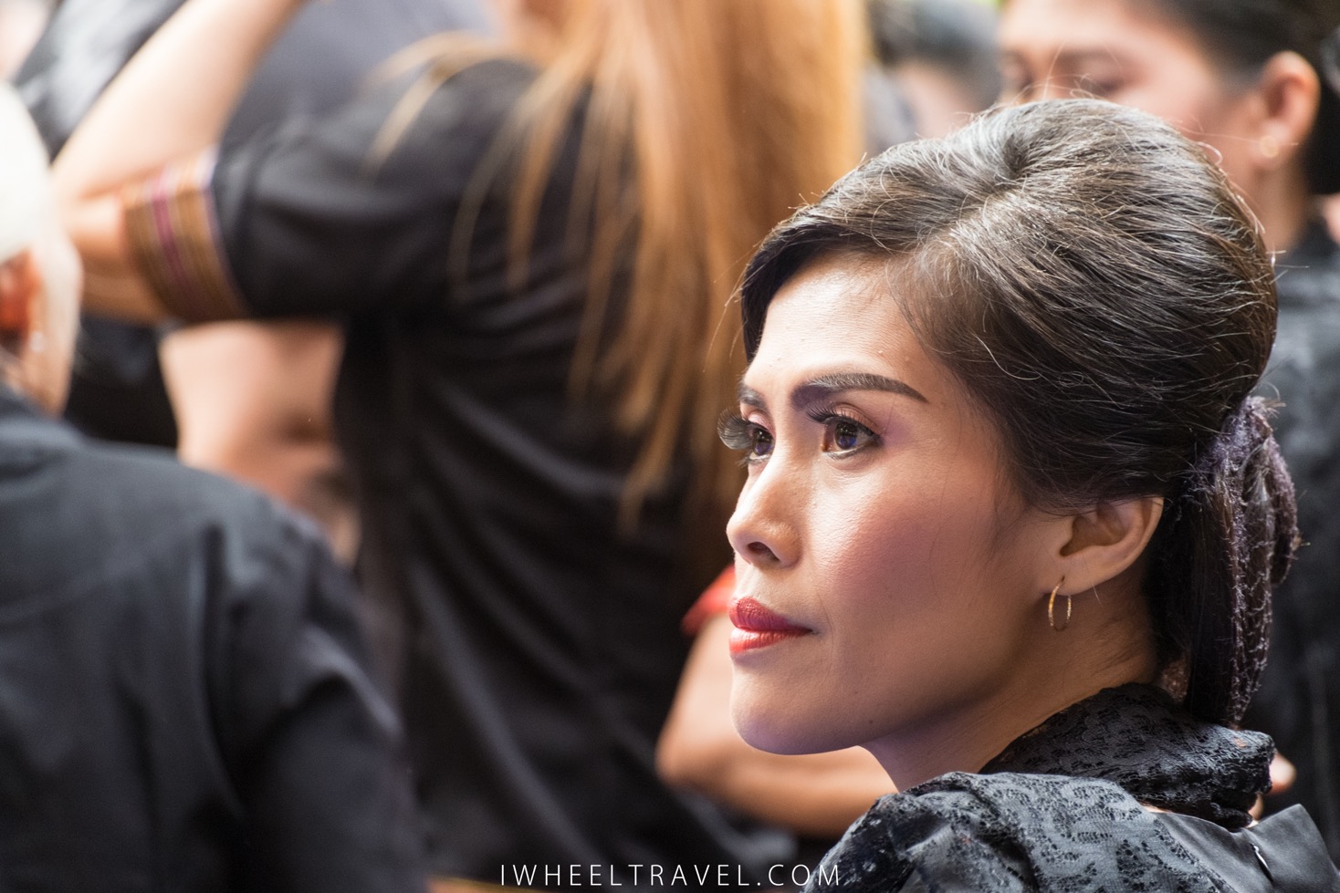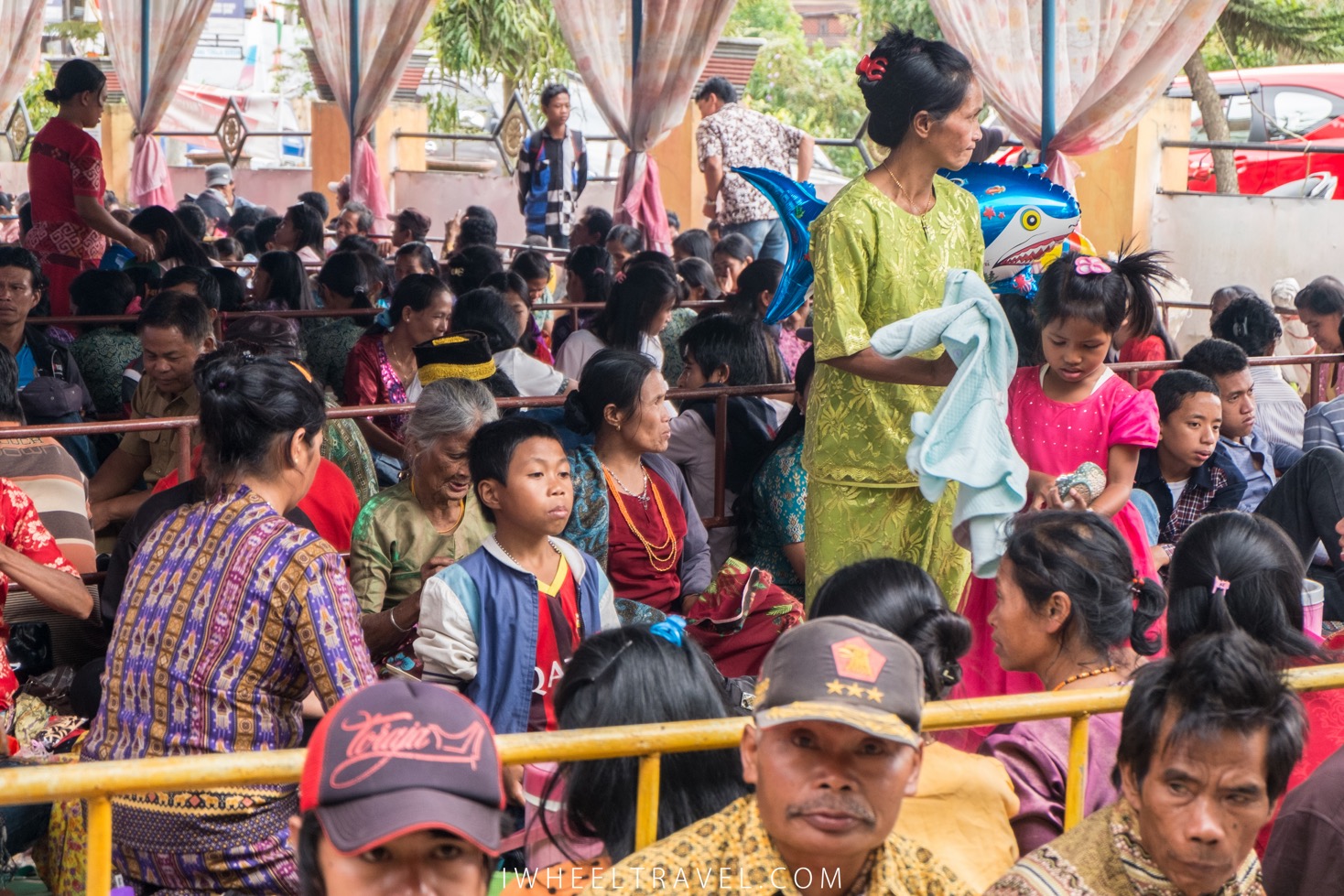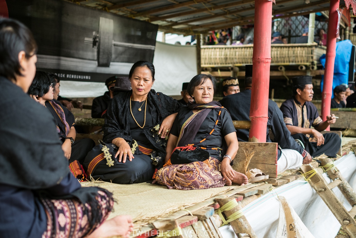 Quelques minutes plus tard la cérémonie commence réellement. Plusieurs processions se mettent en marche vers le bâtiment principal. Les hommes sont habillés en noirs. Beaucoup d’entre-eux sont vêtus d’un sarong qu’ils utilisent pour couvrir leurs jambes et portent un chapeau traditionnel. Pour les femmes je remarque qu’il y a deux tenues différentes. Certaines sont vêtues d’une tenue traditionnelle noire avec quelques broderies aux teintes rouges/orangées : ce sont les membres de la famille directe et leurs proches. Les autres femmes, habillées en longues jupes noires et en hauts oranges, connaissaient également la défunte mais n’entretenaient pas de relations aussi étroites avec elle. Celles-ci, souvent des cousines ou des voisines, veillent à ce que les autres invités ne manquent de rien. Elles aident notamment à servir les repas et les boissons. Les fillettes et les jeunes femmes sont magnifiques. Elles sont vêtues de tenues noires ou rouges ornées par des bijoux de perles. Enfin les invités qui n’ont pas de tenues spéciales sont des personnes plus éloignées de la famille.