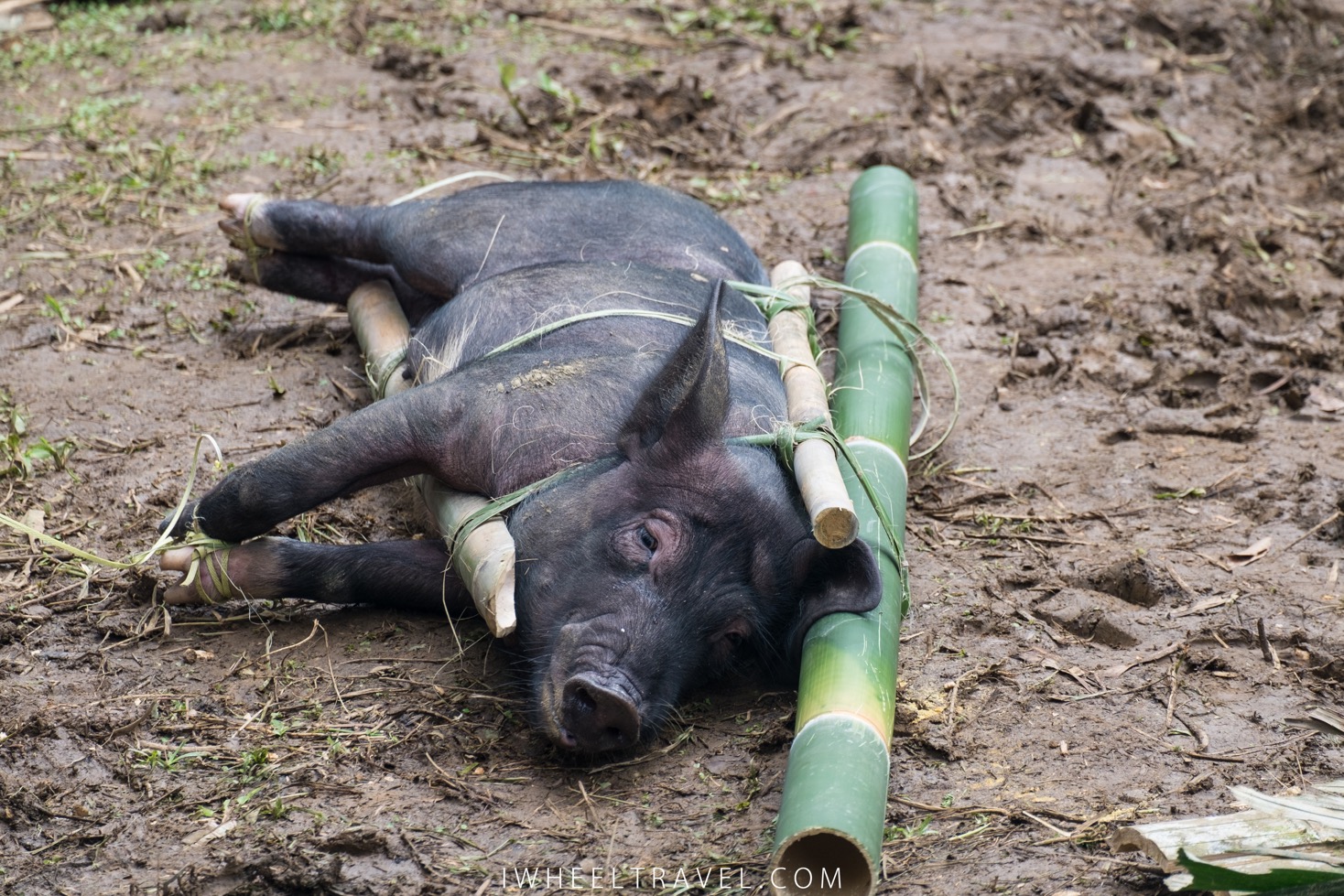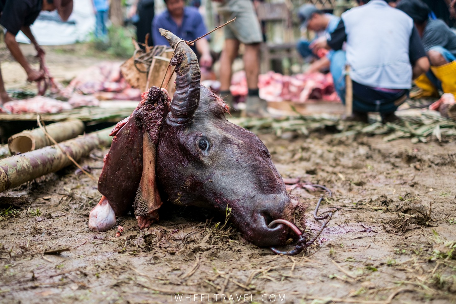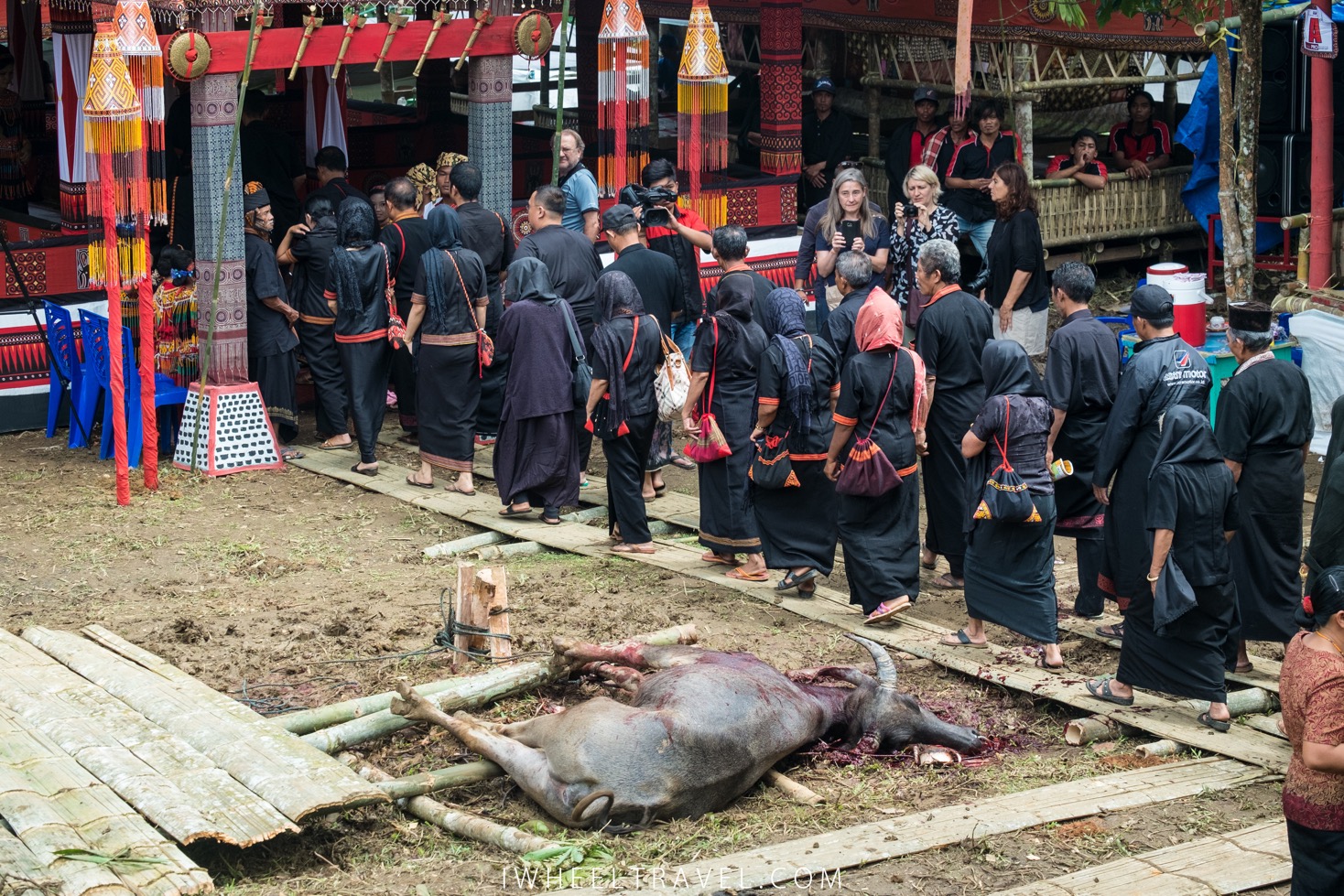 En milieu de matinée le buffle est amené et attaché au centre de l’espace de cérémonie. Les touristes sont maintenant plus silencieux. Tout le monde a compris que ce buffle sera sacrifié quelques minutes plus tard. Un couple de touristes cachent les yeux de leur enfant. Cela fait rire quelques locaux : les enfants d’ici regardent la scène et ne sont pas choqués.