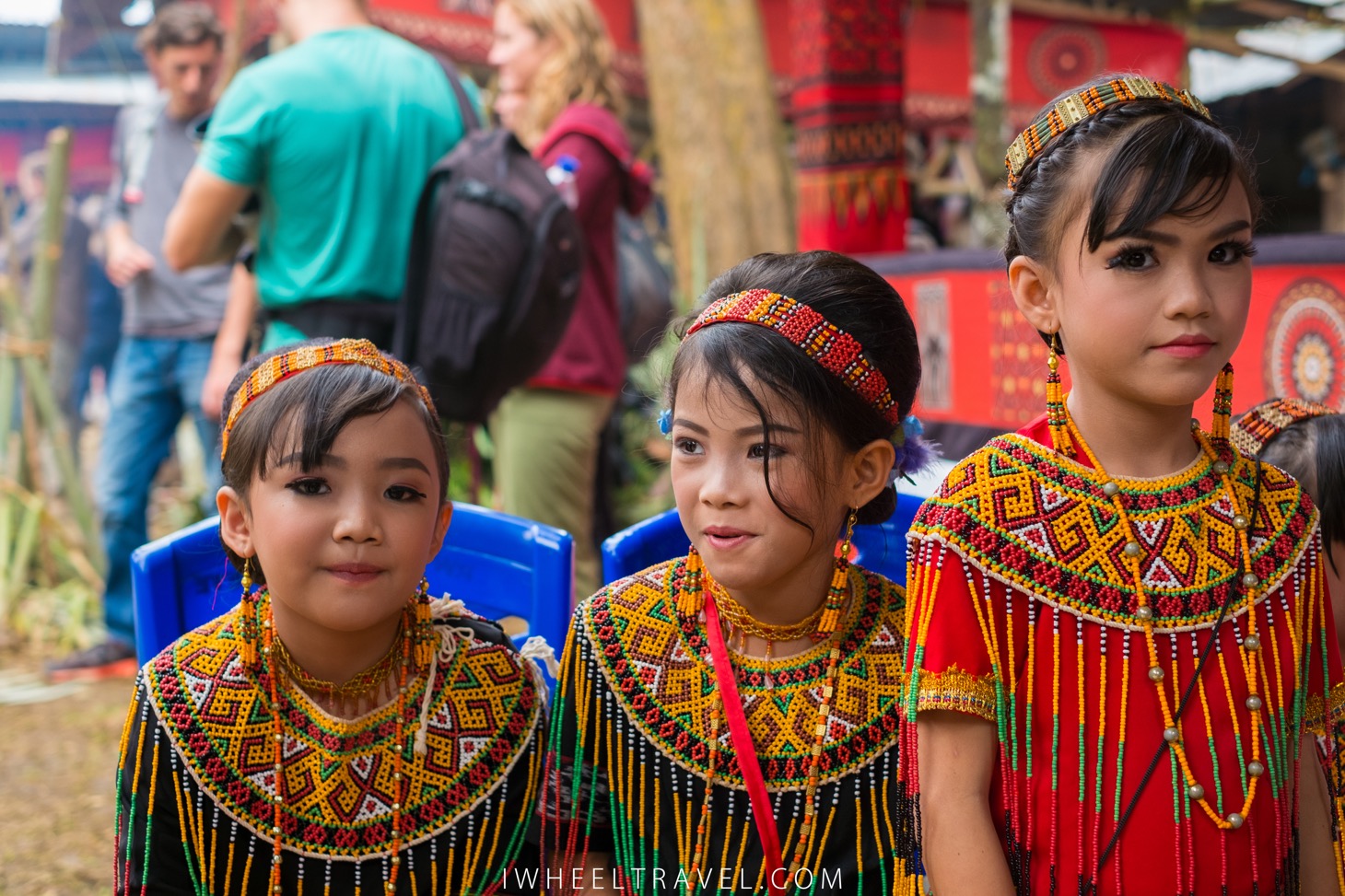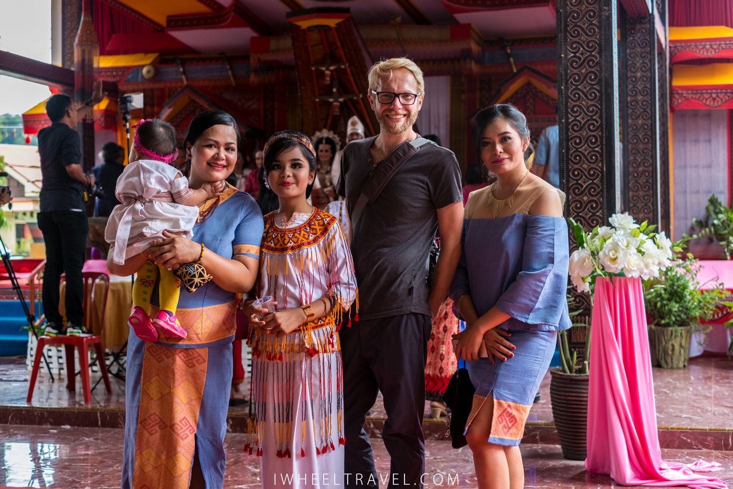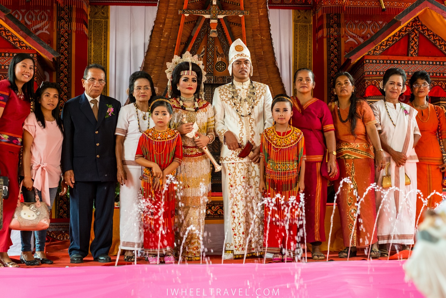 Contrairement à la cérémonie funéraire, pour le mariage il n’y a pas de constructions temporaires. Les invités sont assis sous les tongkonans ou par terre sous des chapiteaux. Les habits traditionnels sont les mêmes, en version blanche plutôt que noire. Les tenues des mariés sont impressionnantes. Ils sont couverts de broderies dorées et de bijoux.