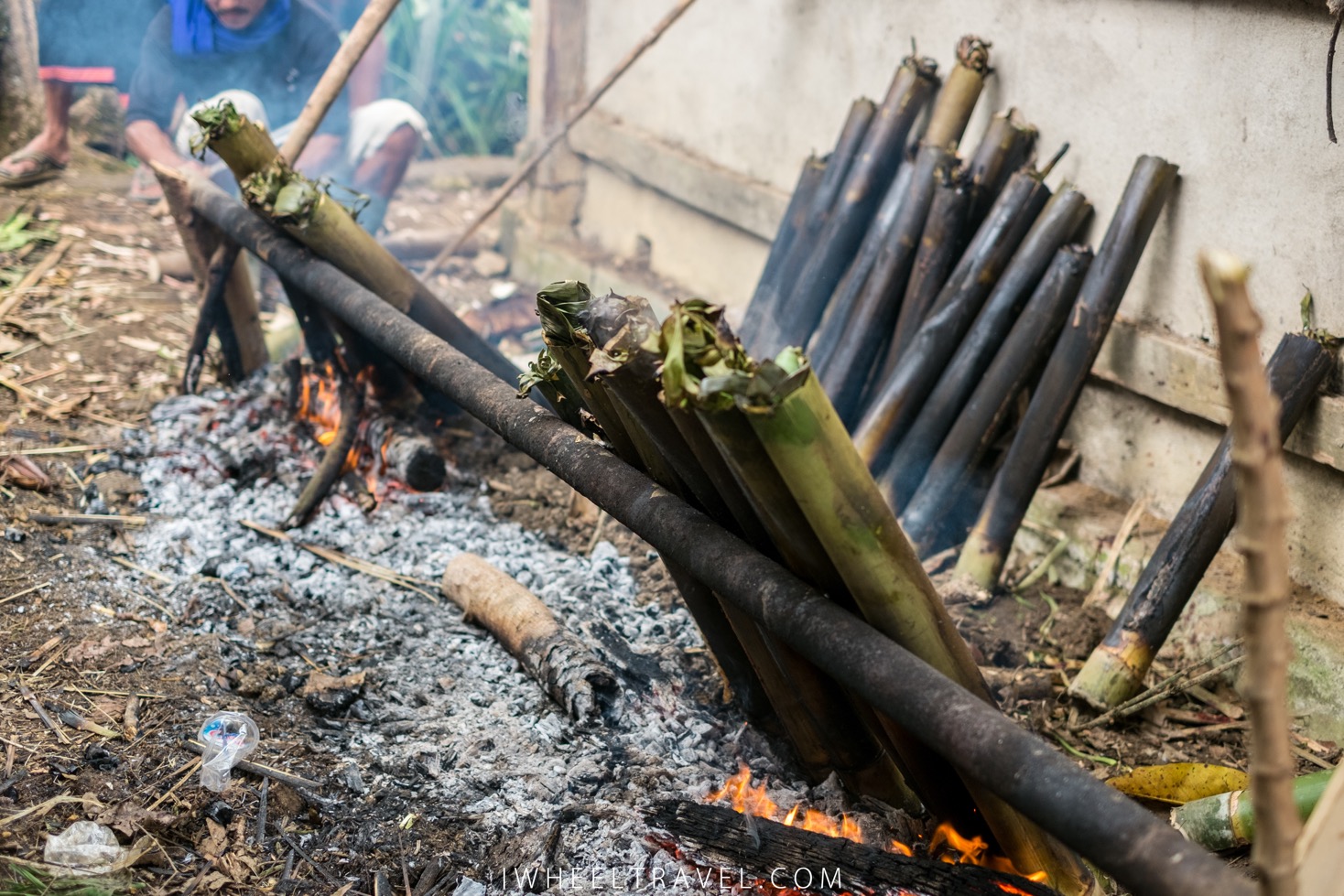 Lorsque le sermon du prêtre se termine la famille du défunt vient nous offrir un thé avec des gourmandises dont des deppa tori, des morceaux de gâteau à la banane et des chips de bananes. Un peu plus tard on nous offrira même le plat traditionnel toraja : le pa’piong, plat à base de cochon, cuit dans des bambous. Toute la matinée nous verrons des cochons, ficelés à des bambous, prendre la direction des cuisines avant d’être éviscérés et passés au lance-flamme avant d’être cuits.