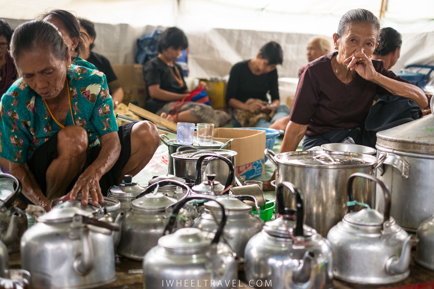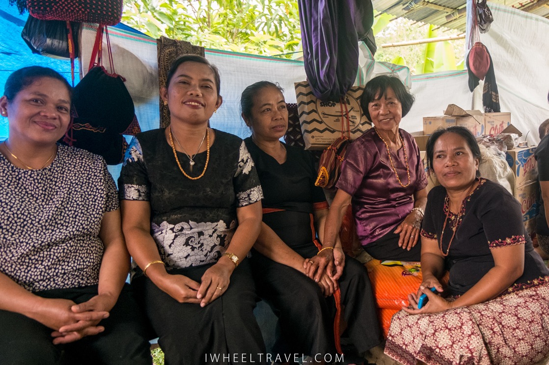 Après avoir repris nos esprits notre guide nous amène dans les cuisines pour nous faire découvrir l’envers du décor. Ici il n’y a que des femmes. Les hommes ne cuisinent pas. Ils ont aidé avant la cérémonie à construction des bâtiments temporaires en bambous. Ces femmes parlent très peu anglais donc il est assez difficile de communiquer mais elles ont l’air contentes de nous rencontrer et sont ravies de nous apprendre quelques mots en langage Toraja.