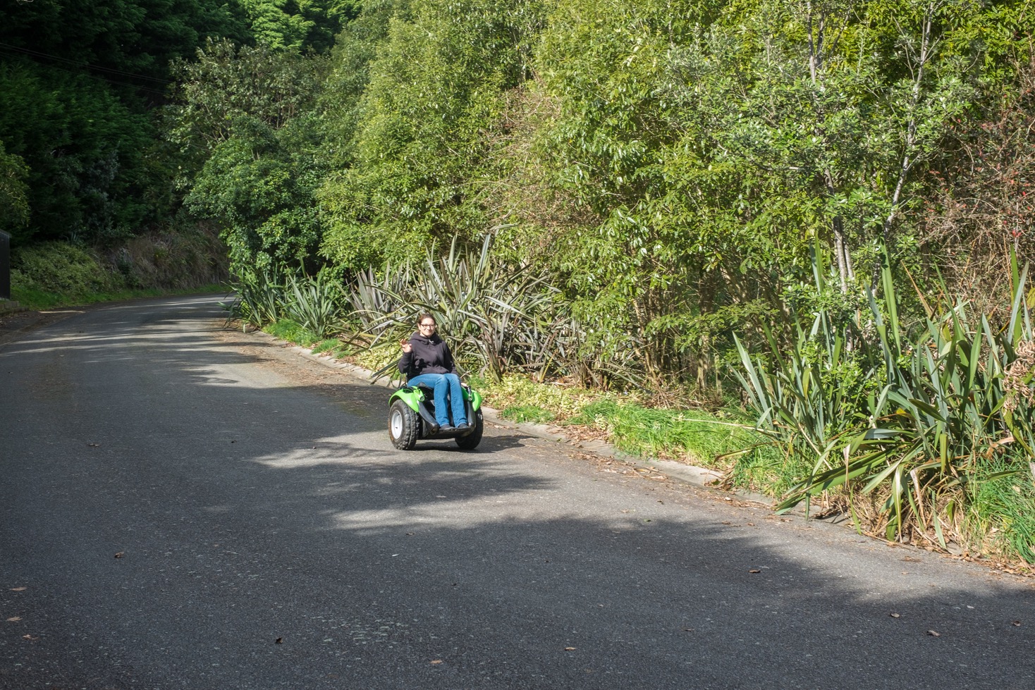 Plus l’inclinaison est forte plus le fauteuil roulant va vite. Il peut aller jusqu’à 20km/h et affronte sans problème les montées raides. Oui, oui : même celle que je regarde avec effroi en Nouvelle-Zélande avant de faire demi-tour ! Les descentes abruptes sont plus agréables également car l’assise reste horizontale. Du coup la peur que l’on peut avoir dans les fortes descentes, du fait de la forte inclinaison du fauteuil et de notre corps, disparait !