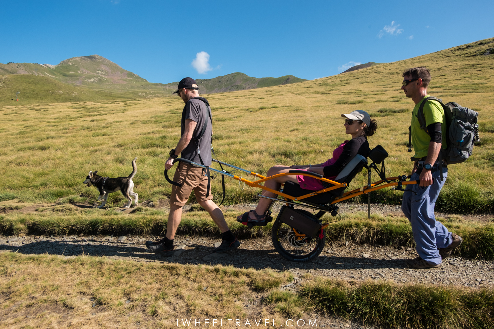 Avant mon séjour dans les Hautes-Pyrénées, j’avais déjà entendu parler plusieurs fois de la joëlette, un fauteuil de randonnée pour les personnes à mobilité réduite, mais je n’en avais jamais fait. J’avais donc hâte de tester ce matériel et de pouvoir enfin partir en randonnée avec mes proches. Pour cette première fois Franck m’accompagne ainsi qu’Aurélien et Hélène, que nous avons rencontrés sur place. Sans oublier leur tout jeune husky (4 mois), très heureux d’aller se dégourdir les pattes en altitude ! Côté équipement, nous avons la chance d’avoir une joëlette avec assistance électrique. Une aide qui s’est avérée indispensable pour arriver à progresser dans certains passages accidentés du sentier.