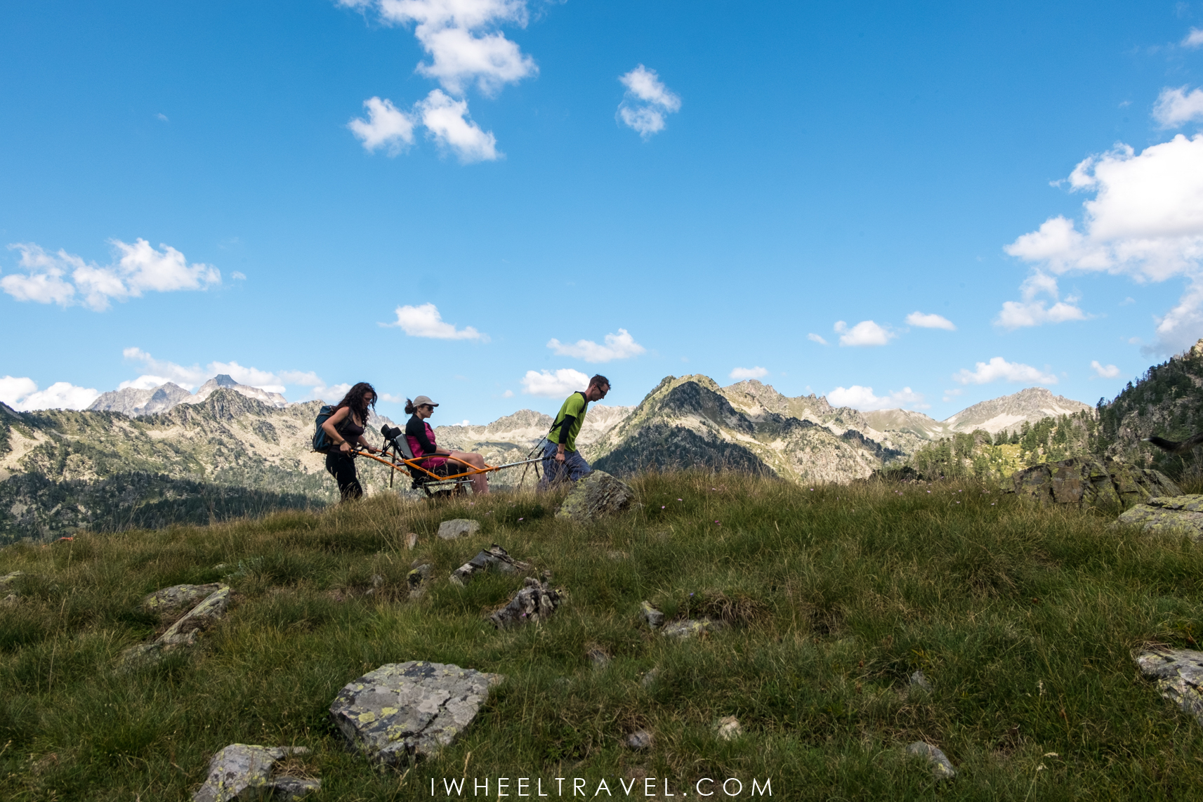 Au fur et à mesure que nous progressions dans cette randonnée, j’ai réalisé la chance que j’avais d’être au cœur des montagnes, à profiter de paysages magnifiques. Déjà quand on est valide ce n’est pas tous les jours que l’on peut faire une randonnée en haute montagne mais lorsque que l’on est paraplégique c’est vraiment quelque chose d’exceptionnel. Pouvoir passer plusieurs heures avec d’autres randonneurs à arpenter la montagne est une expérience précieuse lorsque l’on passe ces journées dans un fauteuil roulant. Et quel plaisir d’être à la même hauteur que les autres et de ne pas avoir le nez penché sur mes roues avant à longueur de temps pour éviter les pierres !