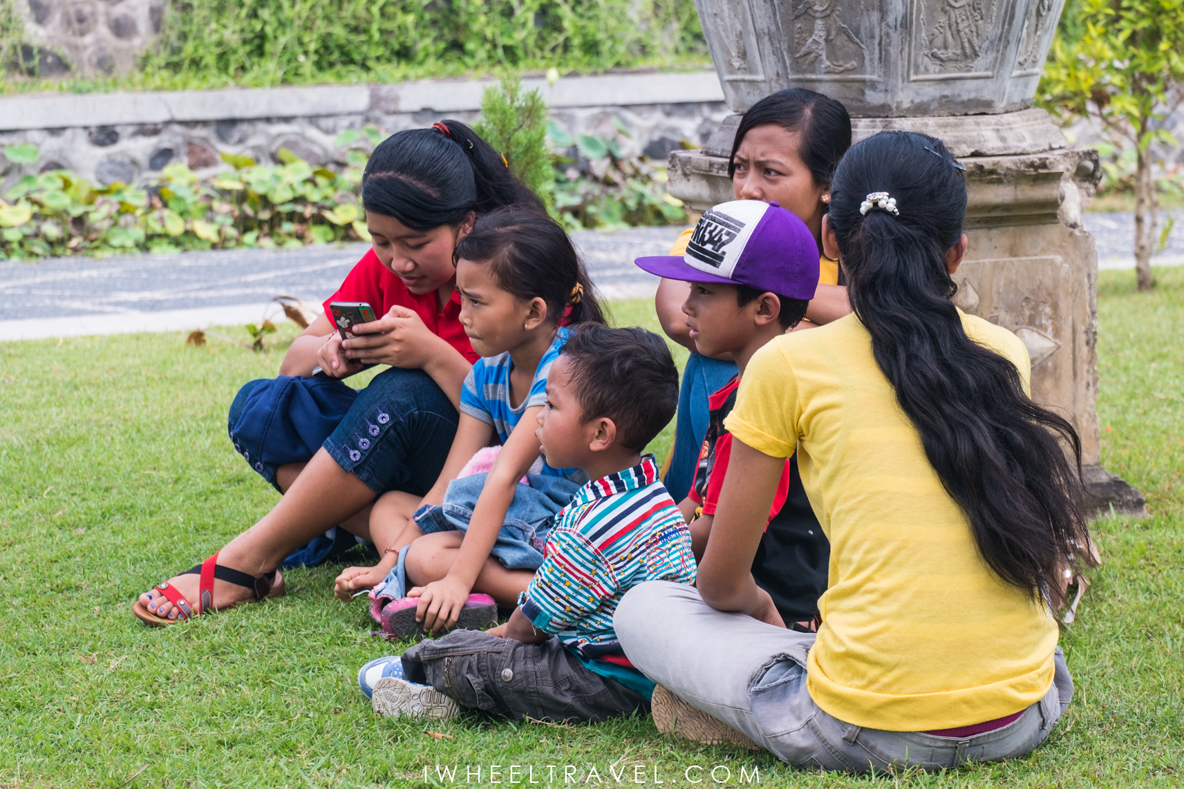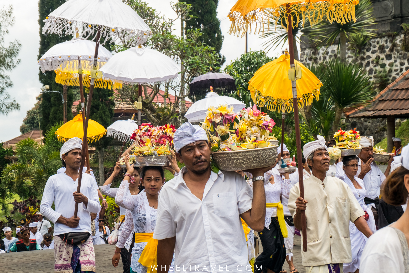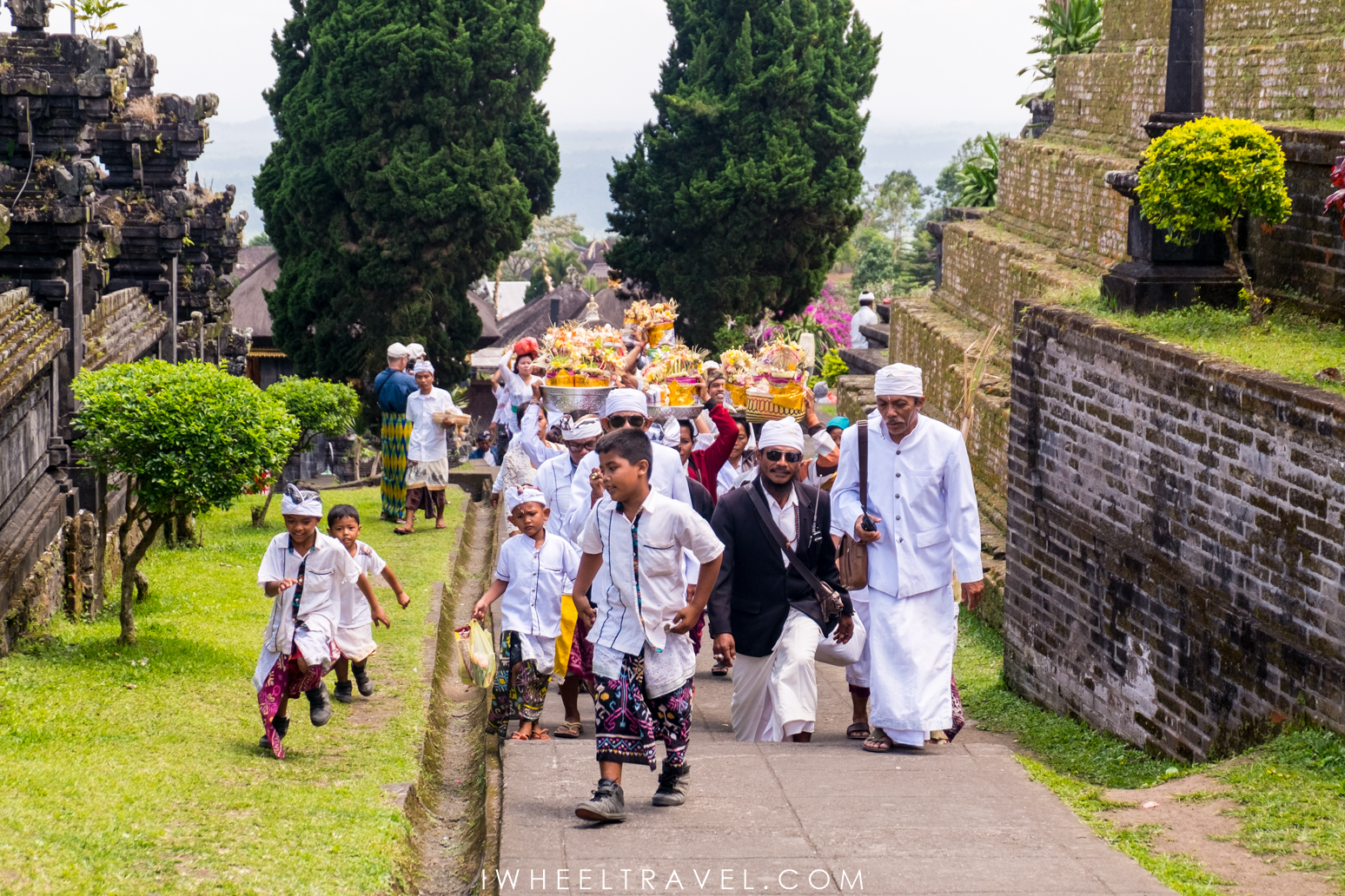 Les nombreuses marches qui mènent au sommet m’ont empêchée d’y parvenir mais ma frustration s’est vite envolée lorsque j’ai aperçu une procession haute en couleur s’approcher de nous. De nombreux Balinais, tous vêtus de blanc et les bras chargés d’offrandes, se dirigeaient vers le sommet. Certains affichaient des visages fermés et pensifs alors que d’autres souriaient pendant que les jeunes enfants couraient en riant. D’après notre guide, il s’agissait d’un enterrement.
