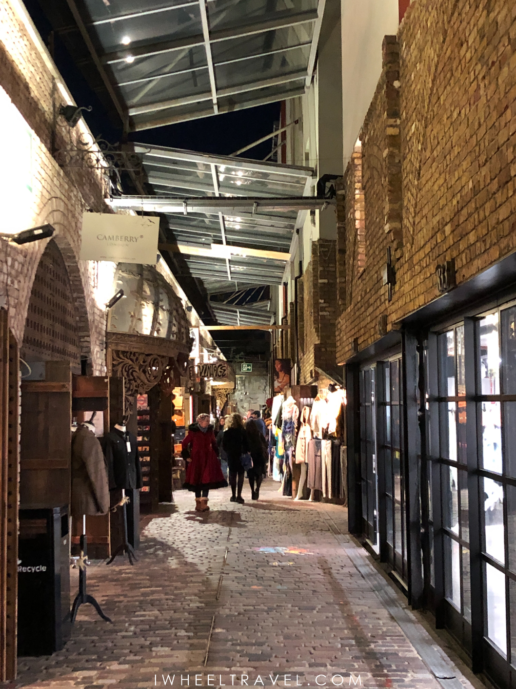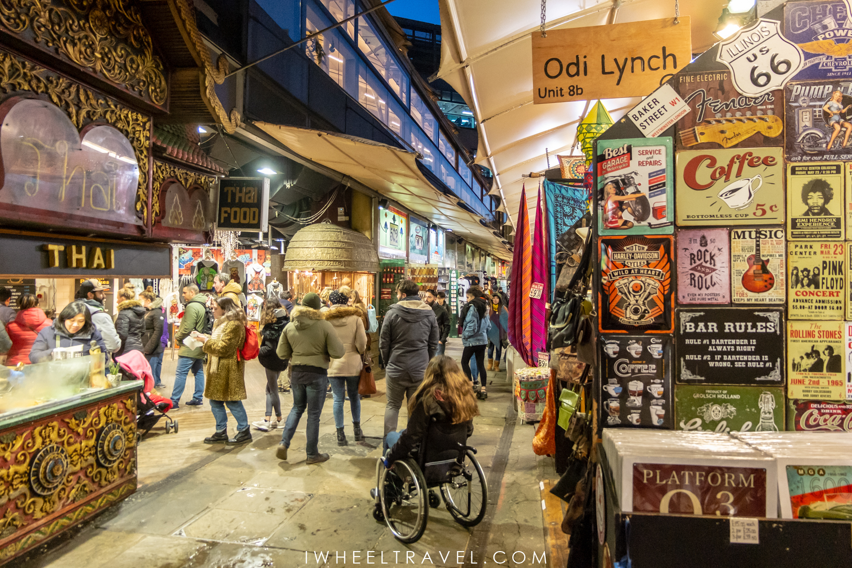 Pour finir cette journée, nous prenons le bus en direction de Camden et descendons à Camden Town Station. Ce quartier est vraiment l’un de mes préférés à Londres. Certes il est un peu plus éloigné du centre de Londres et certaines parties de Camden ne sont pas faciles à visiter en fauteuil roulant mais je suis tombée complètement sous le charme de ce quartier ! Il y a une ambiance punk et alternative que l’on ne retrouve pas ailleurs et que j’adore. En marchant dans les rues de Camden on peut voir des façades de magasins très colorées et décorées de façon surprenantes, entendre du rock dans la rue, déchiffrer de nombreux graffitis, s’égarer dans les petits magasins d’artisanat local installés dans les anciennes étables et découvrir tellement d’autres choses ! Ce quartier un vrai labyrinthe d’instants de vie ! Certaines choses paraissent complètement insensées mais tout semble être parfaitement à sa place au final… Même les robots géants qui gardent l’entrée du magasin de vêtements de science-fiction ! A la fin de notre visite la nuit est déjà tombée et il est temps de rejoindre notre hôtel.
